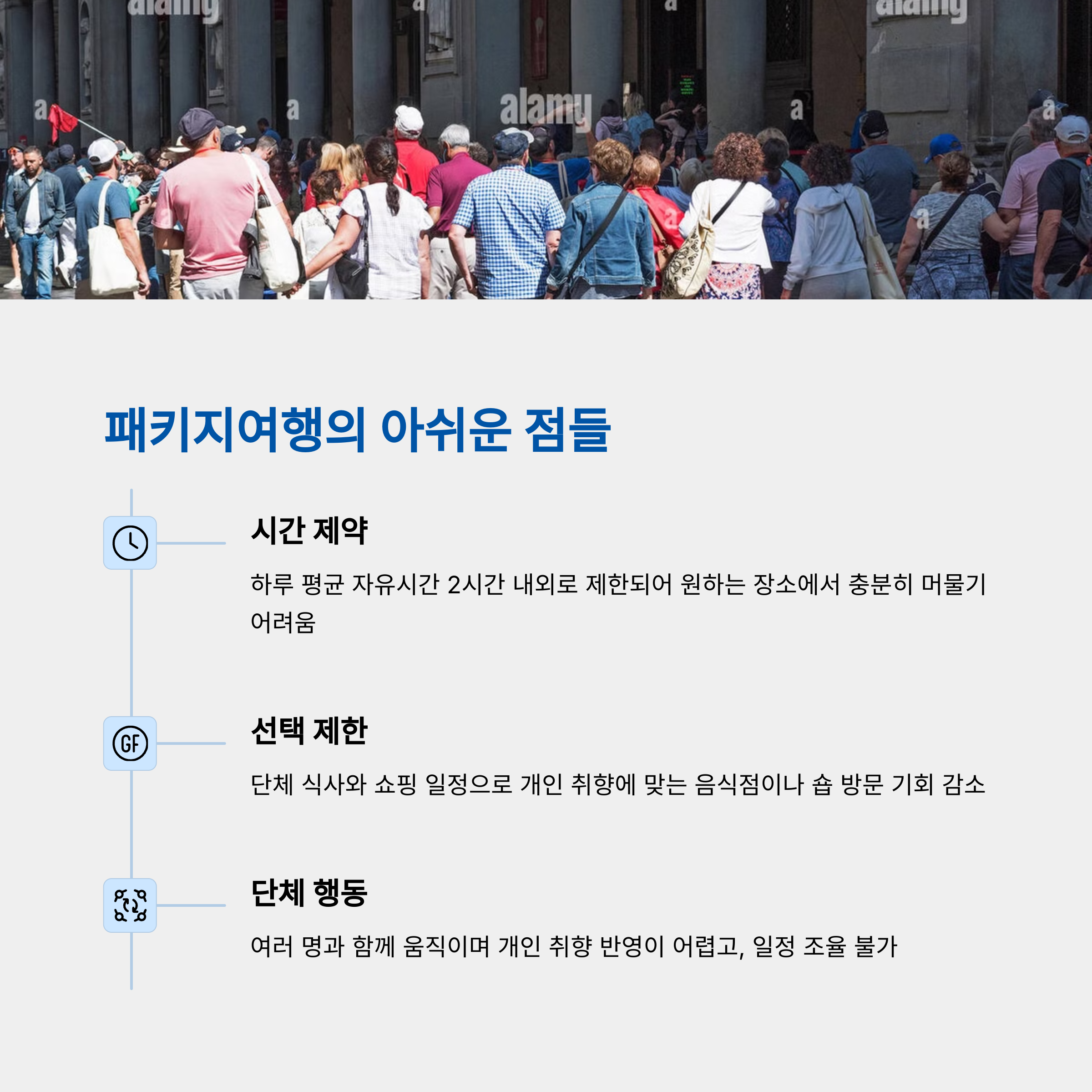 패키지여행은 시간 관리가 철저하게 되어 있기 때문에 여행 기간이 짧거나, 시간이 부족한 사람에게 특히 유리합니다.