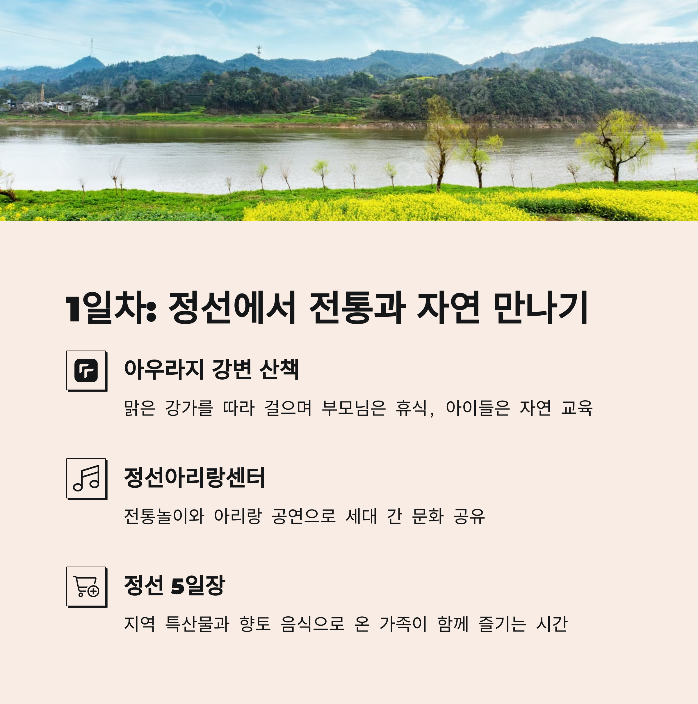 | 정선아리랑센터 | 전통놀이, 아리랑 공연 | 아이들 체험, 어르신 감성 만족 |