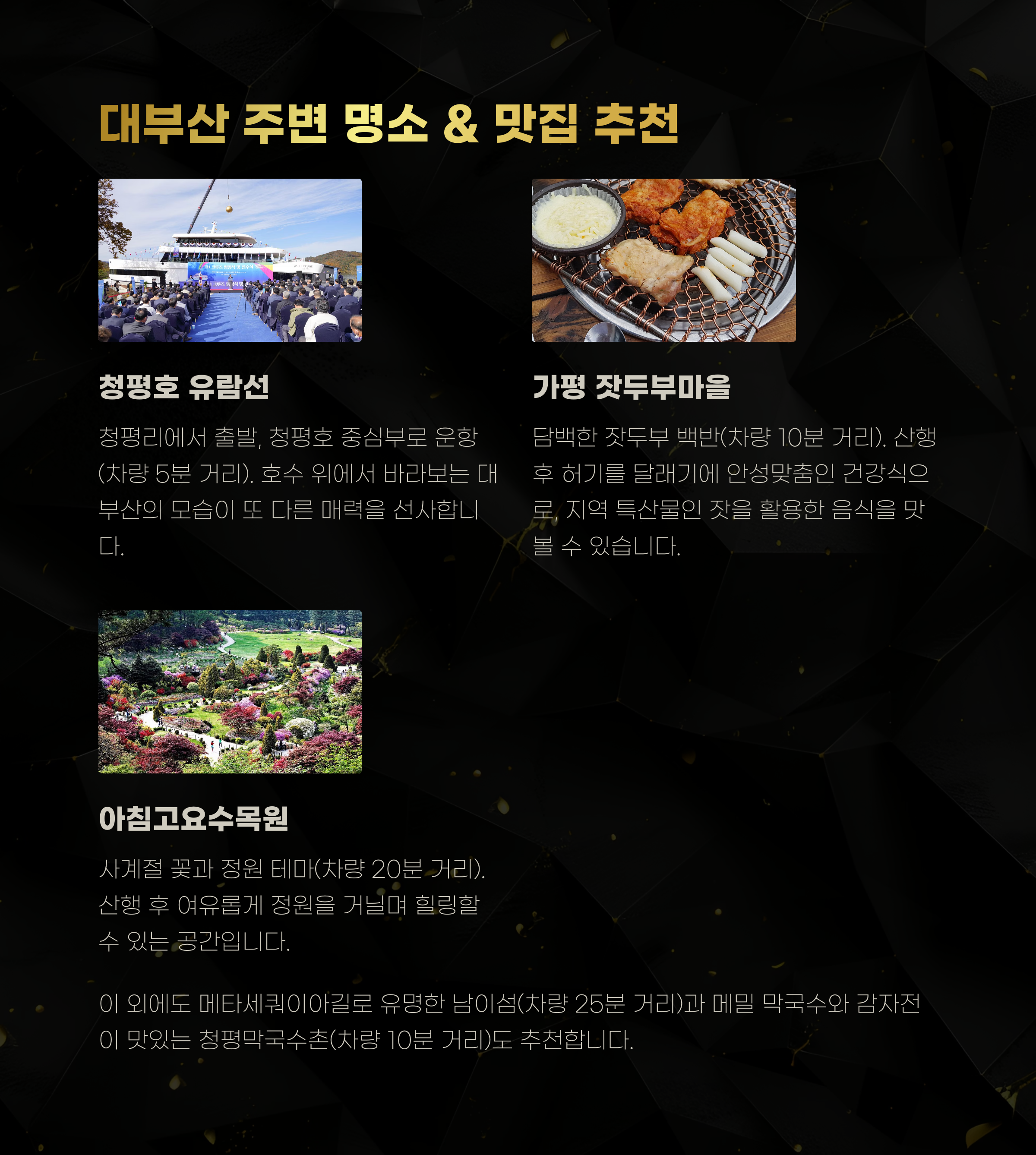 산행 후에는 청평호 유람선, 잣두부 마을, 아침고요수목원 등으로 하루 일정을 알차게 마무리하세요.