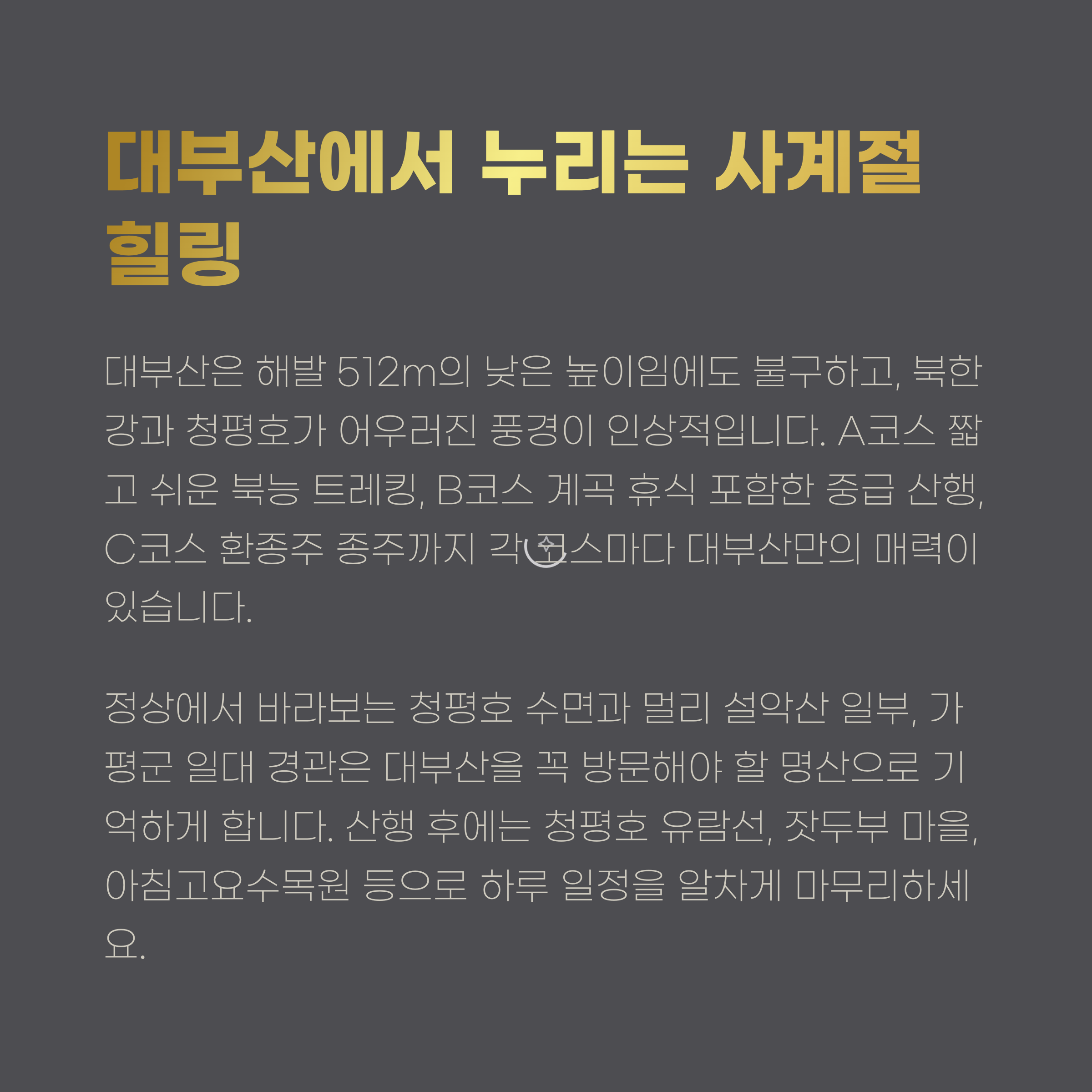 “대부산”은 해발 512m 낮은 높이임에도 불구하고, 북한강과 청평호가 어우러진 풍경이 인상적입니다.