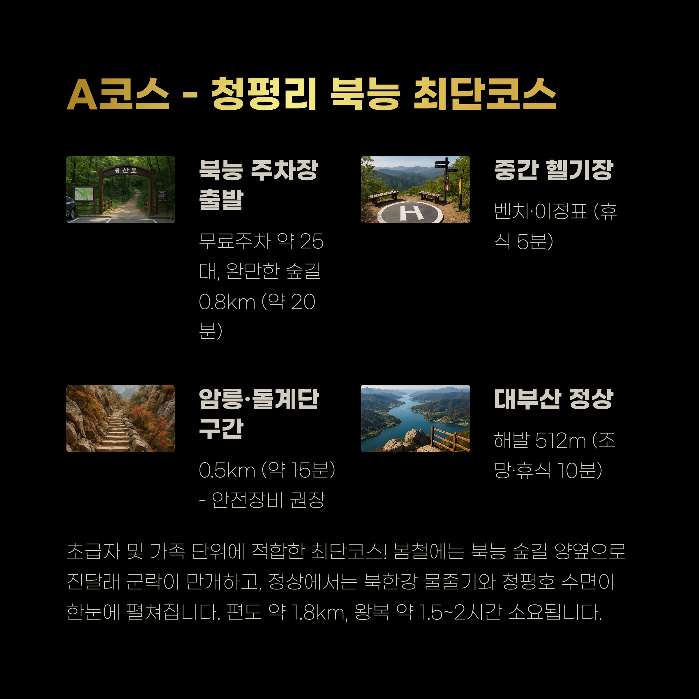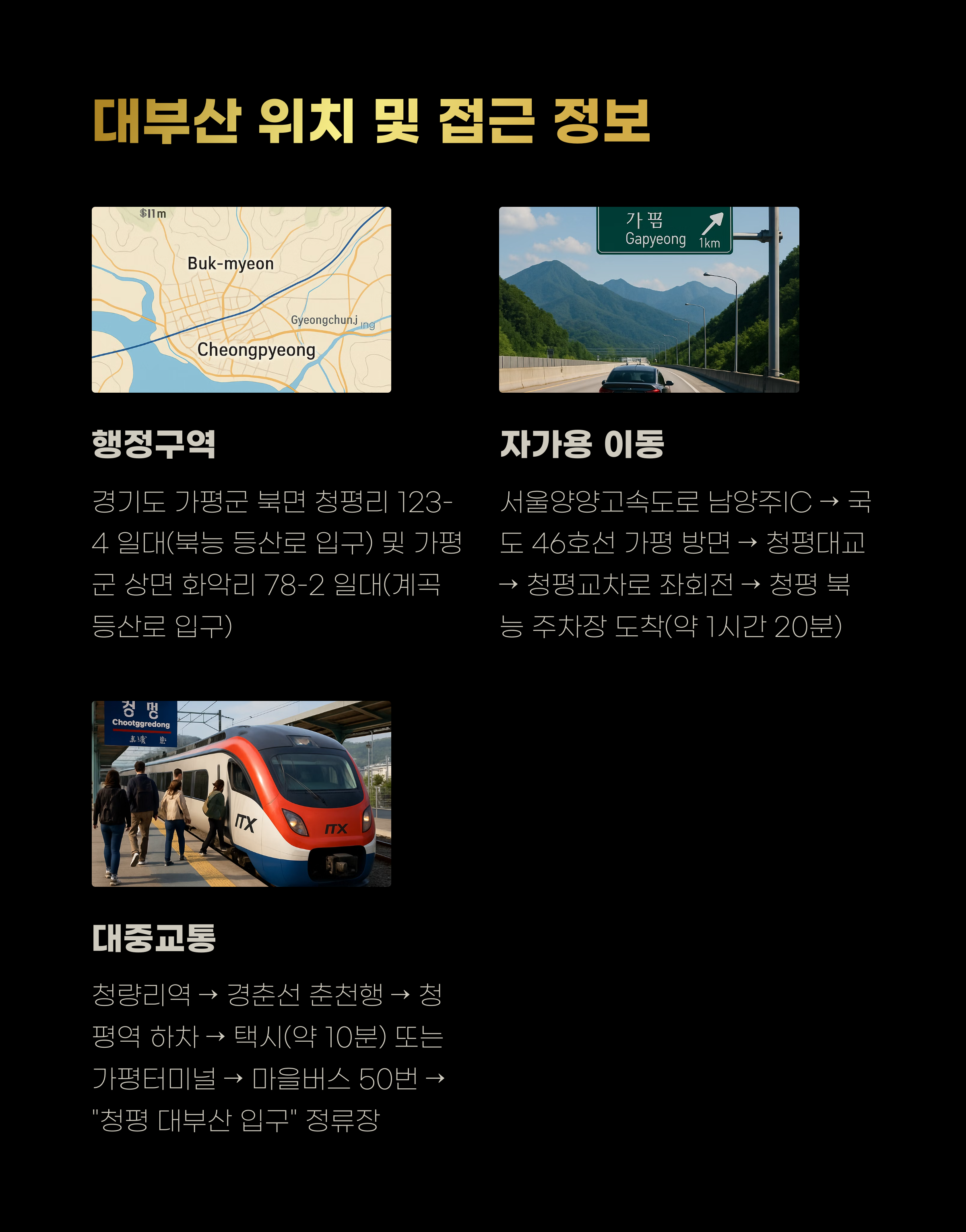 • 네비 입력: “가평 대부산 등산로 입구” 또는 “청평 북능 입구 주차장” / “화악 계곡 입구 주차장”