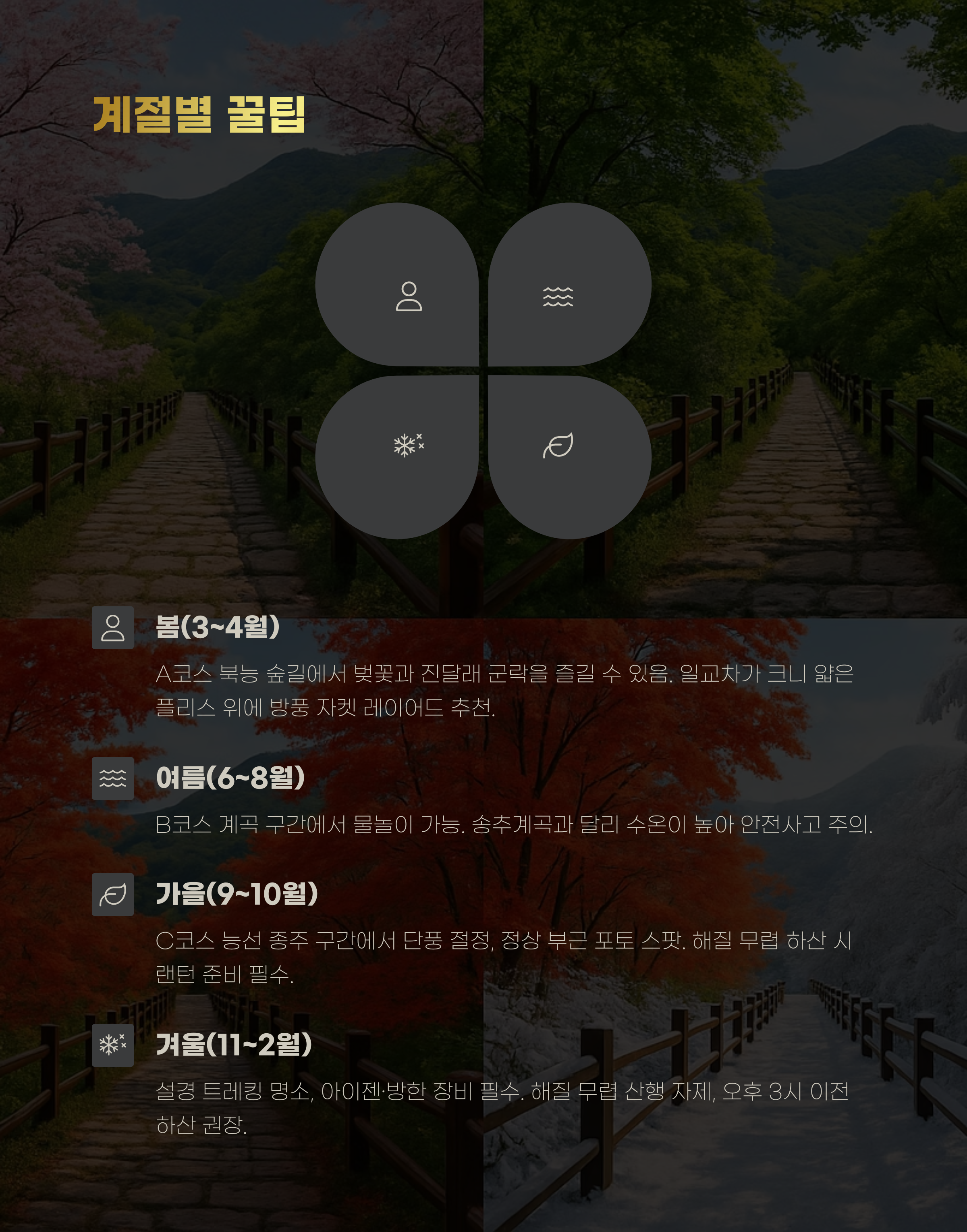 - 중봉·소봉 구간은 소나무 숲과 바위 암릉이 어우러져 사계절 내내 볼거리 제공.