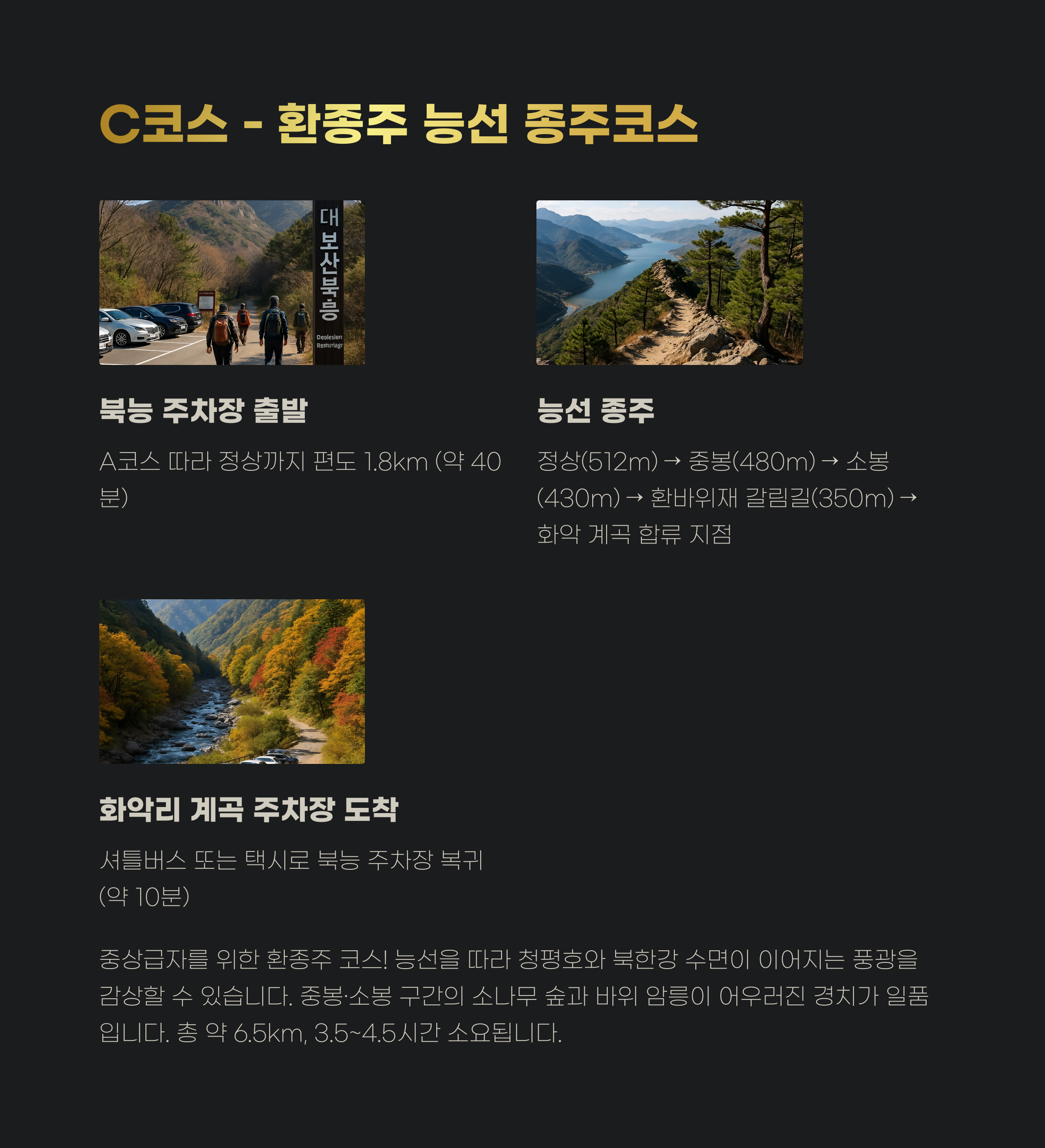 - 하산 후 화악리 주차장에서 북능 주차장 복귀는 지역 택시 이용 권장(1700원 대 금액).