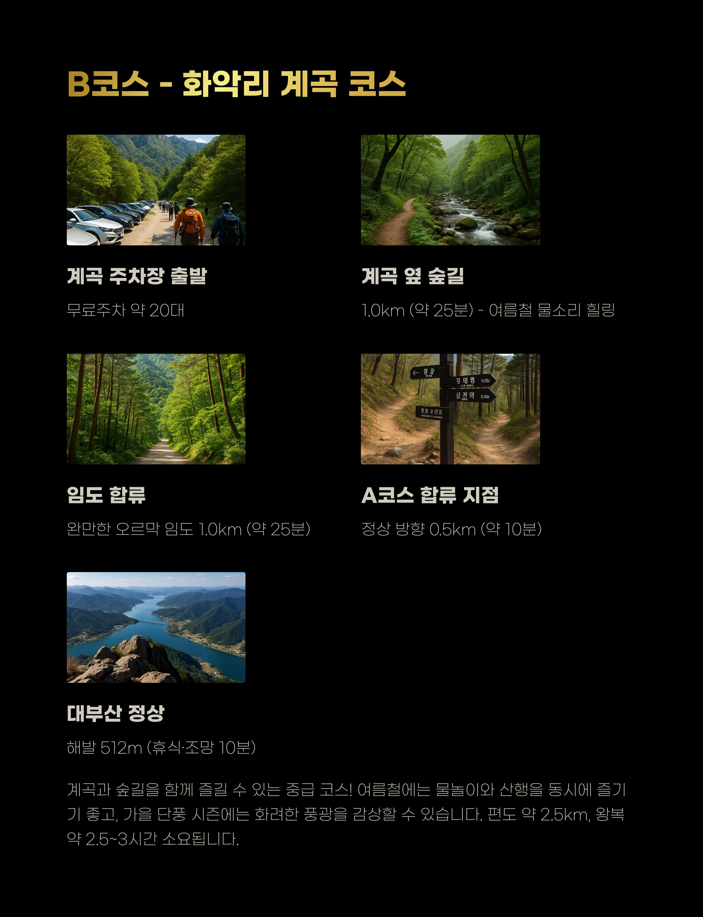 • 포인트: - B코스는 계곡과 숲길을 함께 즐길 수 있어 여름철 물놀이와 산행을 동시에 즐기기 좋음.