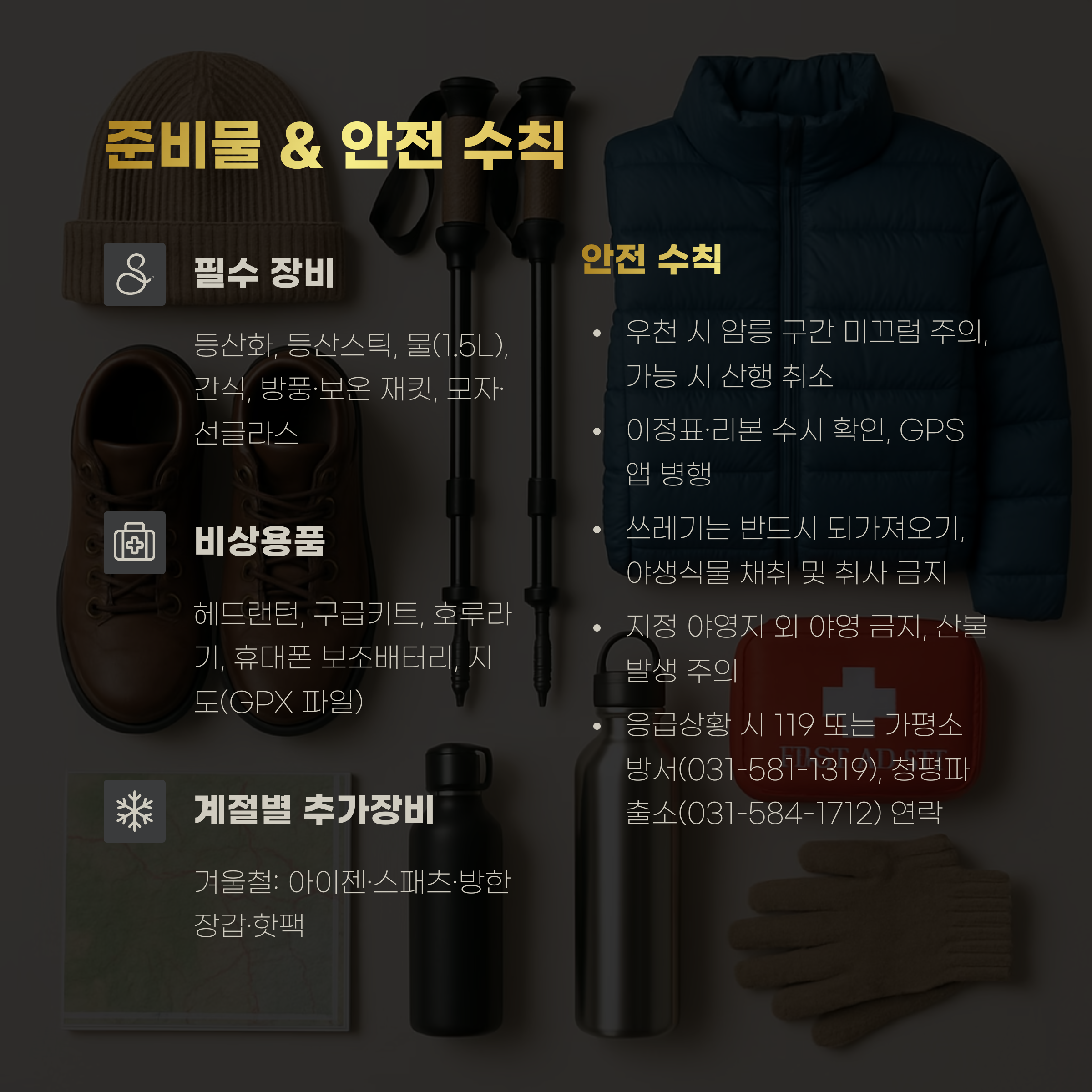 - 비상용품: 헤드랜턴, 구급키트(반창고·소독약), 호루라기, 휴대폰 보조배터리
