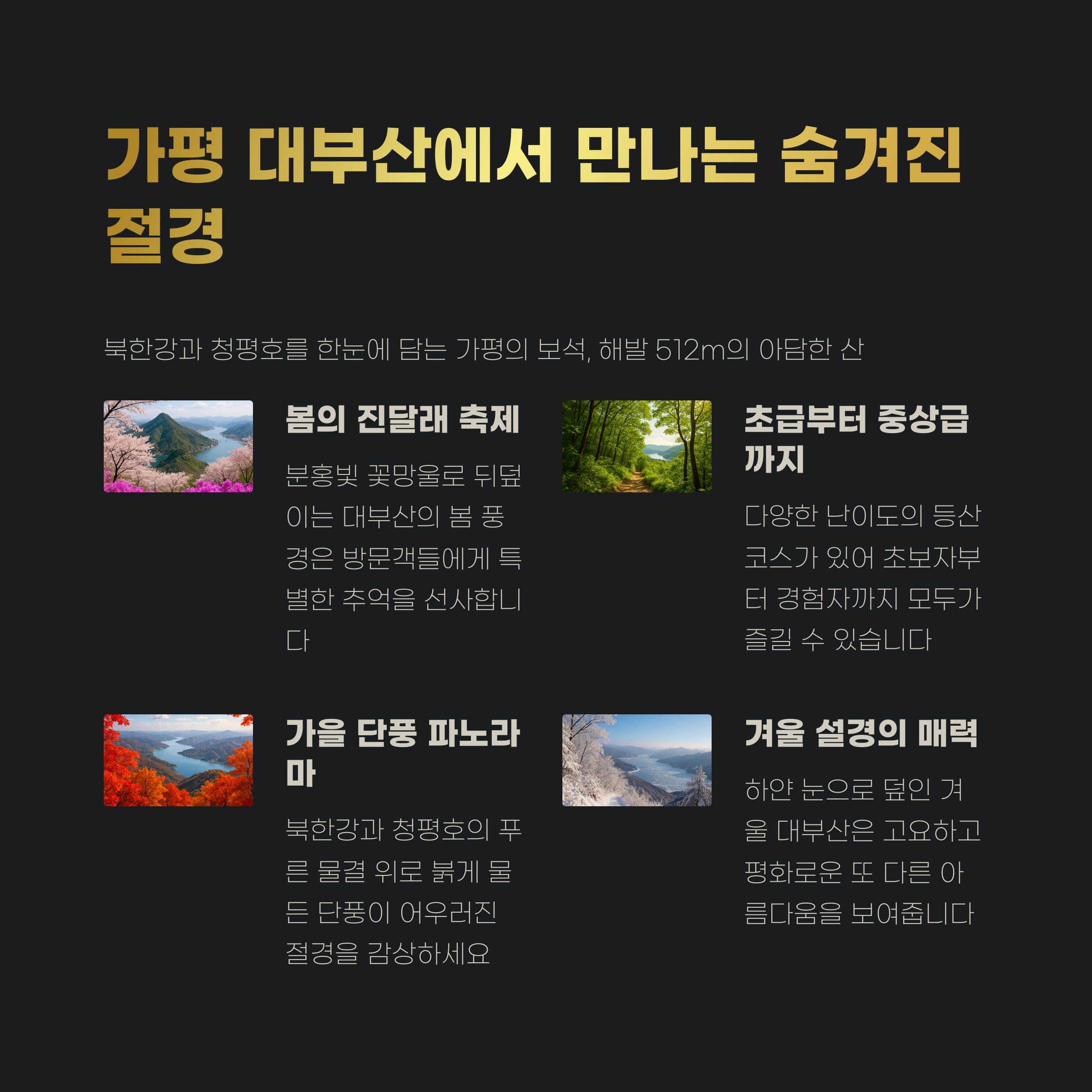 정상에서 바라보는 청평호 수면과 멀리 설악산 일부, 가평군 일대 경관은 “대부산”을 꼭 방문해야 할 명산으로 기억하게 합니다.
