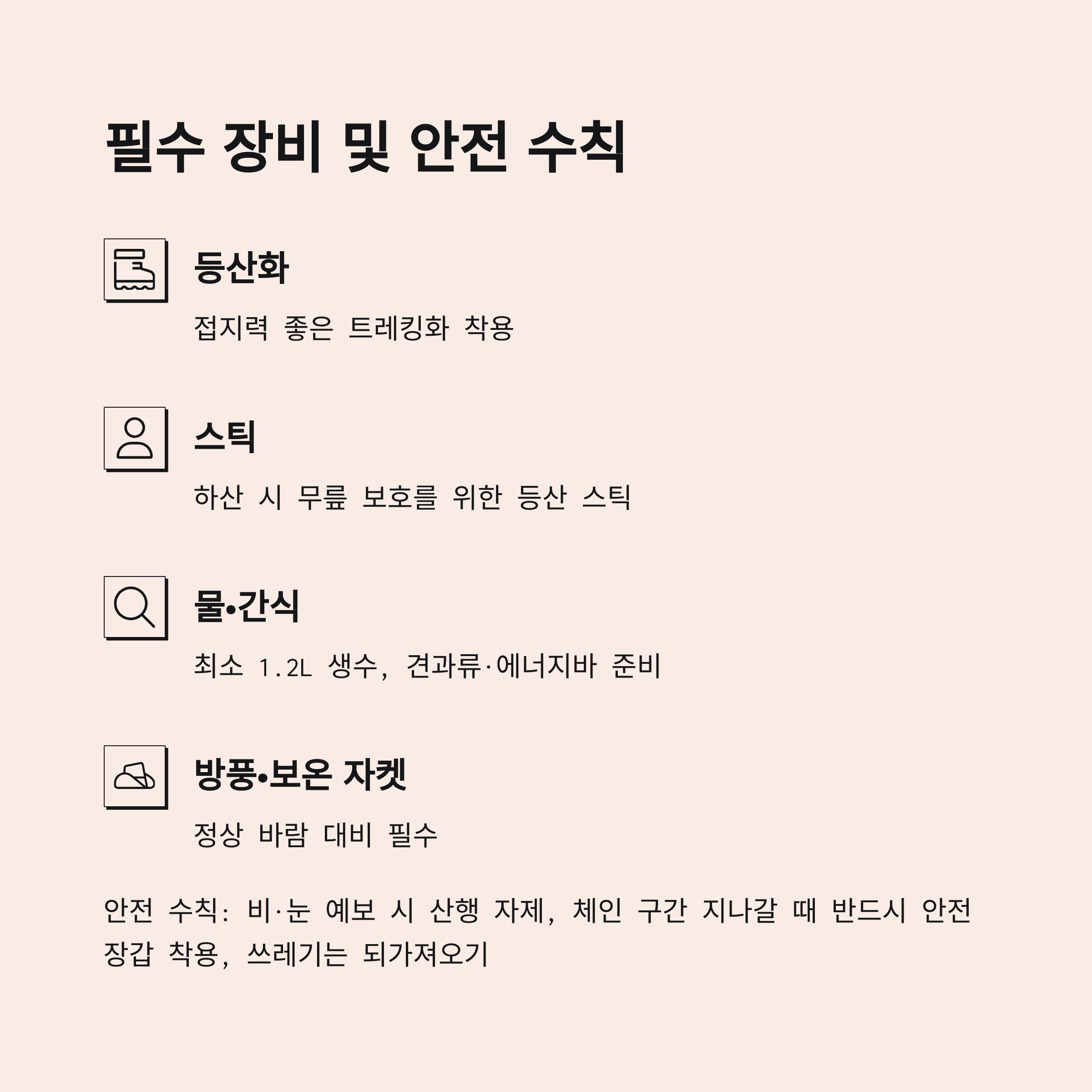 - 물·간식: 최소 1.2L 생수, 견과류·에너지바