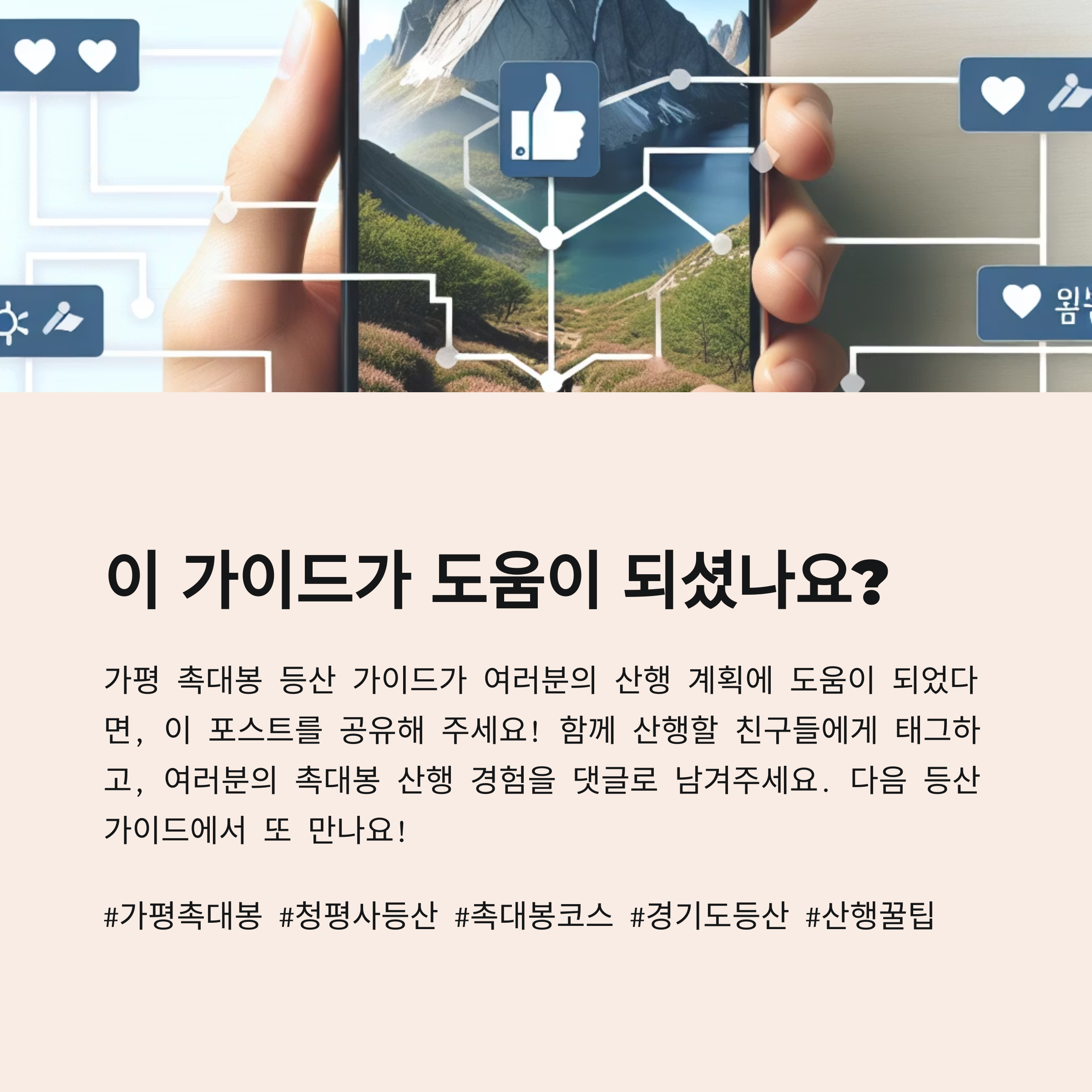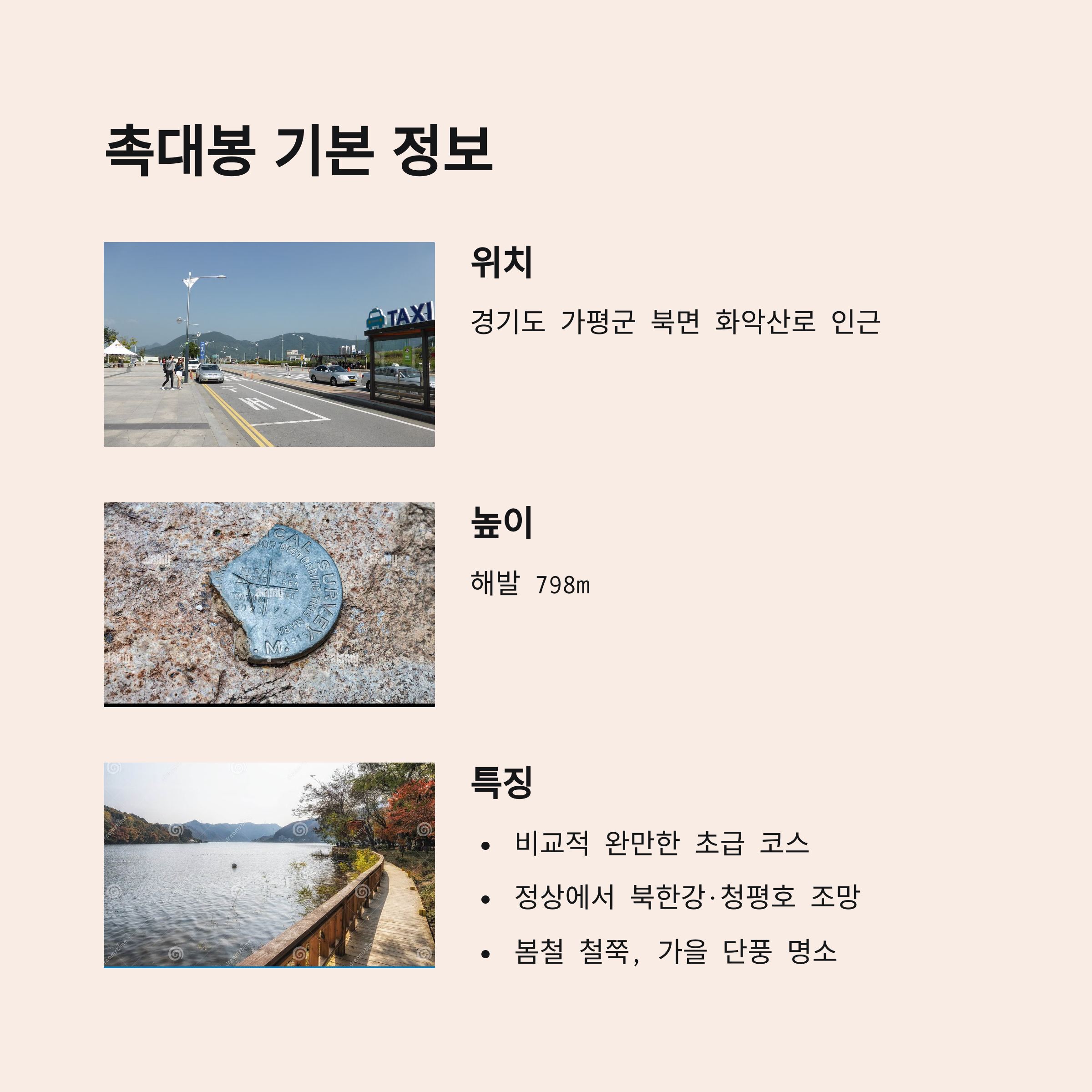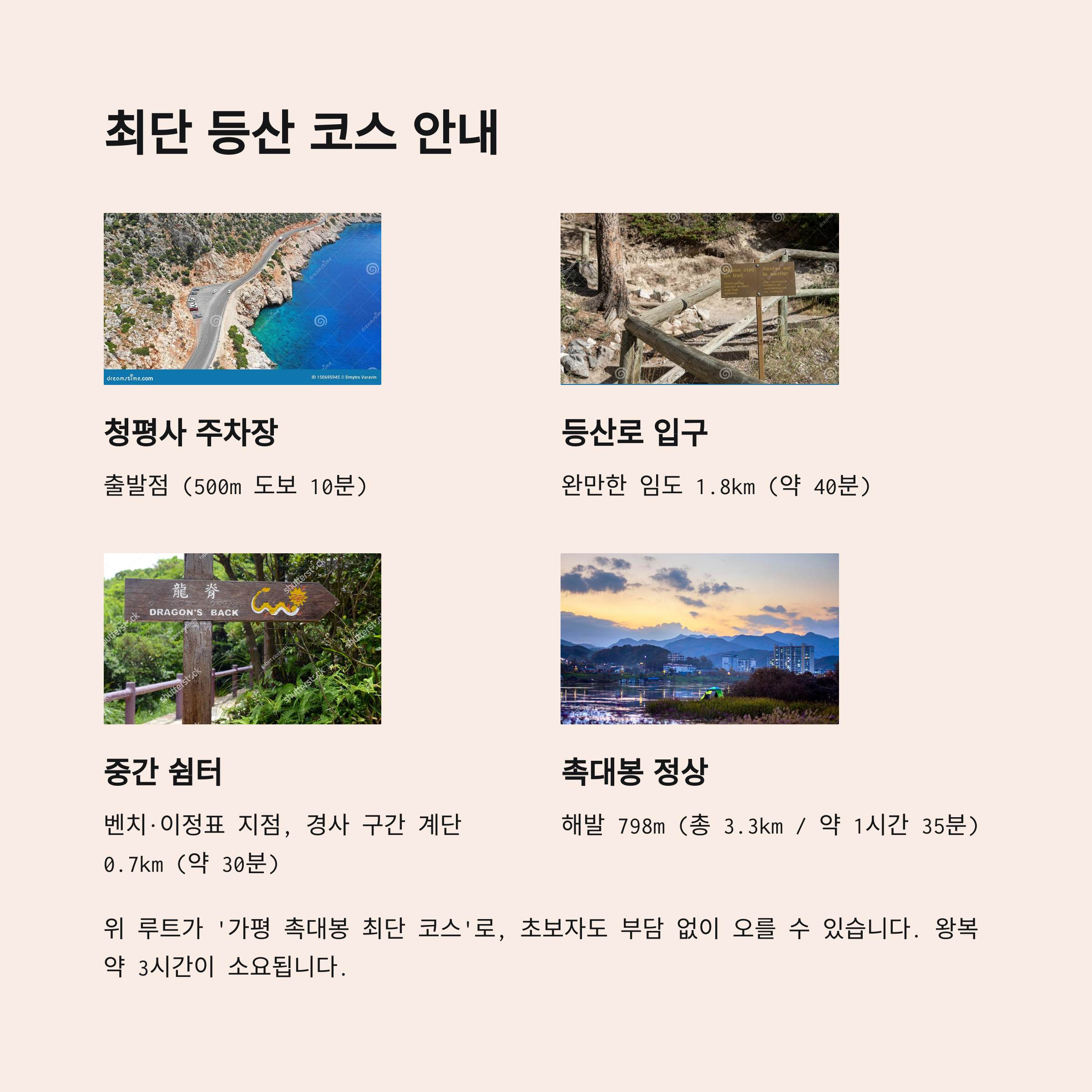 - 위 루트가 ‘가평 촉대봉 최단 코스’로, 초보자도 부담 없이 오를 수 있습니다.