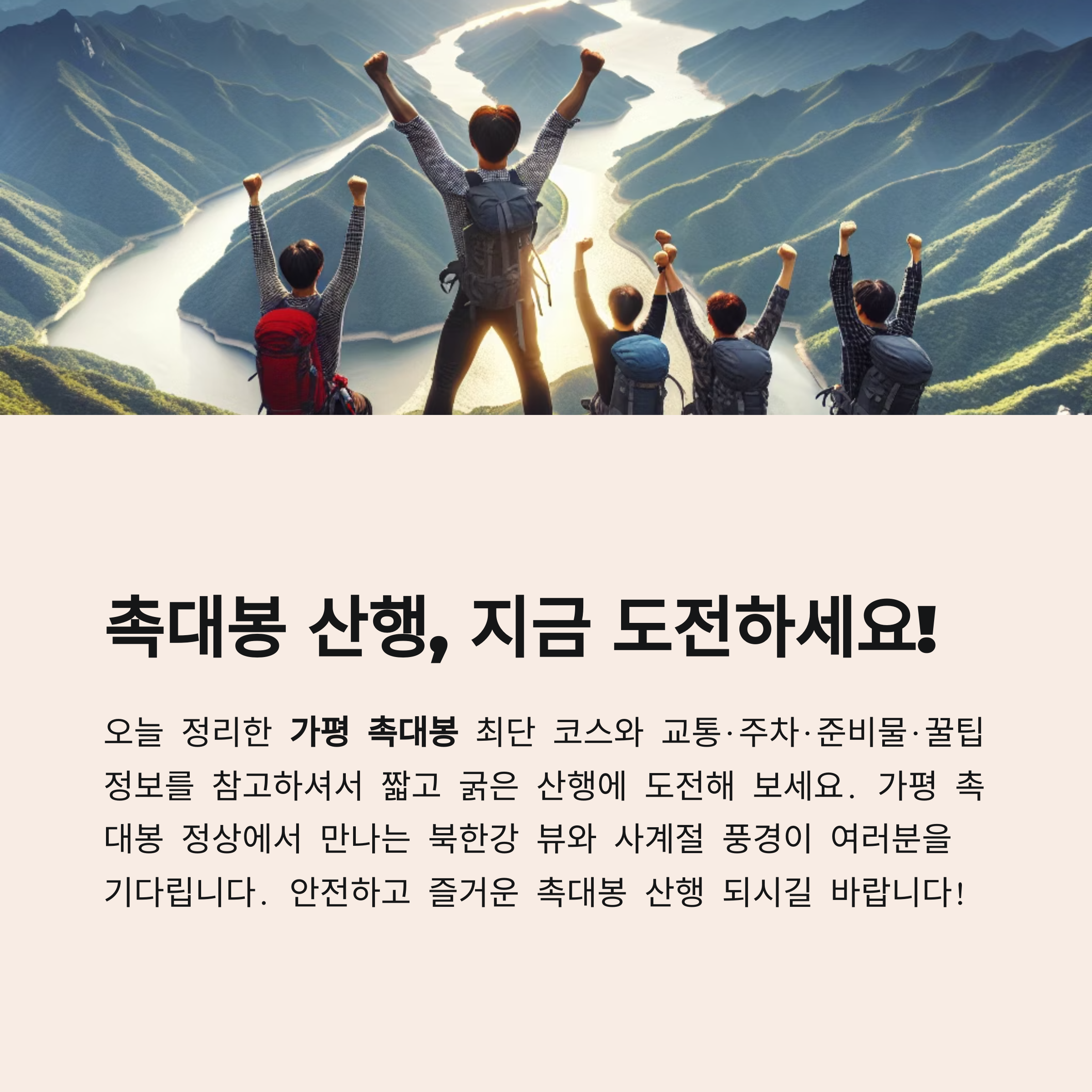 오늘 정리한 가평 촉대봉 최단 코스와 교통·주차·준비물·꿀팁 정보를 참고하셔서 짧고 굵은 산행에 도전해 보세요.