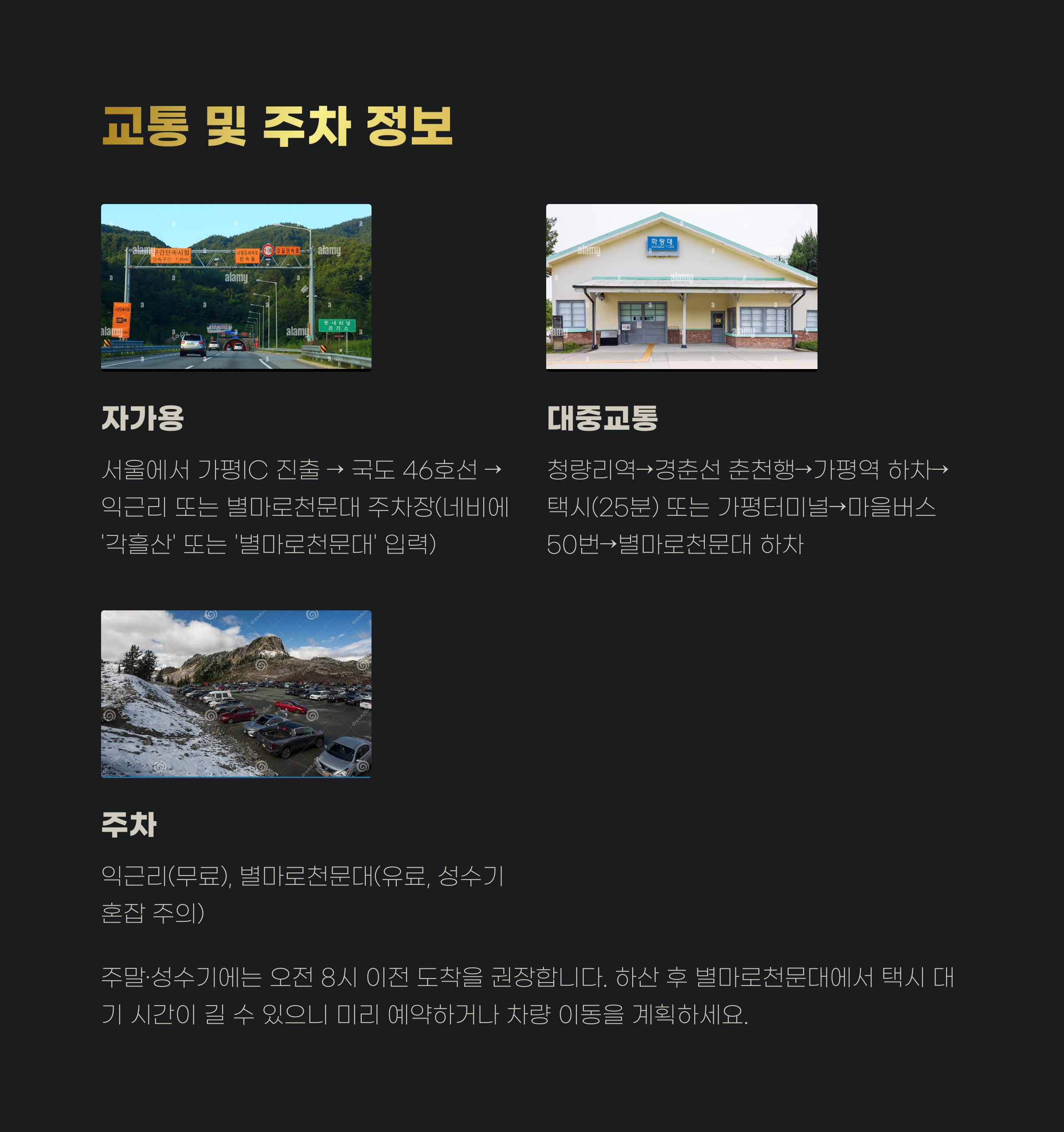 - 대중교통: 청량리역→경춘선 춘천행→가평역 하차→택시(25분) 또는 가평터미널→마을버스 50번→별마로천문대 하차