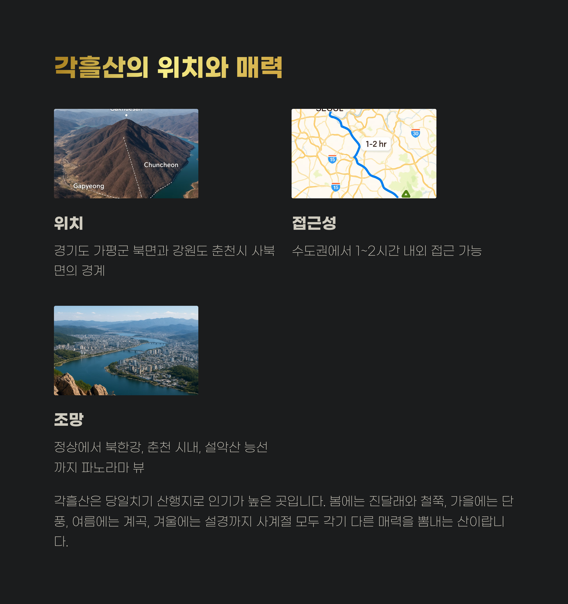 각흘산은 경기도 가평군 북면과 강원도 춘천시 사북면의 경계에 자리잡고 있습니다. 수도권에서 1~2시간 내외로 접근 가능해 당일치기 산행지로 인기가 높죠. 정상에서는 북한강과 춘천 시내, 멀리 설악산 능선까지 파노라마 조망이 가능해 사계절 내내 많은 등산객이 찾는 곳입니다.