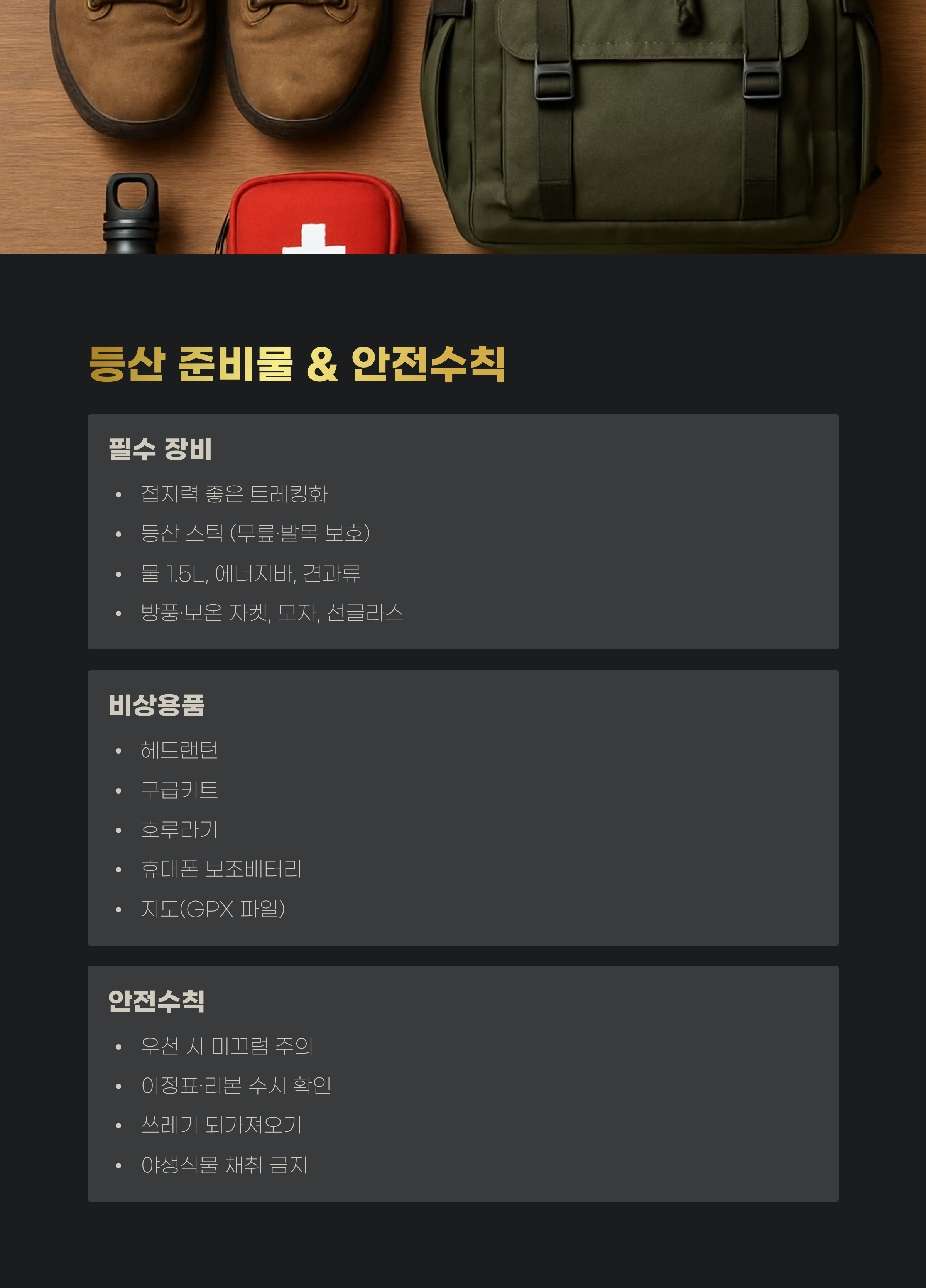 - 안전수칙: 우천 시 미끄럼 주의, 이정표·리본 수시 확인, 쓰레기 되가져오기, 야생식물 채취 금지