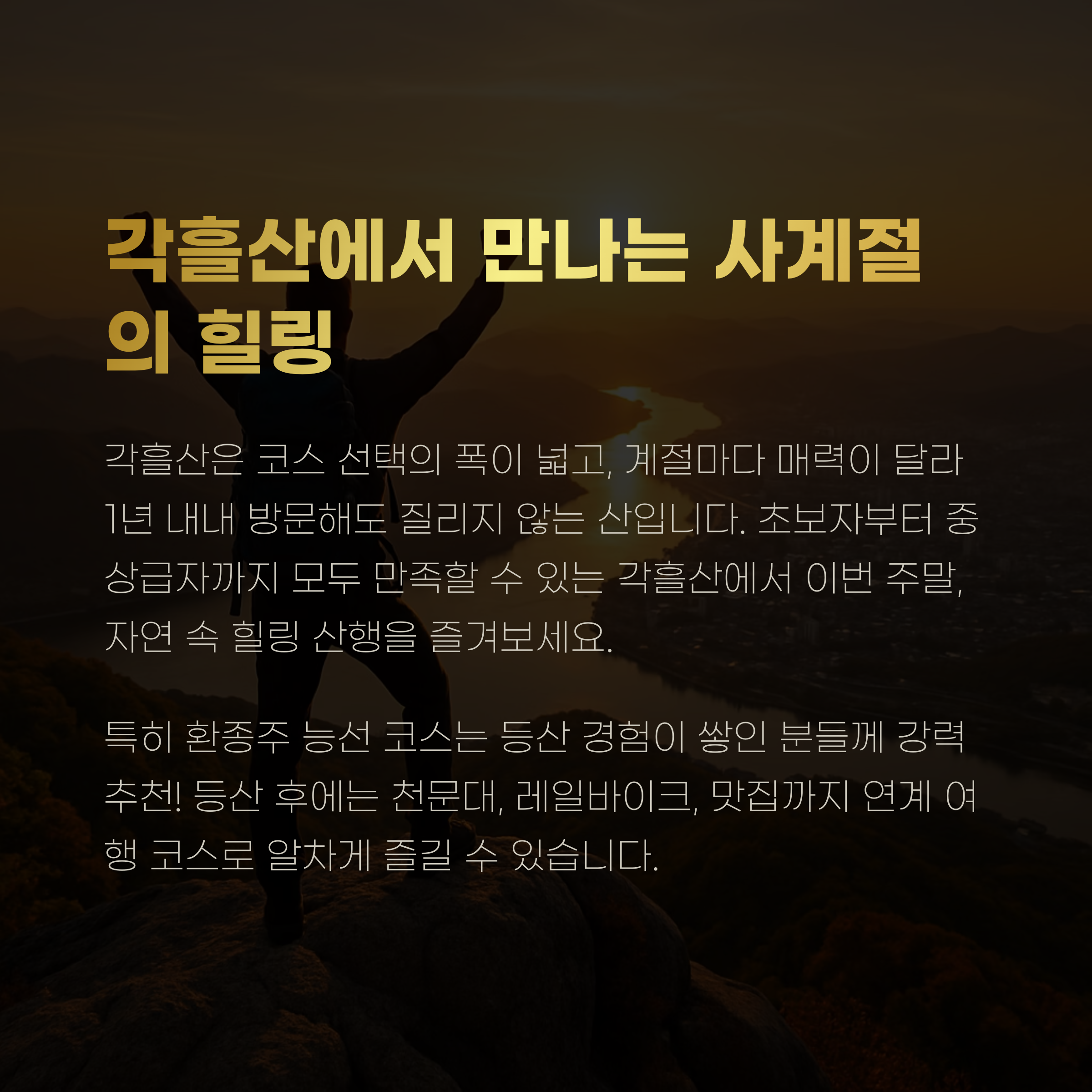 초보자부터 중상급자까지 모두 만족할 수 있는 각흘산에서 이번 주말, 자연 속 힐링 산행을 즐겨보세요.