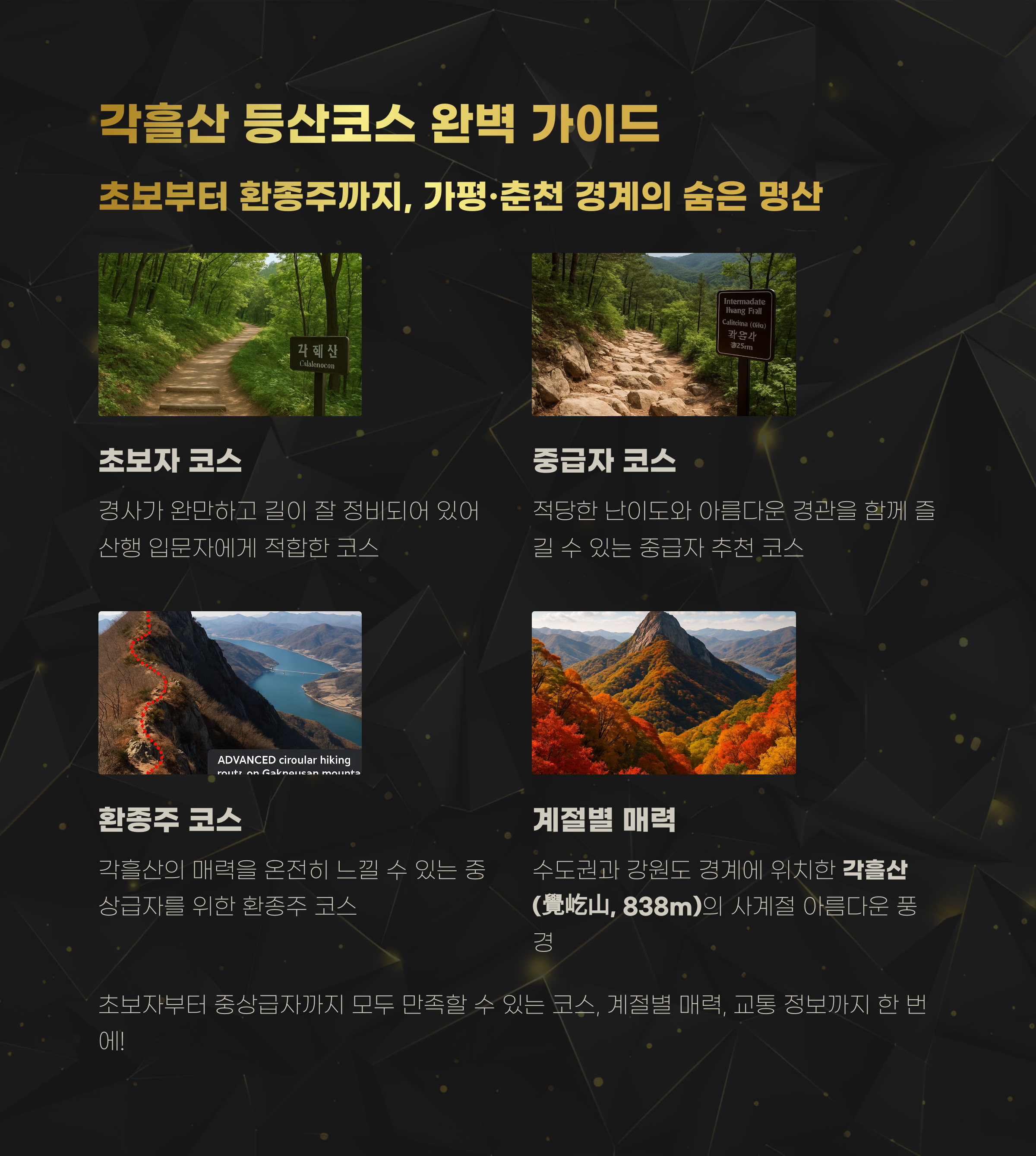 안녕하세요, 오늘은 수도권과 강원도의 경계에 위치한 숨은 명산, 각흘산(覺屹山, 838m) 등산코스를 꼼꼼하게 소개합니다. 등산 초보자부터 환종주를 노리는 중상급자까지 모두 만족할 수 있는 다양한 코스, 계절별 매력, 교통, 준비물, 꿀팁까지 한 번에 정리해드릴게요.