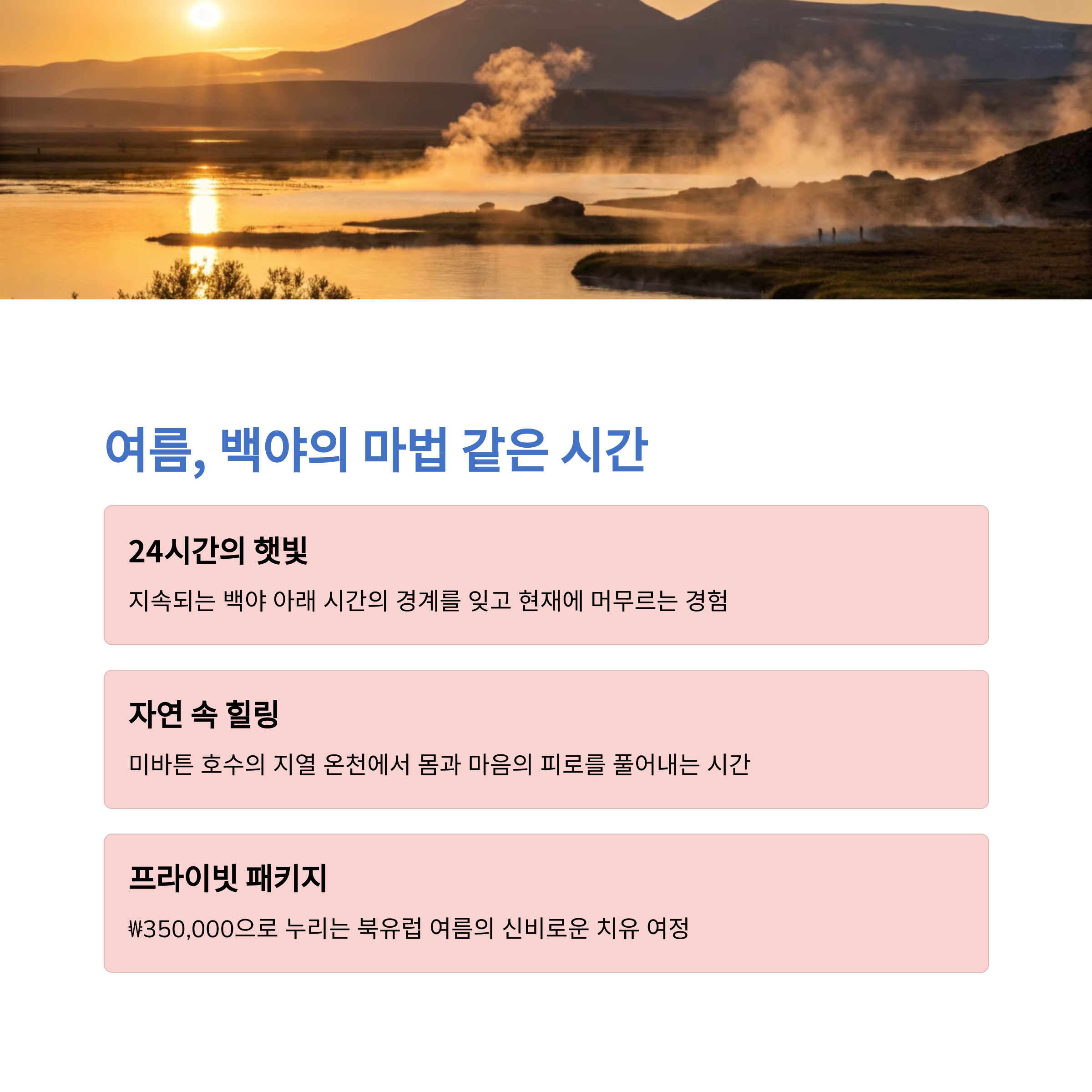 🌿 포인트: 24시간 햇살 속 호수 명상, 자연 온천욕