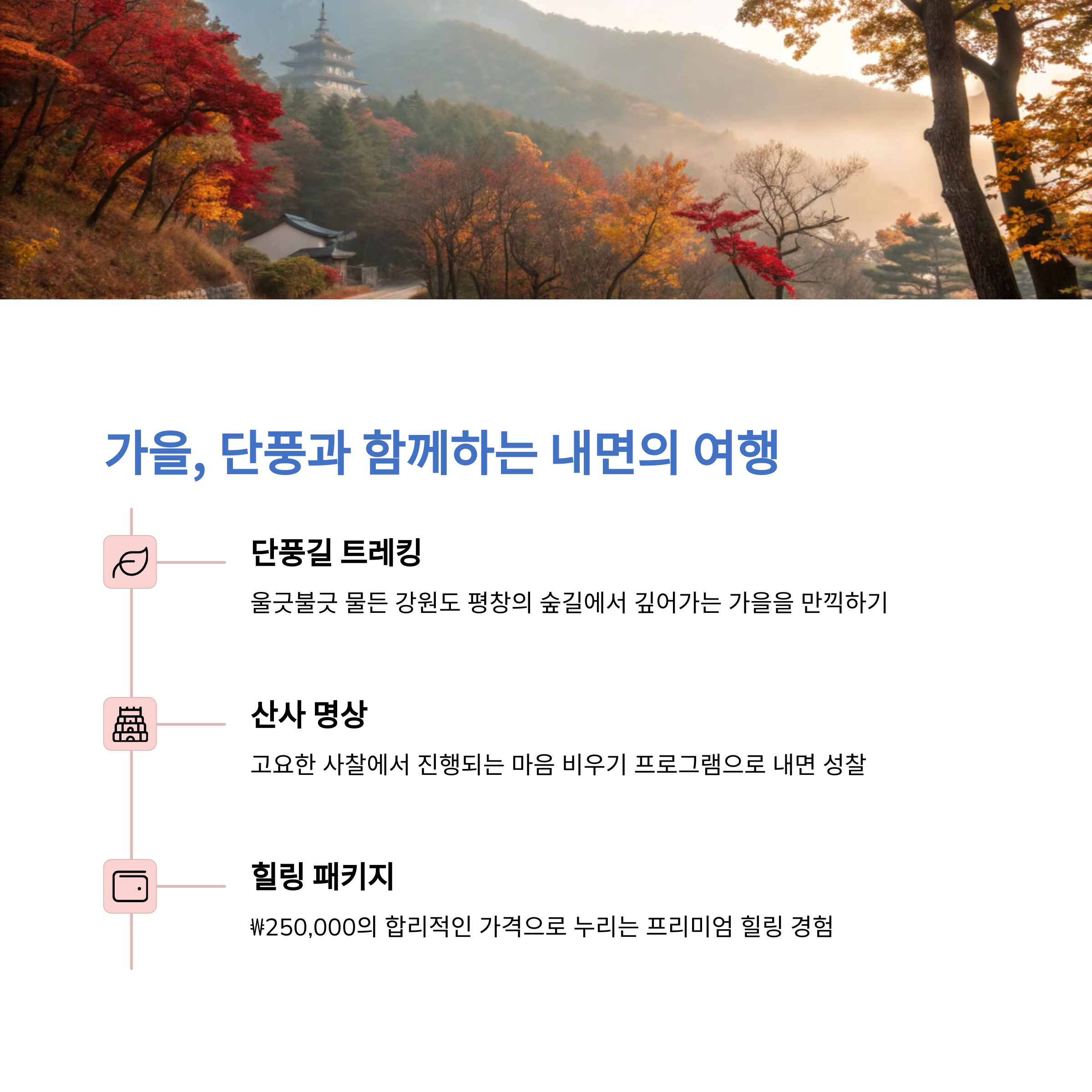 🌿 포인트: 단풍 산책, 불멍 요가, 계곡 사운드 테라피