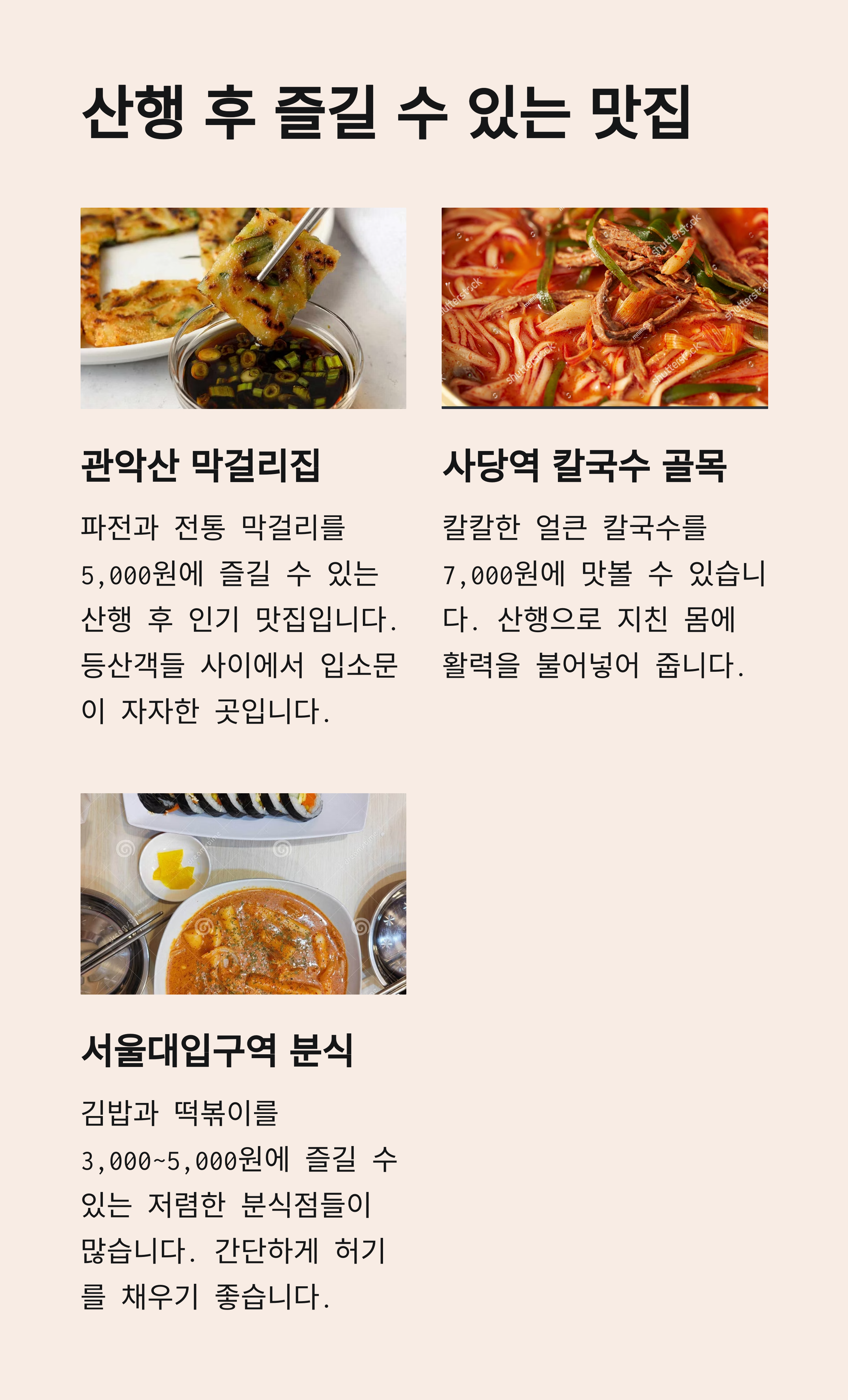 - 관악산 막걸리집: 파전·전통 막걸리(₩5,000)