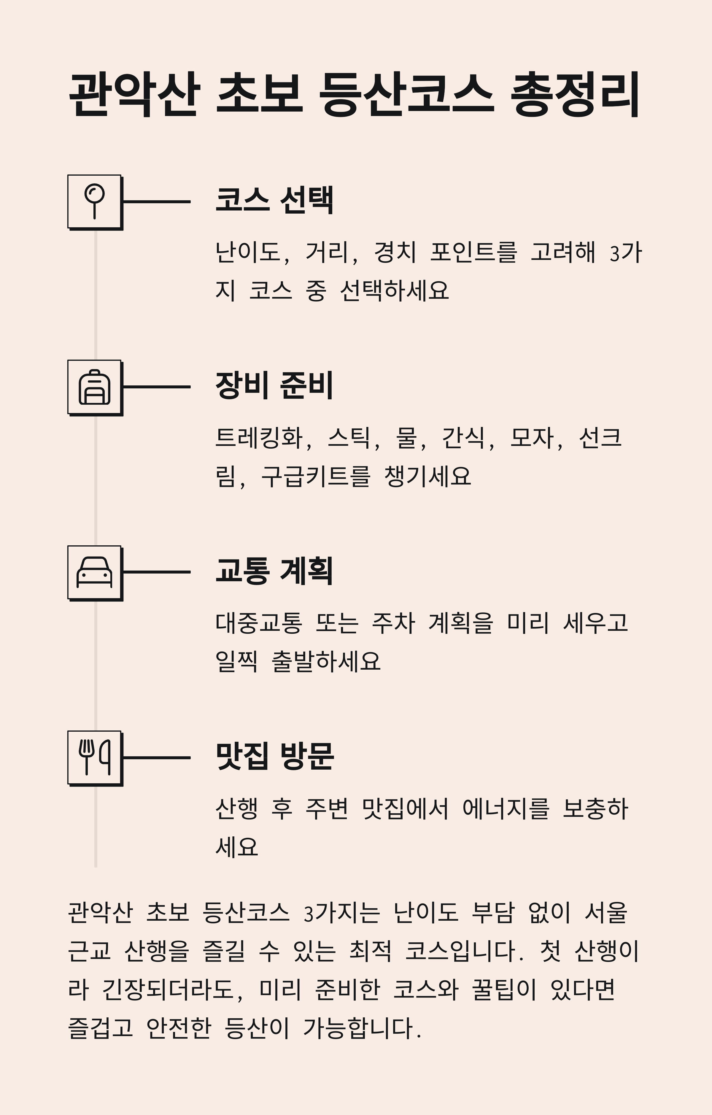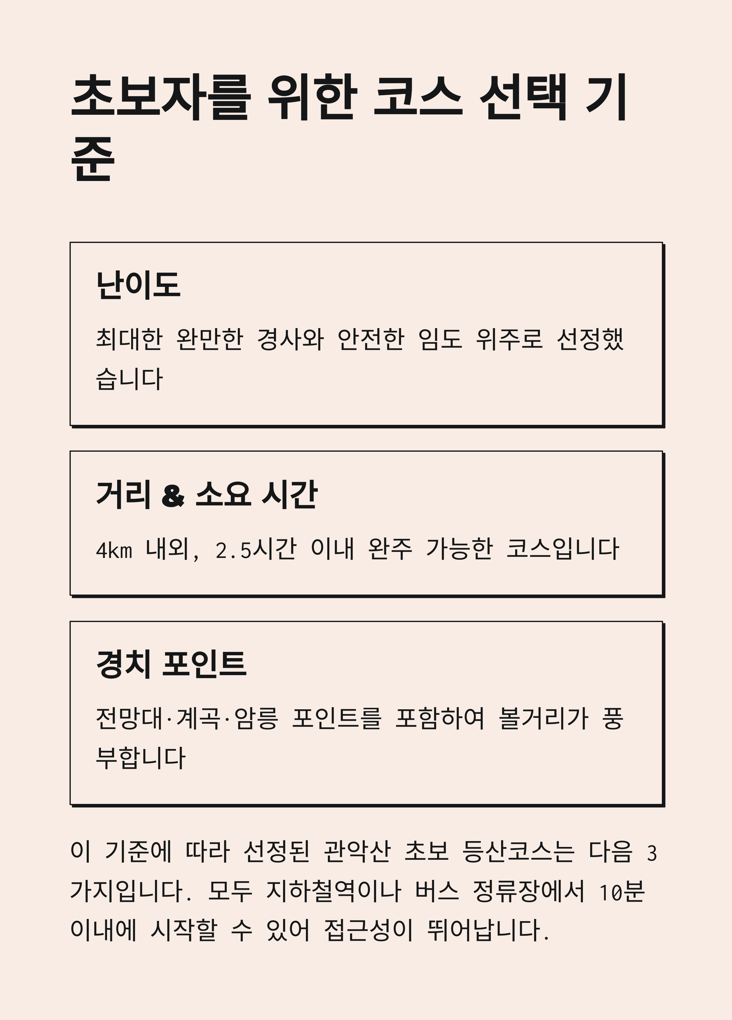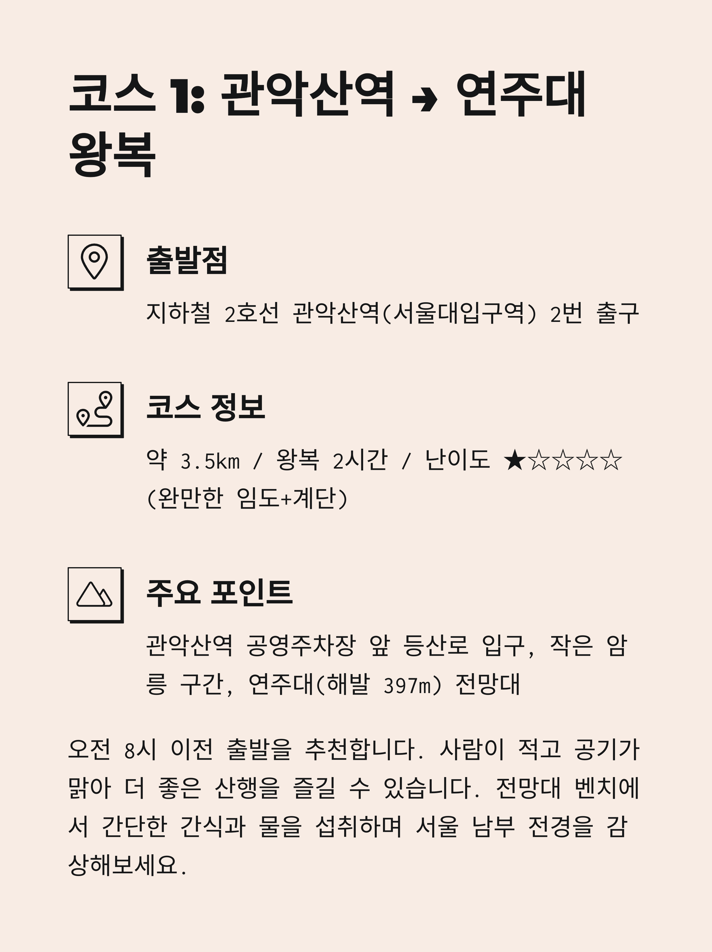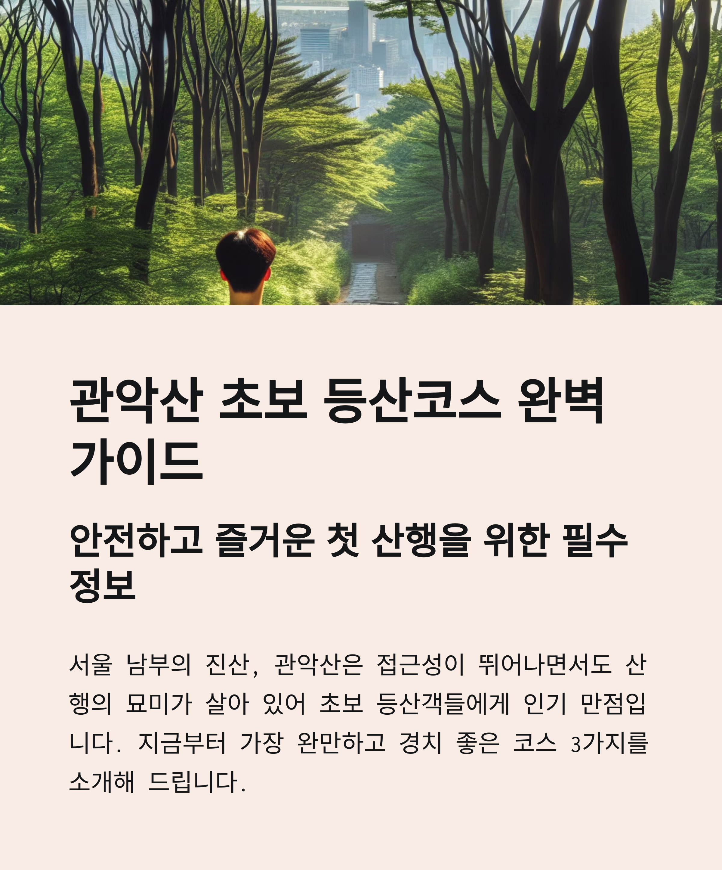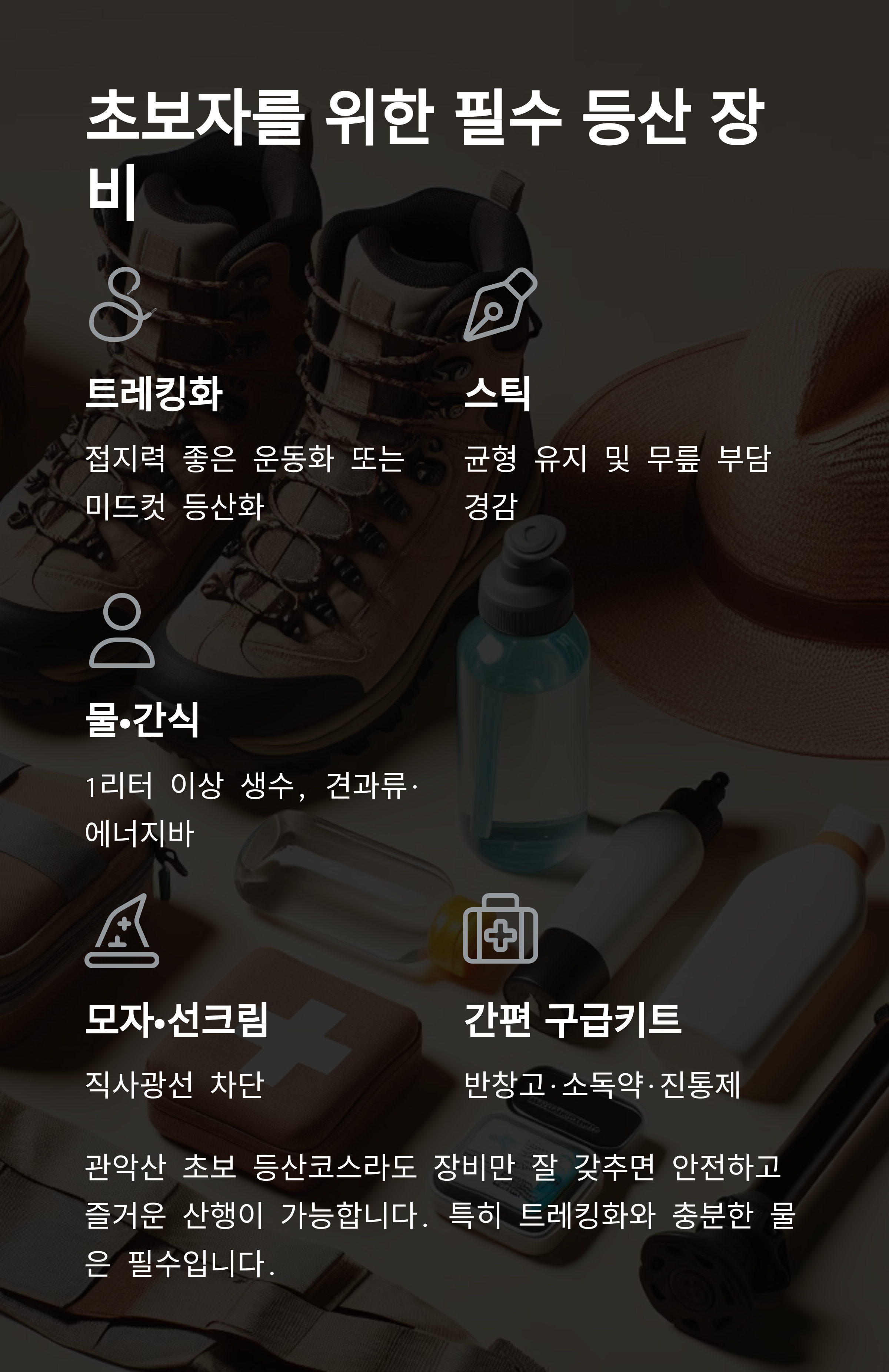 - “관악산 초보 등산코스”라도 장비만 잘 갖추면 안전합니다.