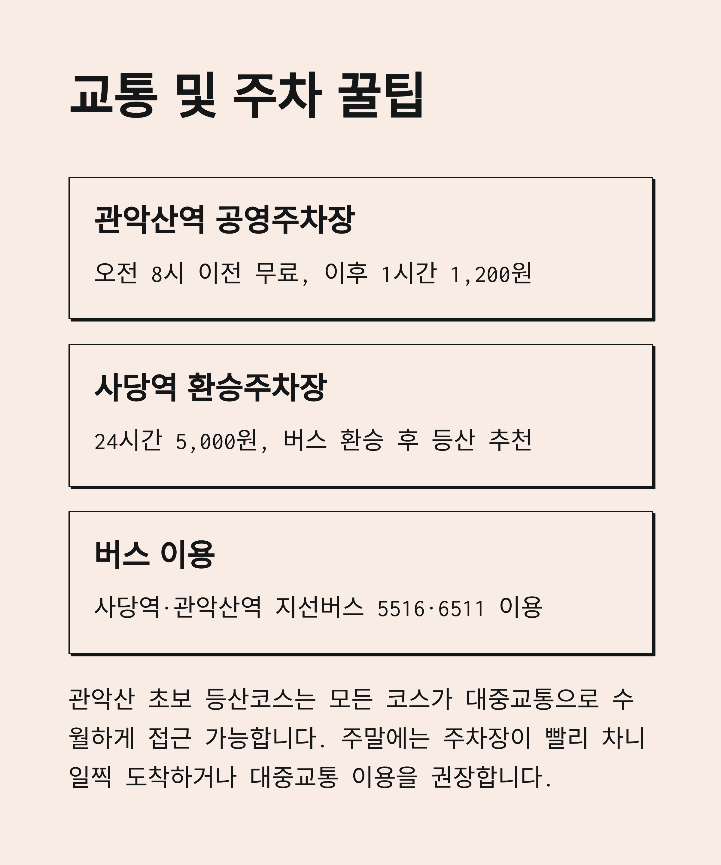 - 사당역 환승주차장: 24시간 5,000원, 버스 환승 후 등산 추천