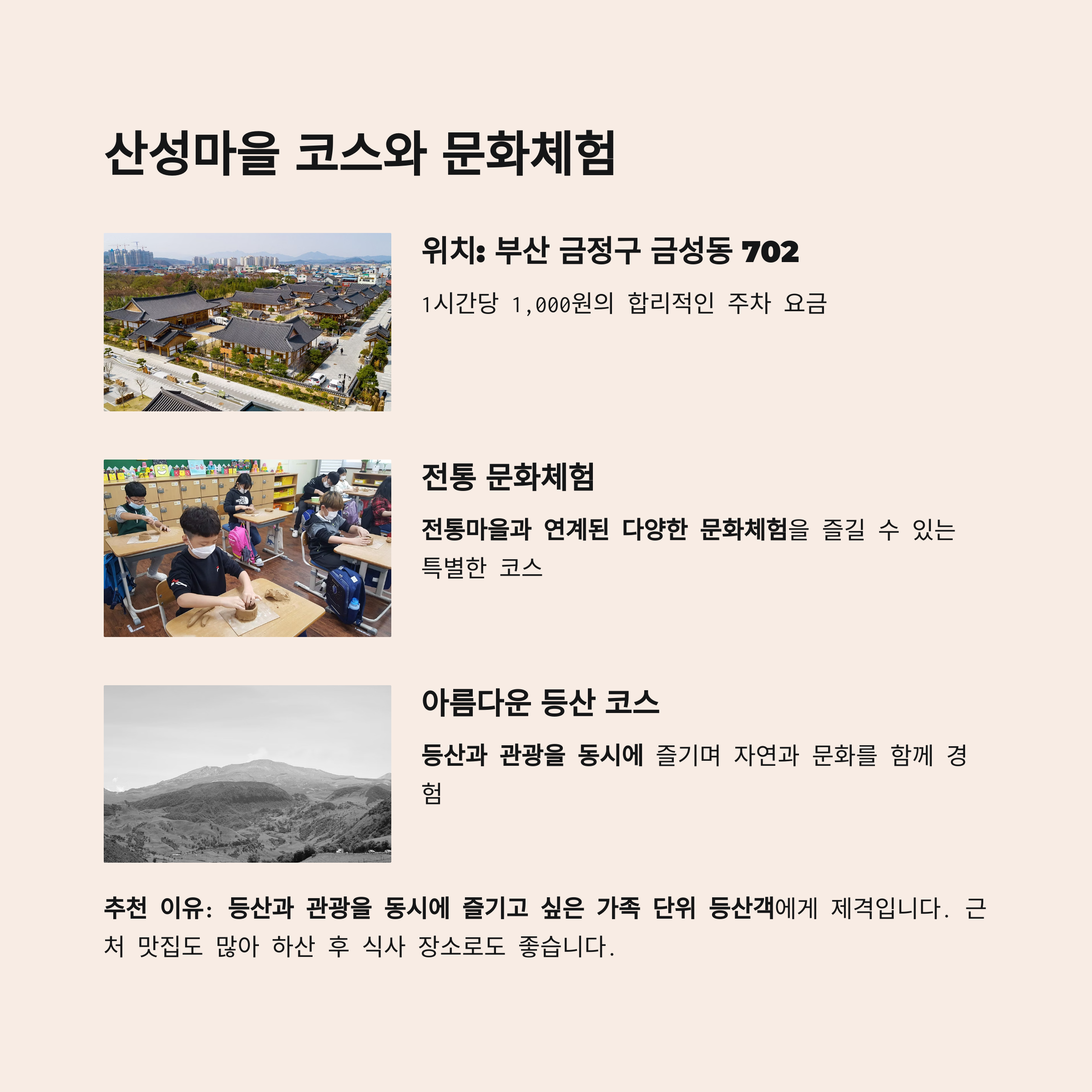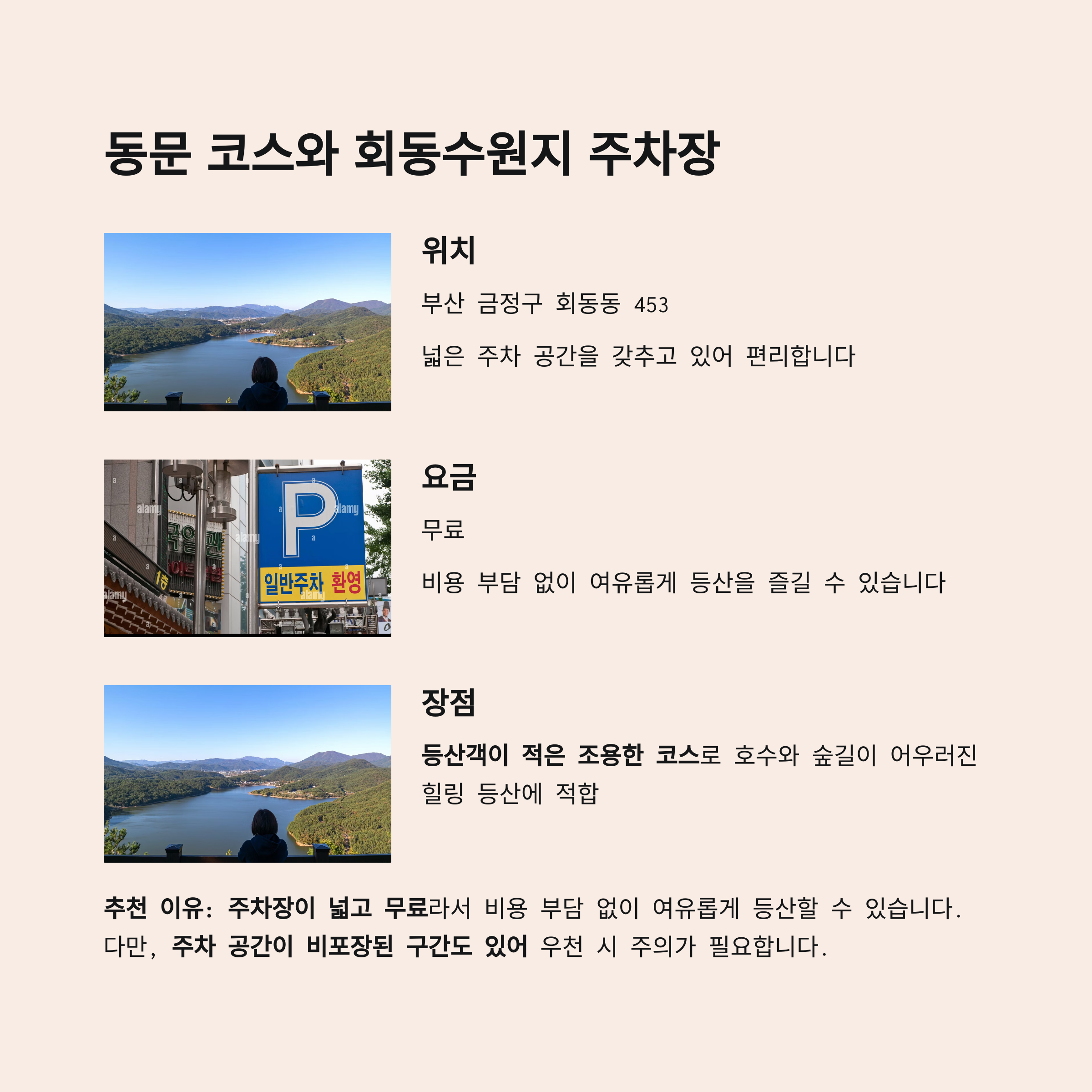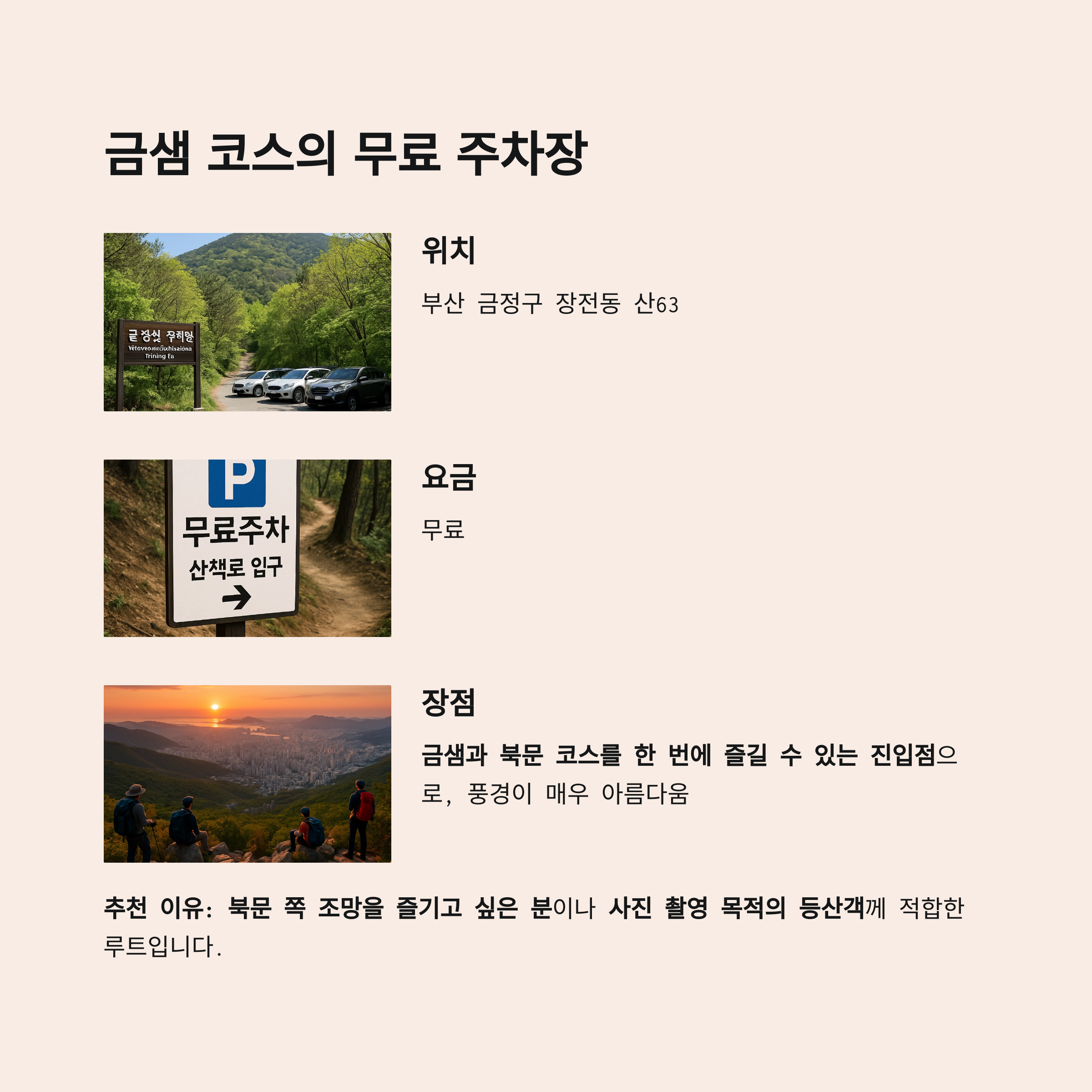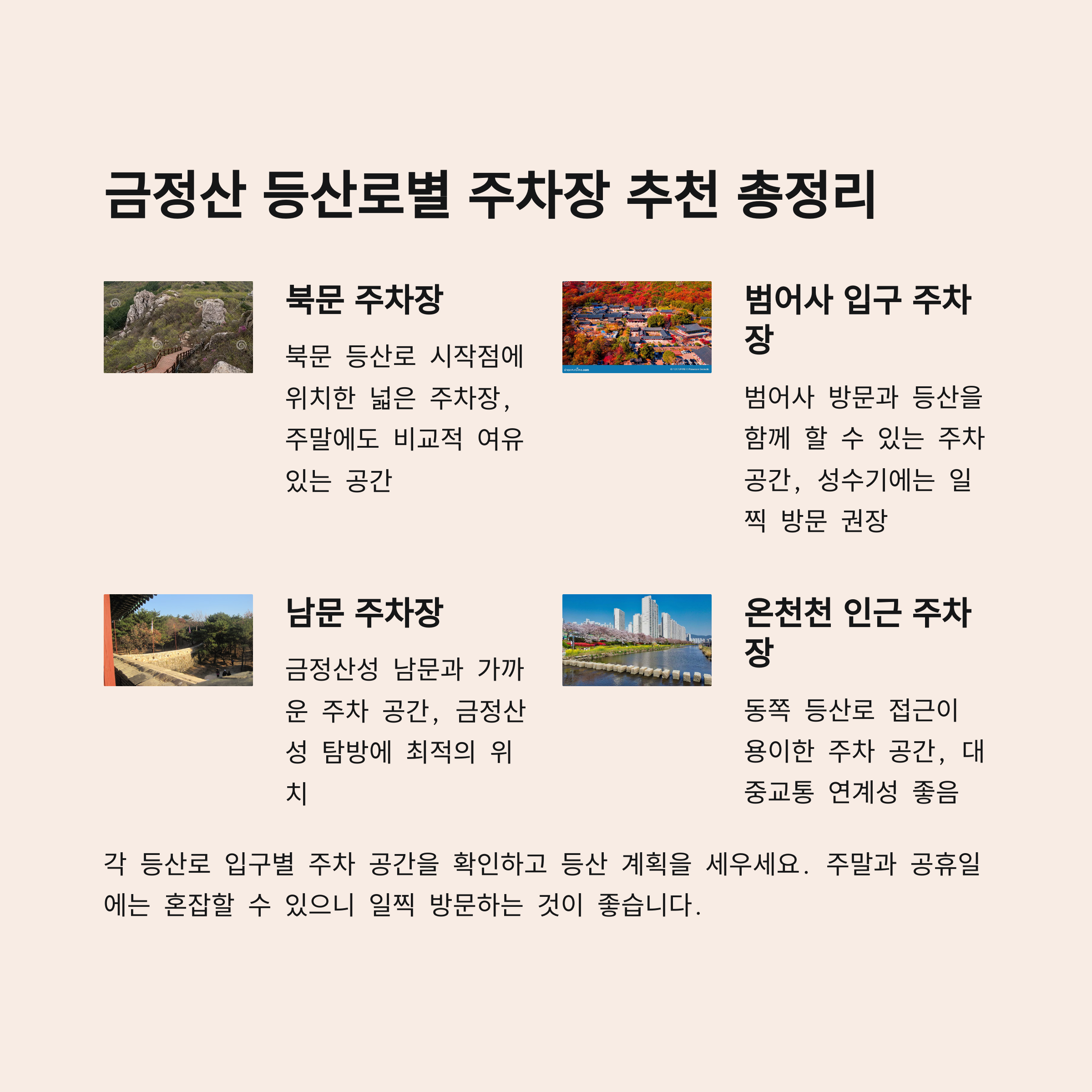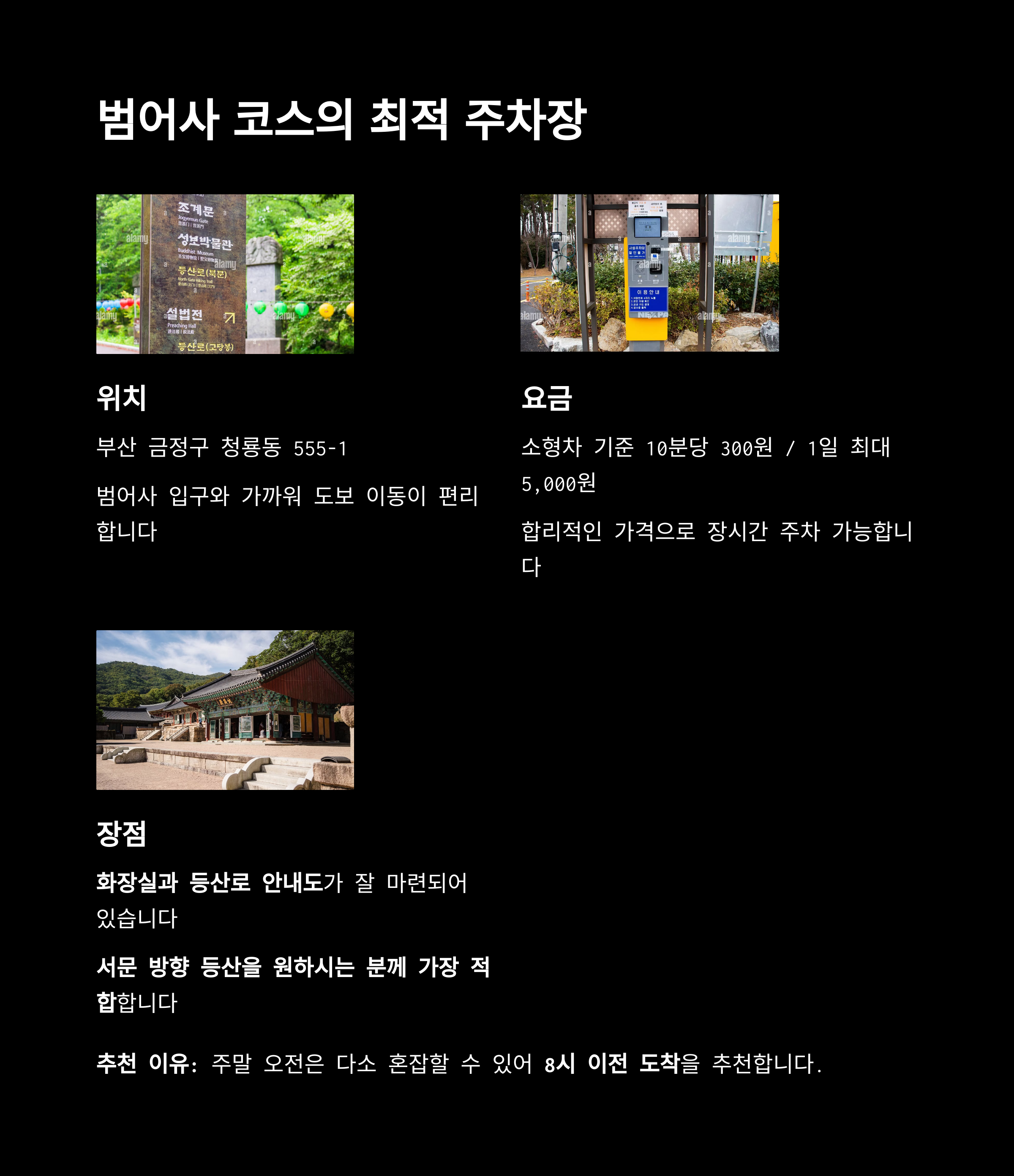 - 장점: 범어사 입구와 가까워 도보 이동이 편리하고, 화장실과 등산로 안내도가 잘 마련되어 있습니다.