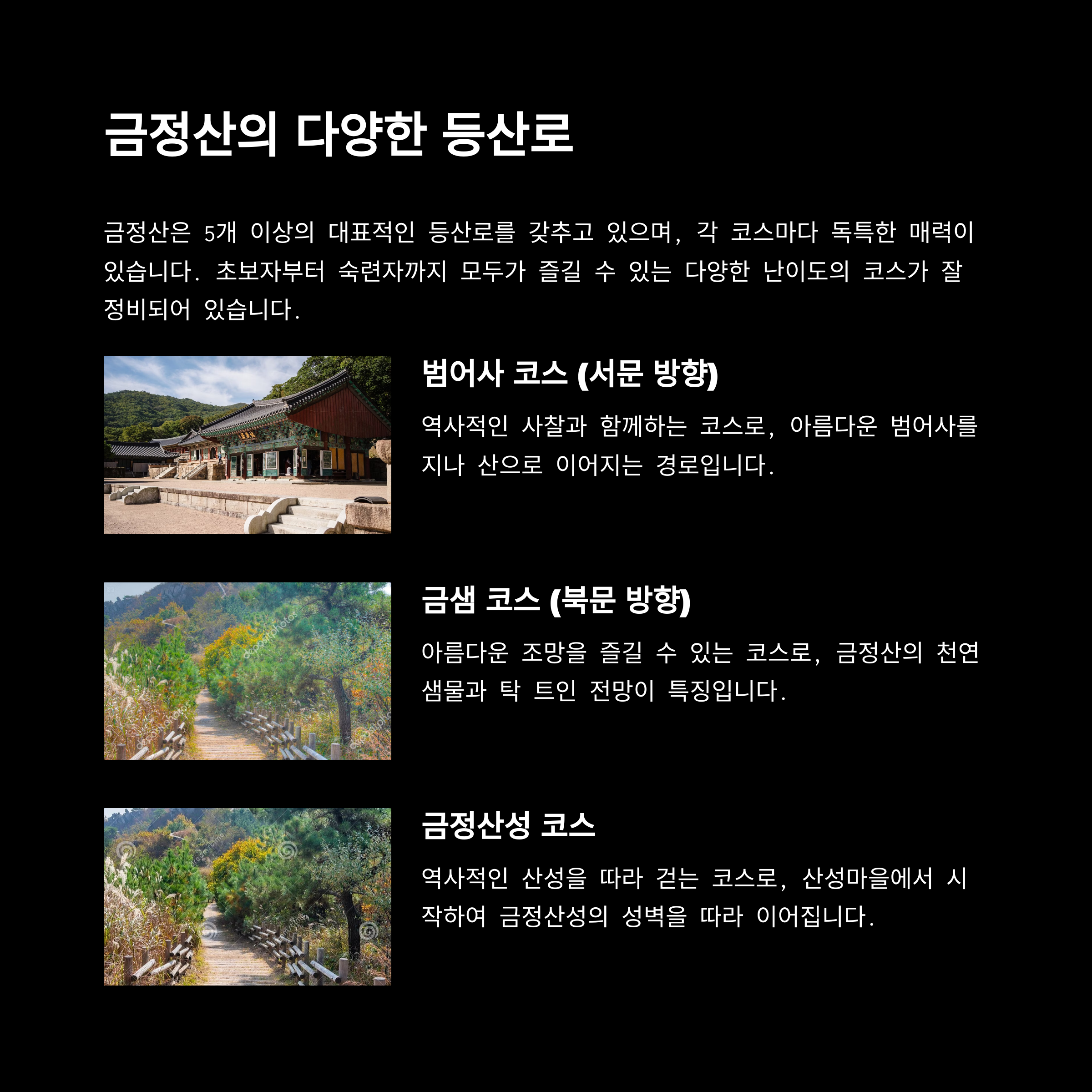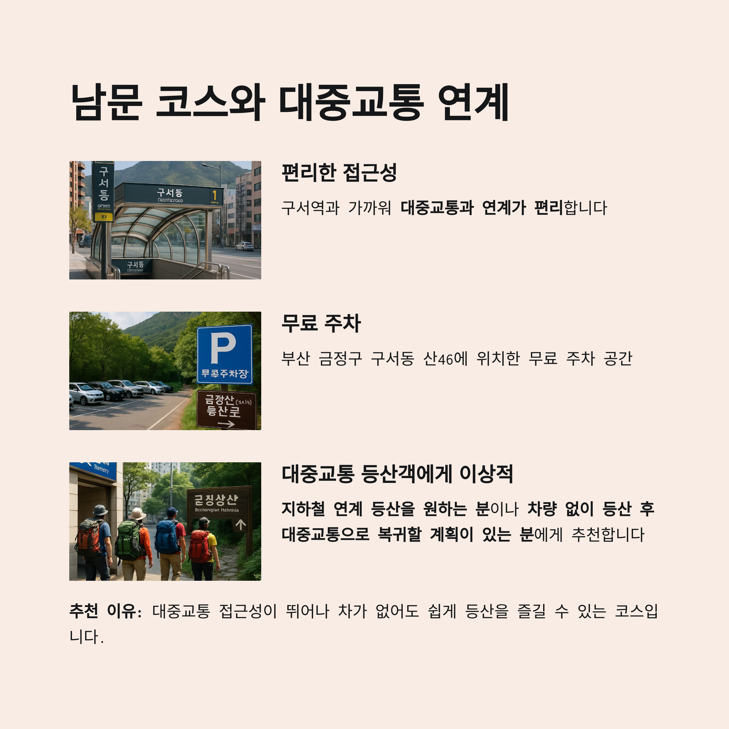 - 장점: 금샘과 북문 코스를 한 번에 즐길 수 있는 진입점으로, 풍경이 매우 아름답습니다.