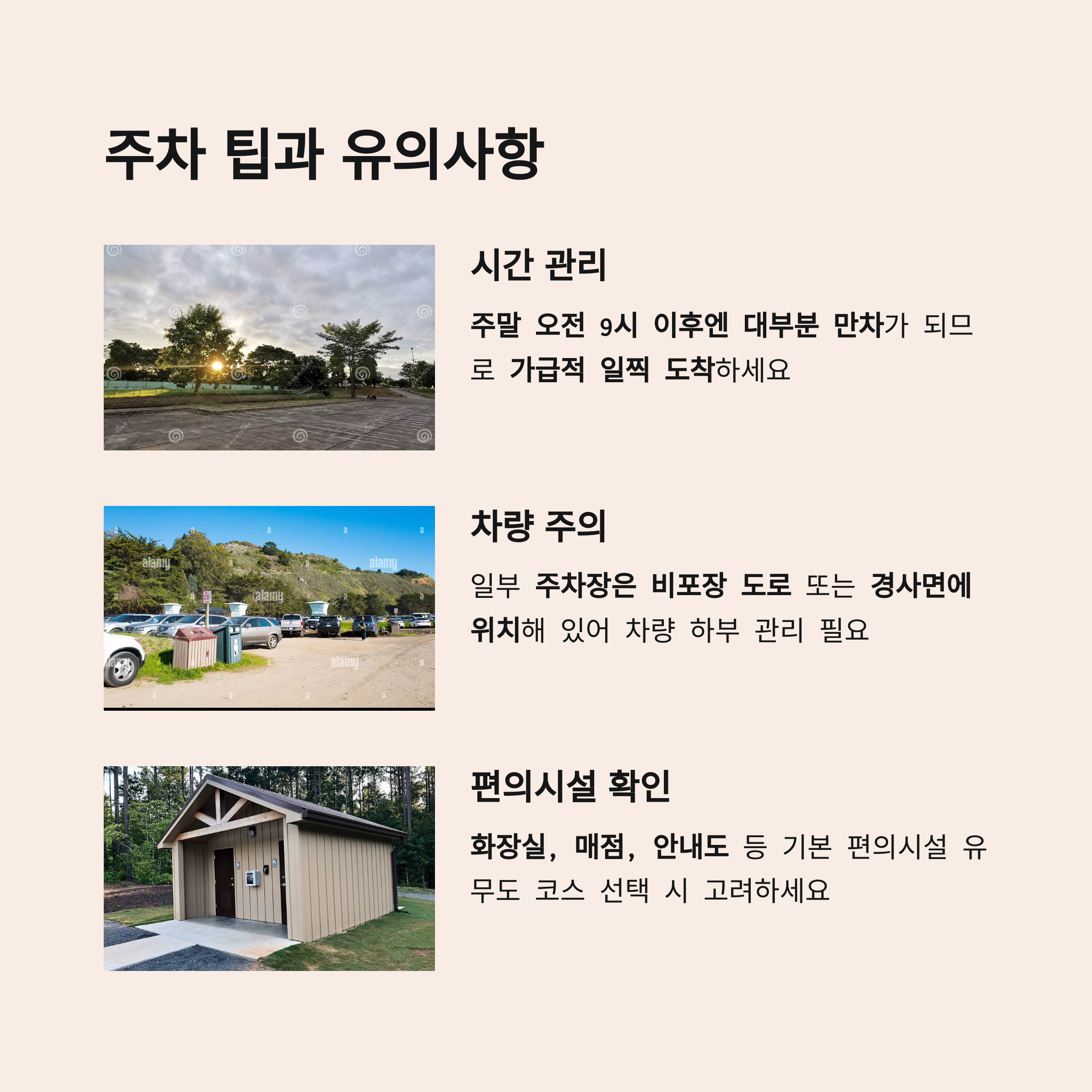 - 화장실, 매점, 안내도 등 기본 편의시설 유무도 코스 선택 시 고려하는 것이 좋습니다.
