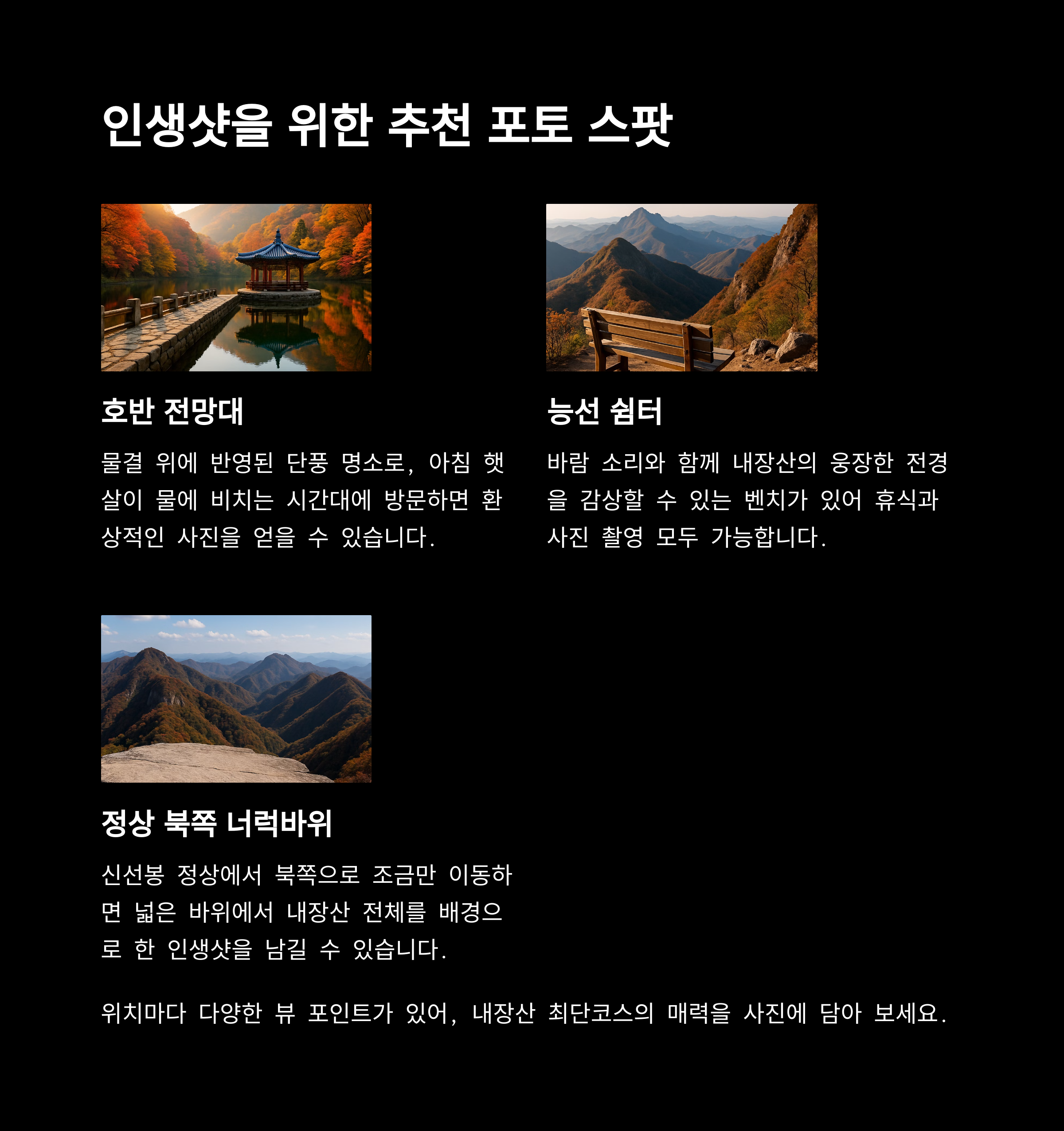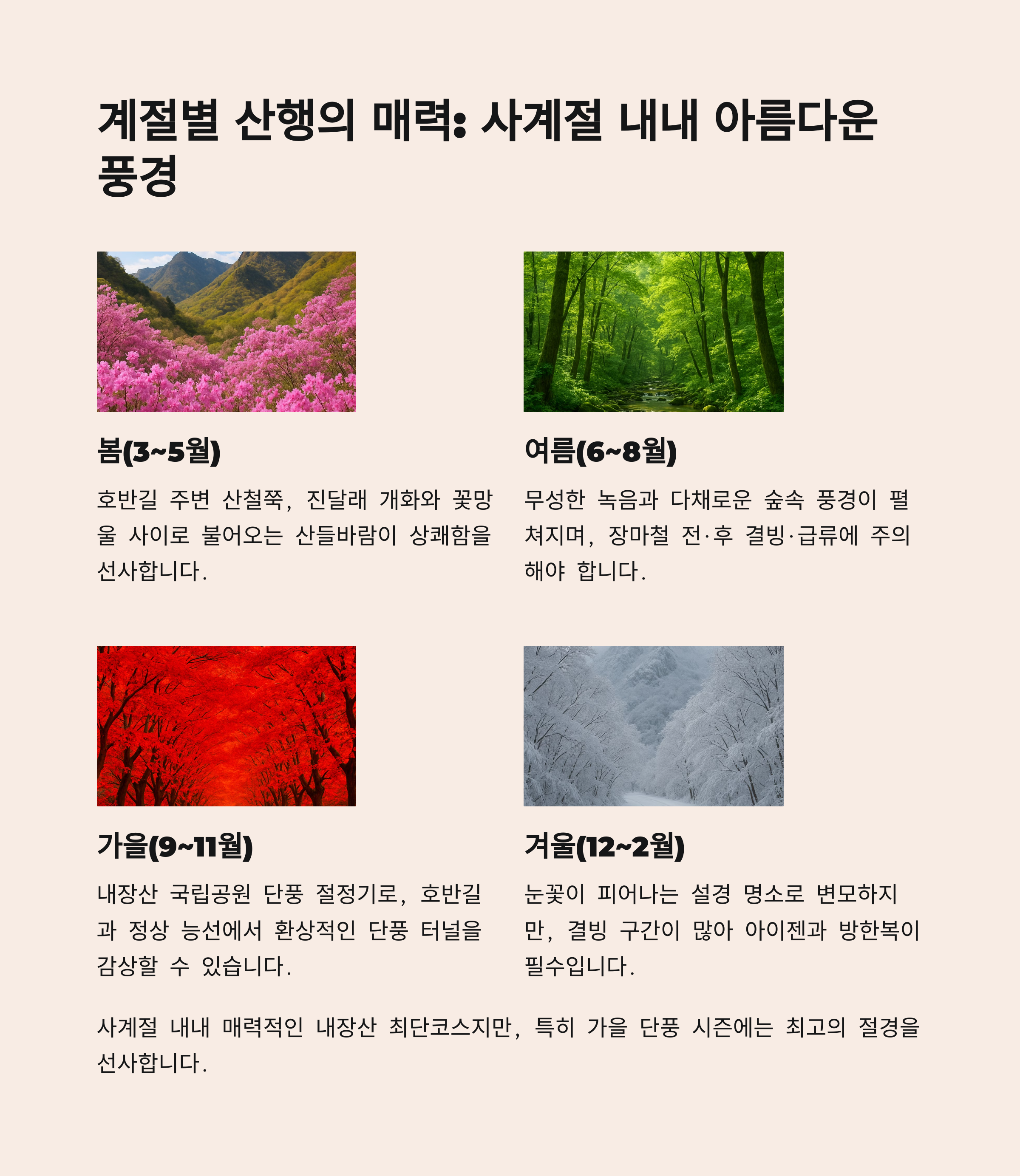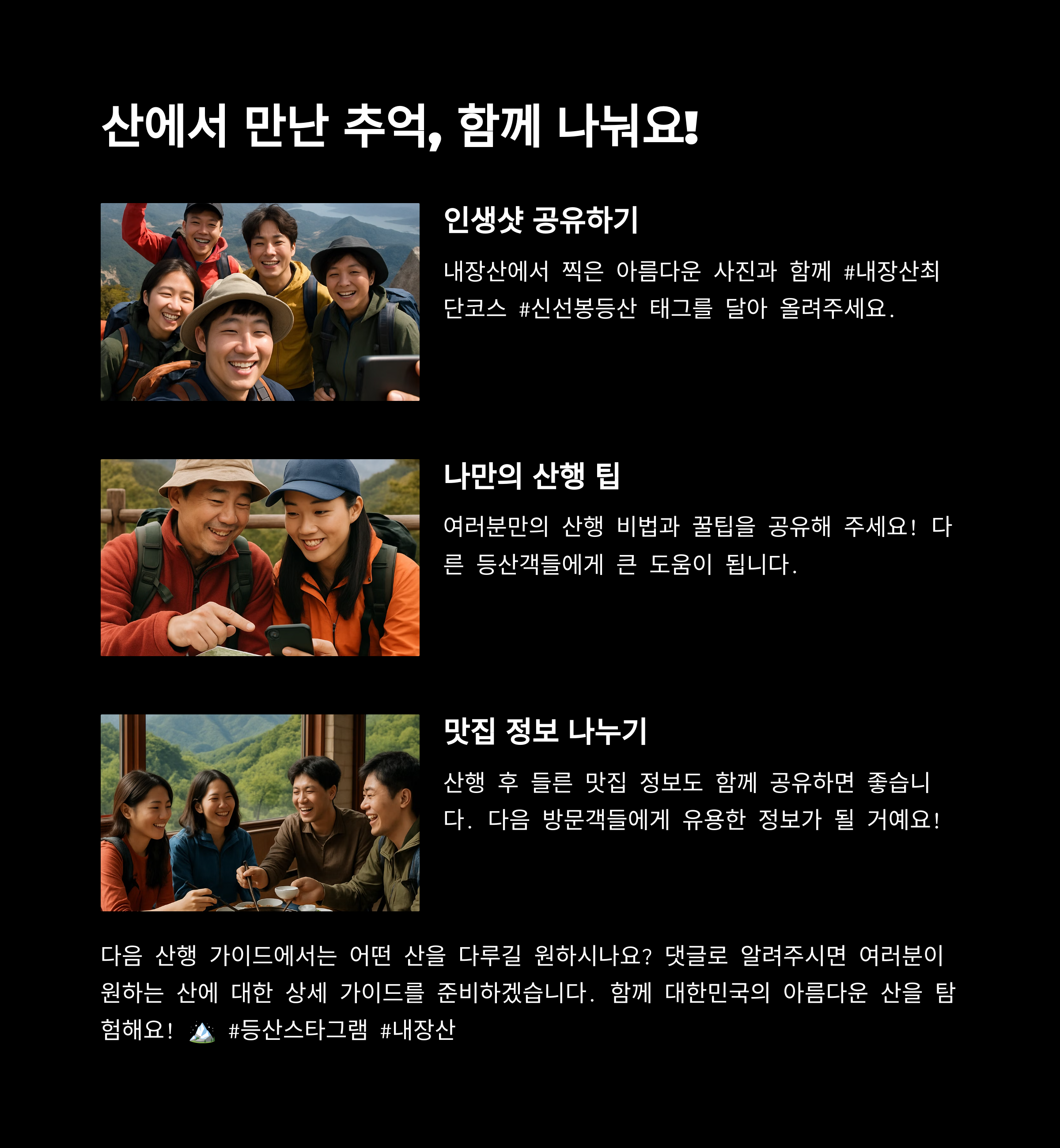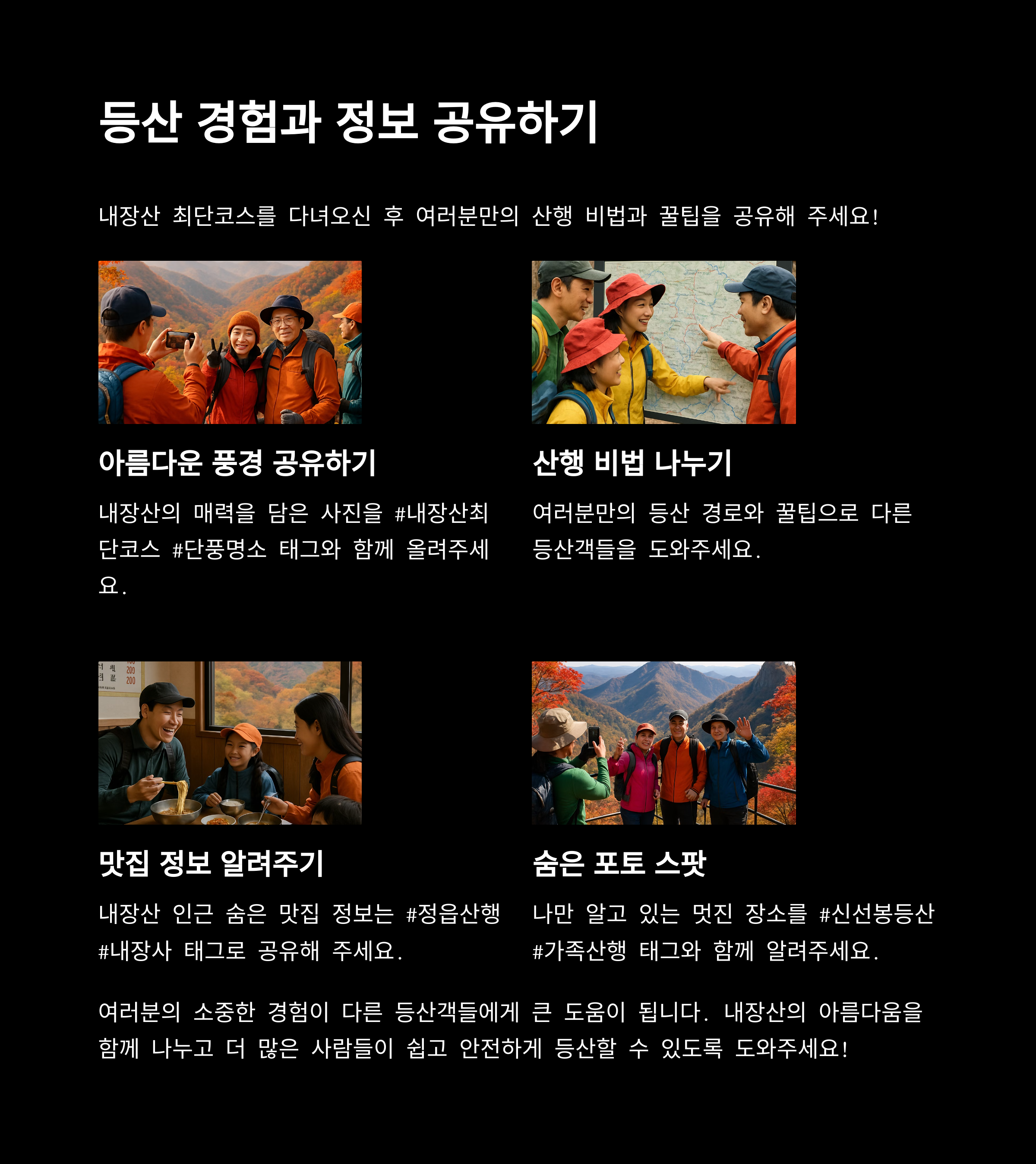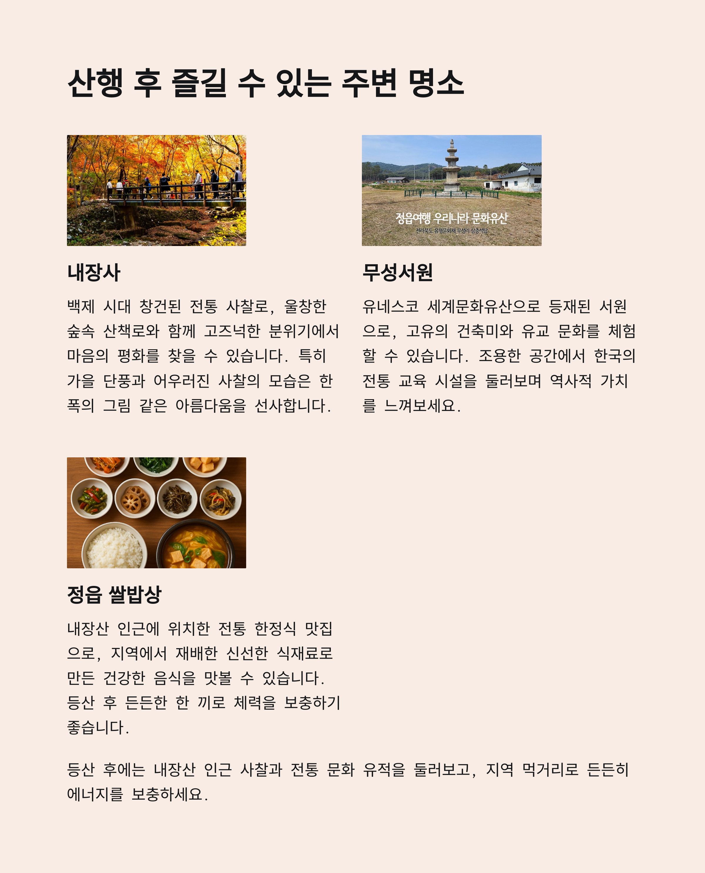 등산 후에는 내장산 인근 사찰과 전통 문화 유적을 둘러보고, 지역 먹거리로 든든히 에너지를 보충하세요.