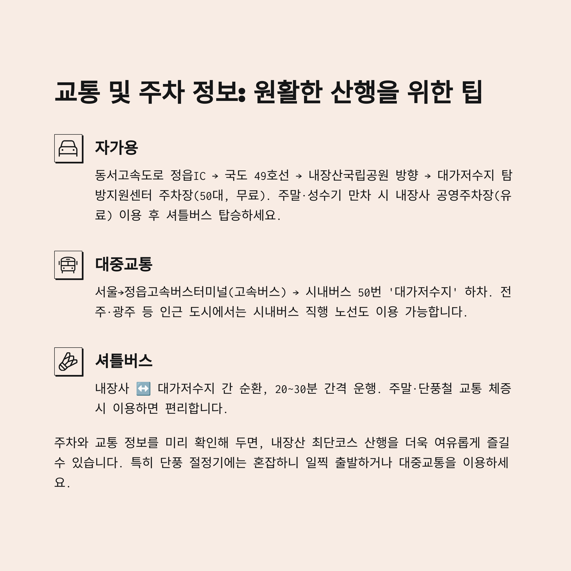주차와 교통 정보를 미리 확인해 두면, 내장산 최단코스 산행을 더욱 여유롭게 즐길 수 있습니다.