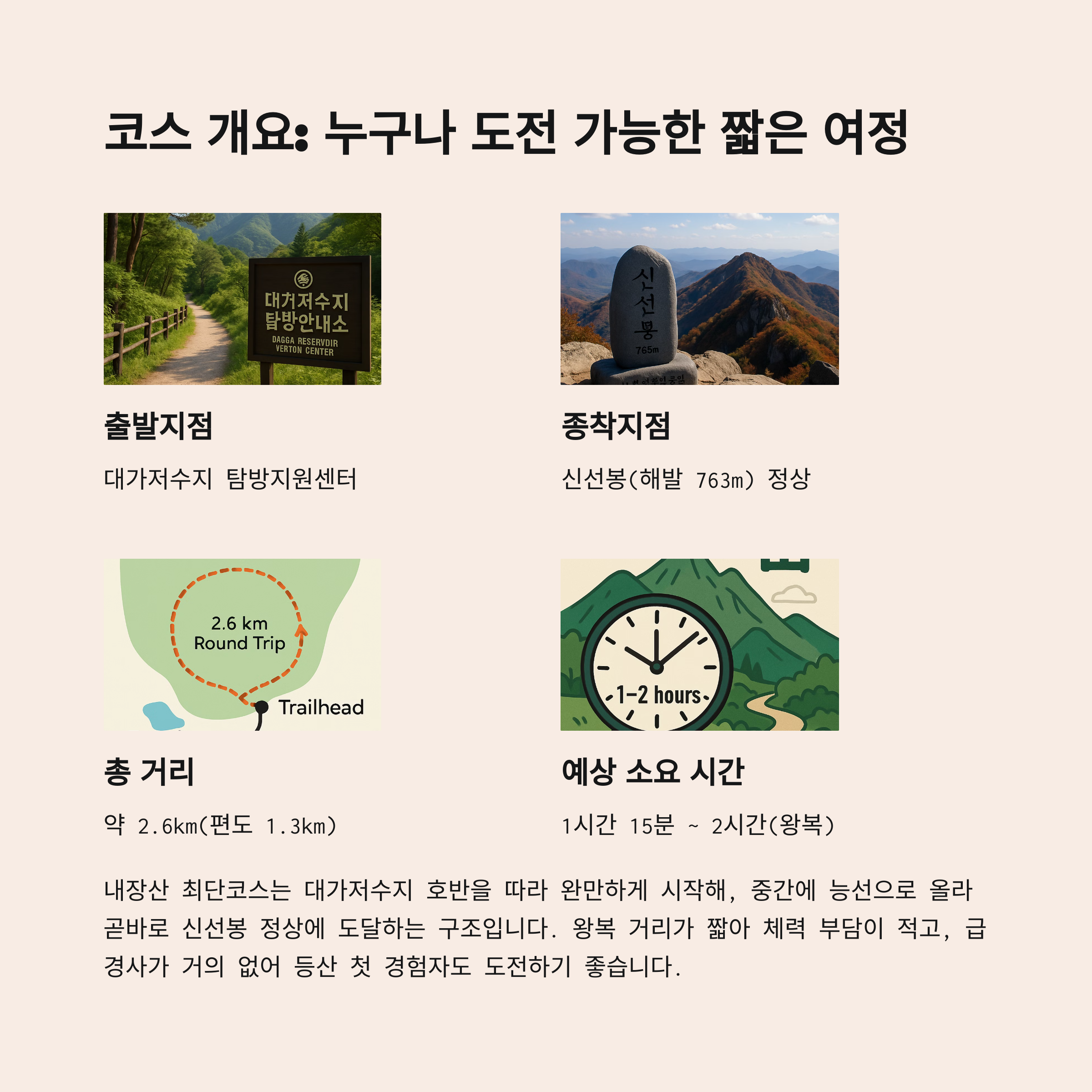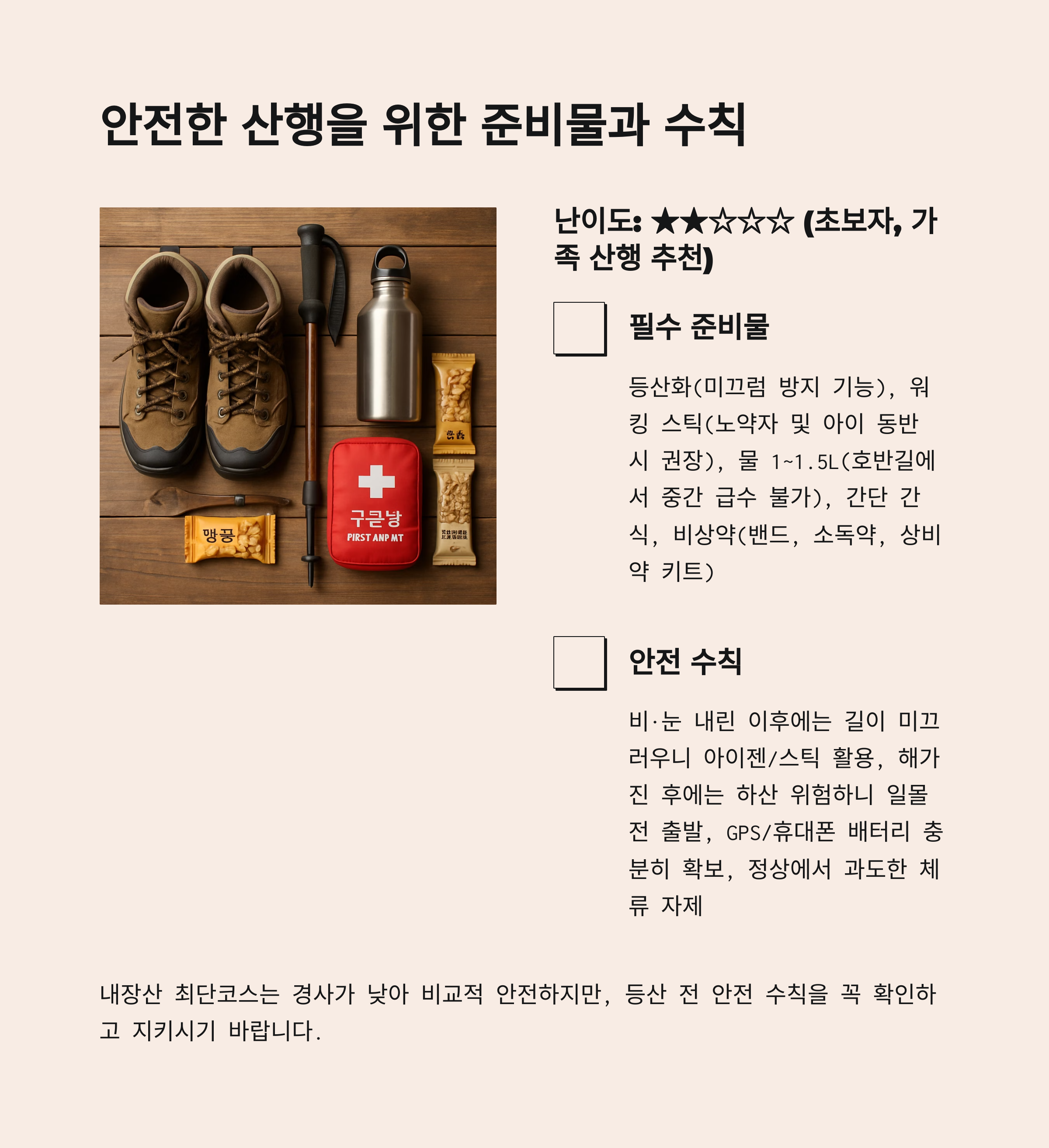 - 난이도: ★★☆☆☆ (초보자, 가족 산행 추천)