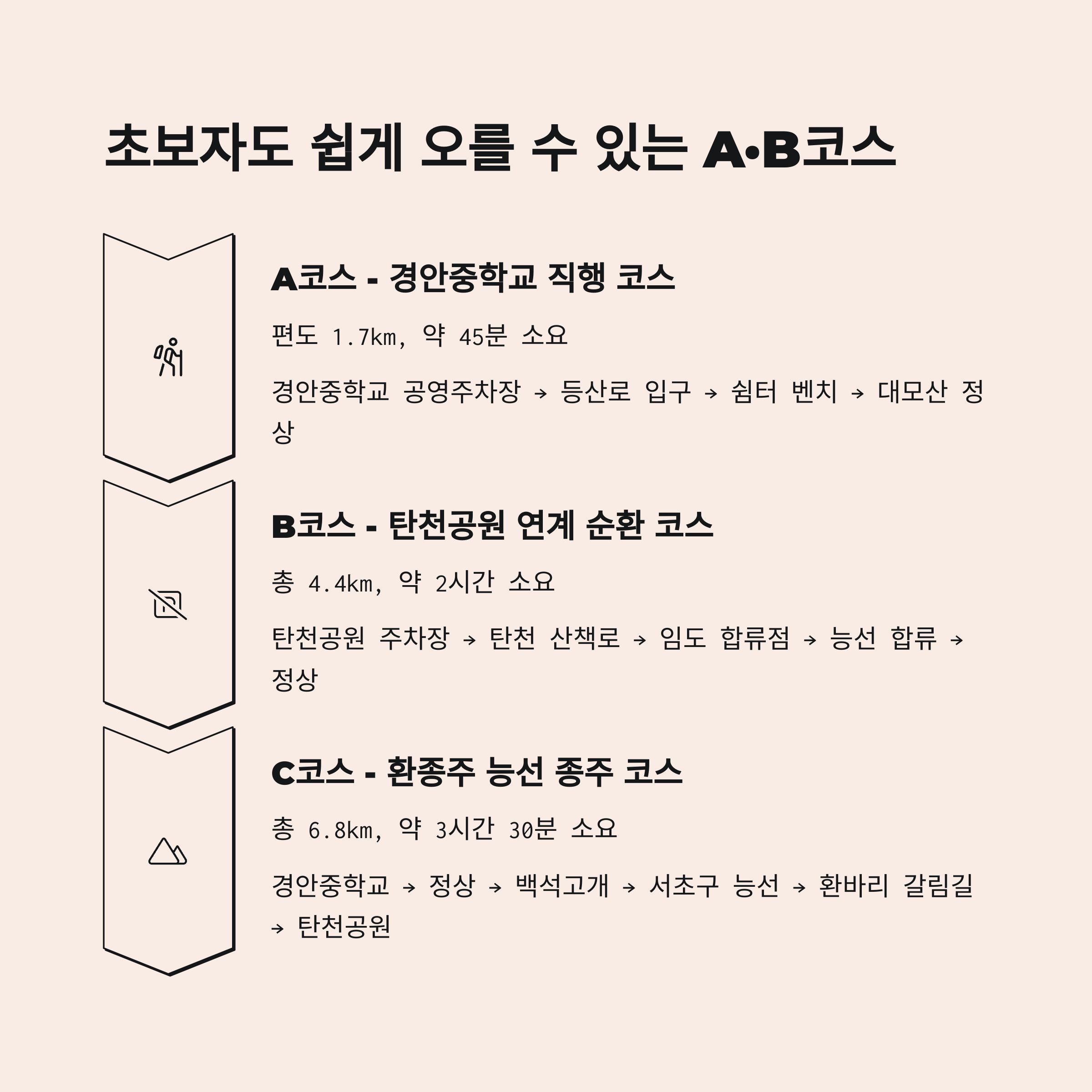 – 대모산 B코스는 도심 속 탄천 연계 산책과 대모산 정상 조망을 동시에 즐길 수 있습니다.