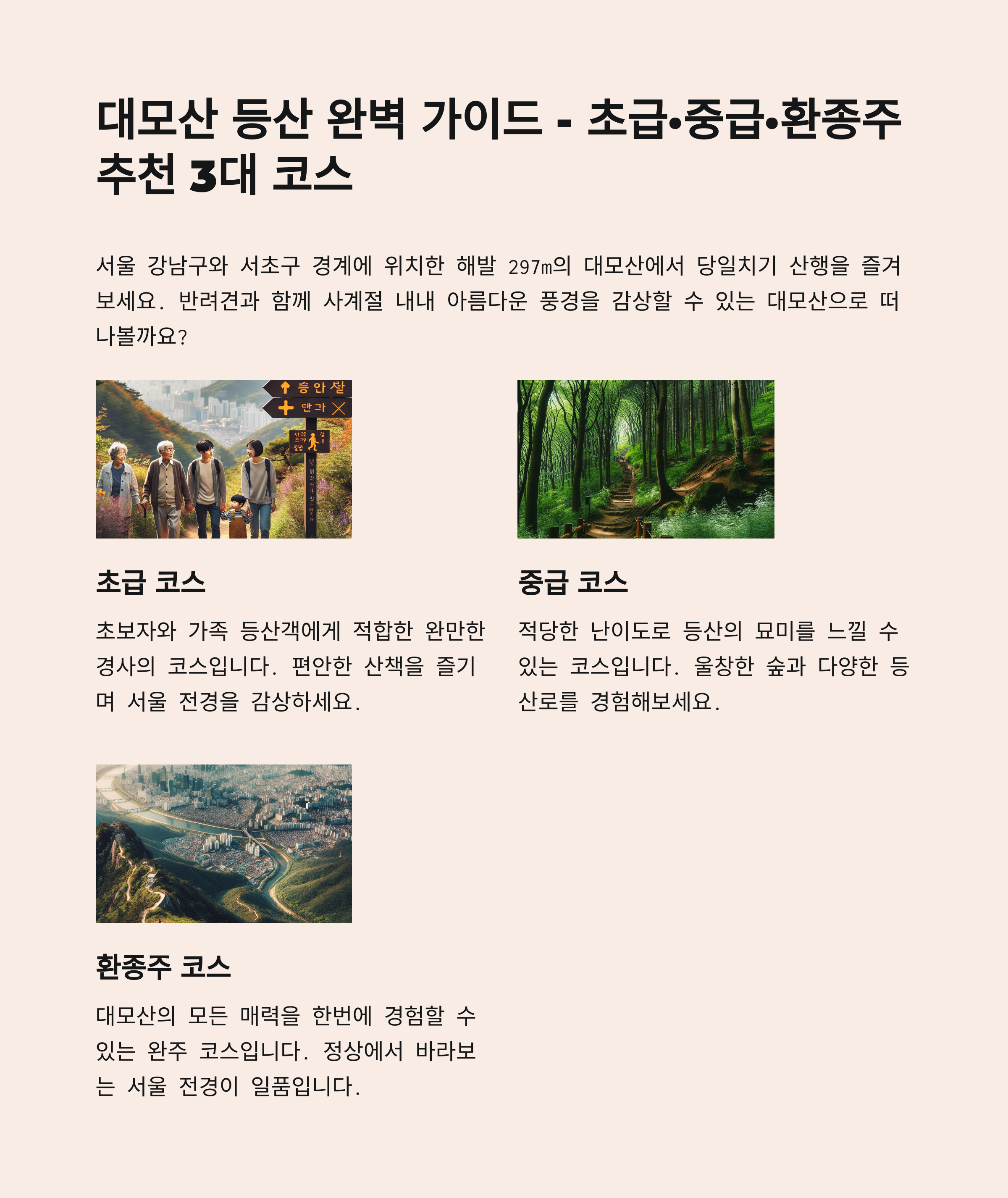 – 대모산 C코스는 환종주 형태로 이어지는 능선 풍광이 압도적이며, 도심과 산림이 어우러진 뷰가 매력적입니다.