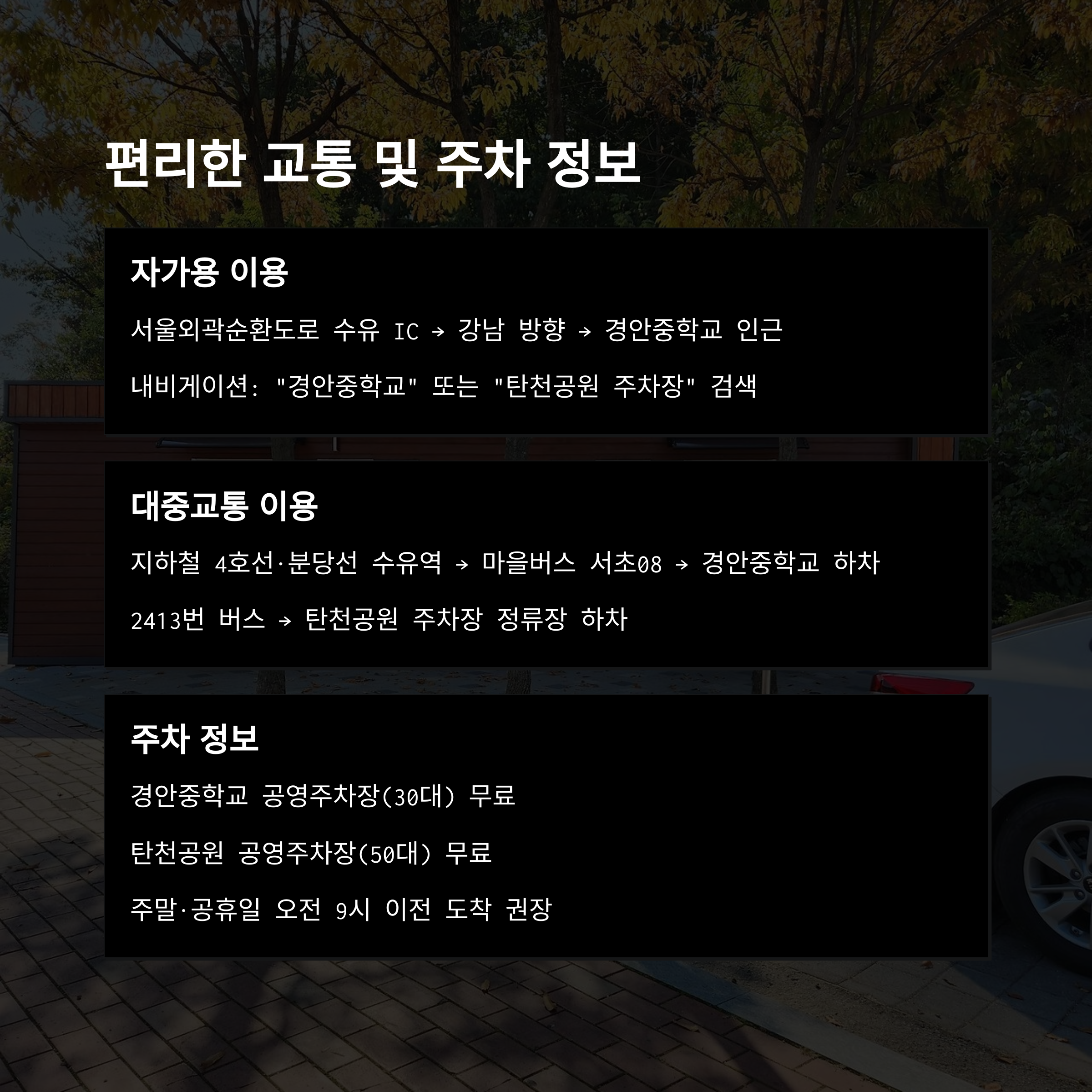 • 지하철 4호선·분당선 수유역 → 마을버스 서초08 → 경안중학교 하차(도보 3분)
