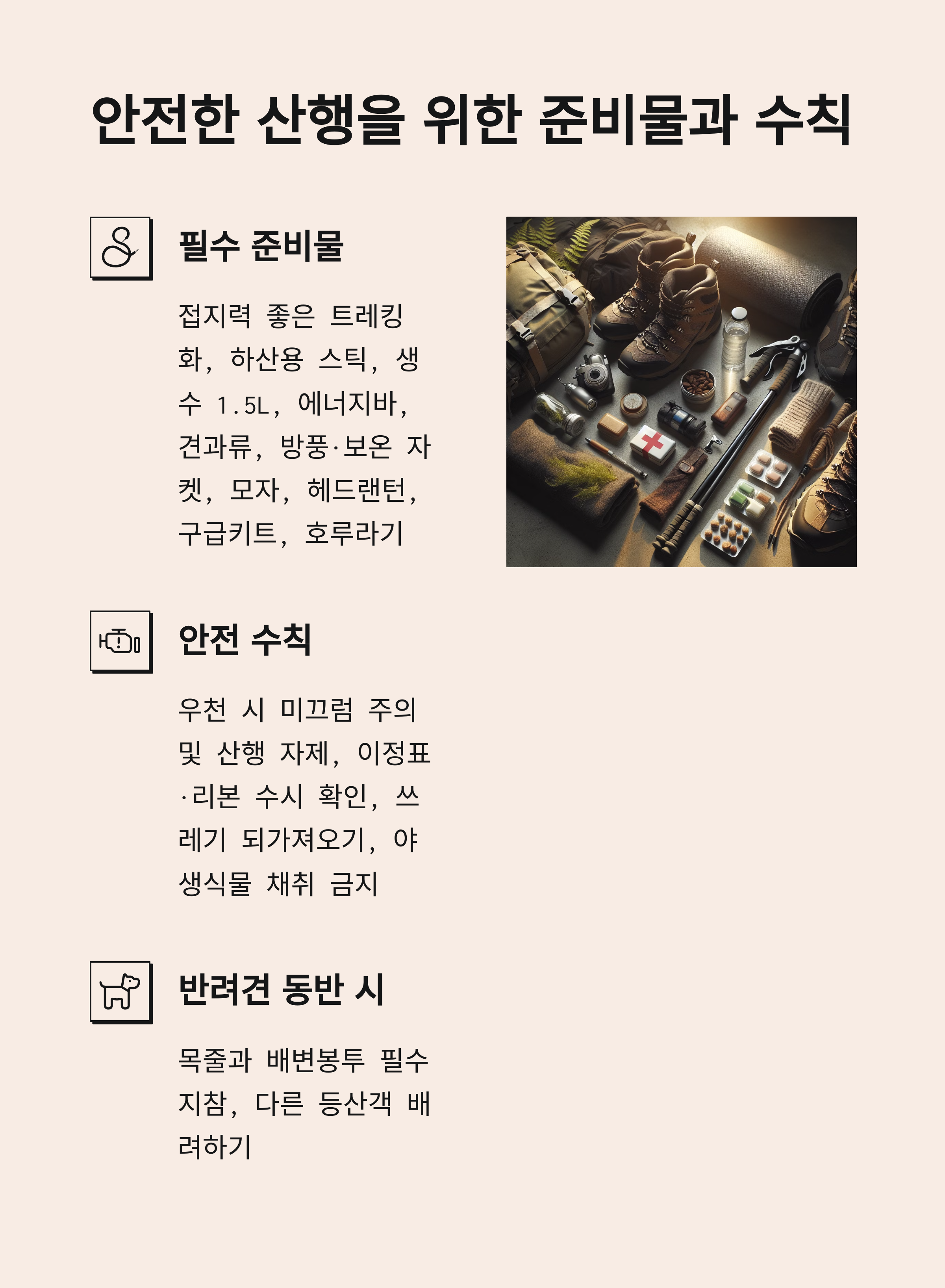 - 비상용품: 헤드랜턴·구급키트·호루라기