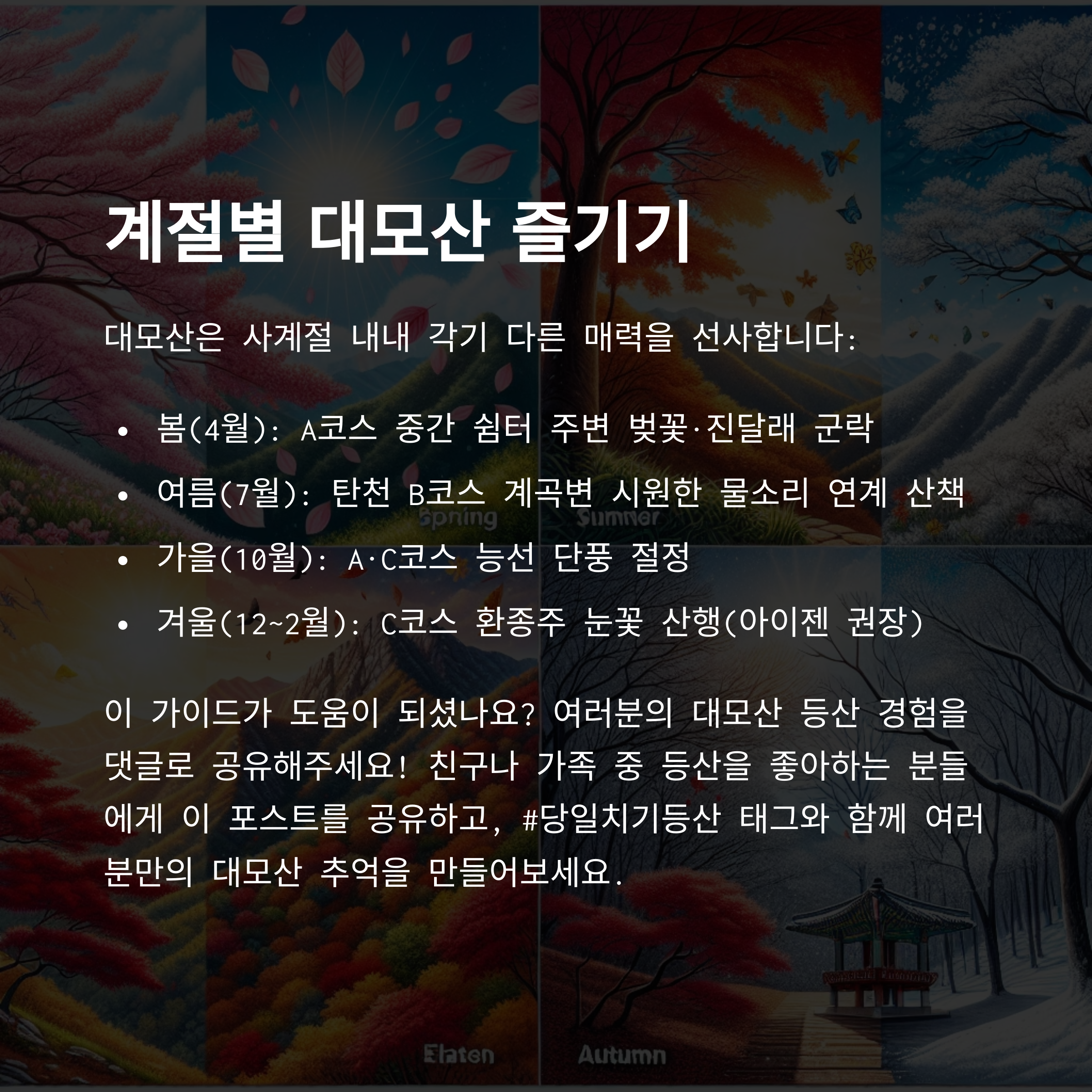 - 겨울(12~2월): C코스 환종주 눈꽃 산행(아이젠 권장)