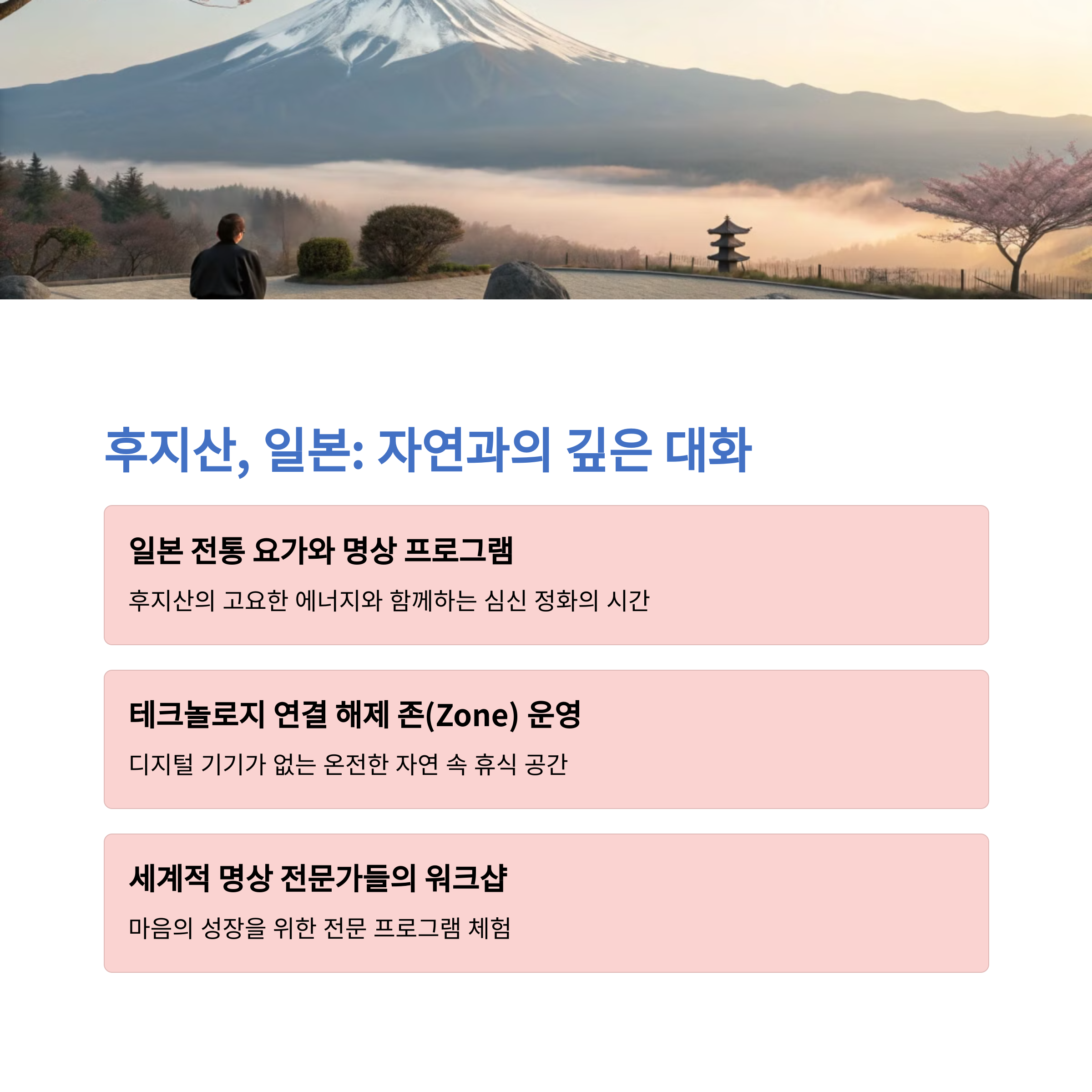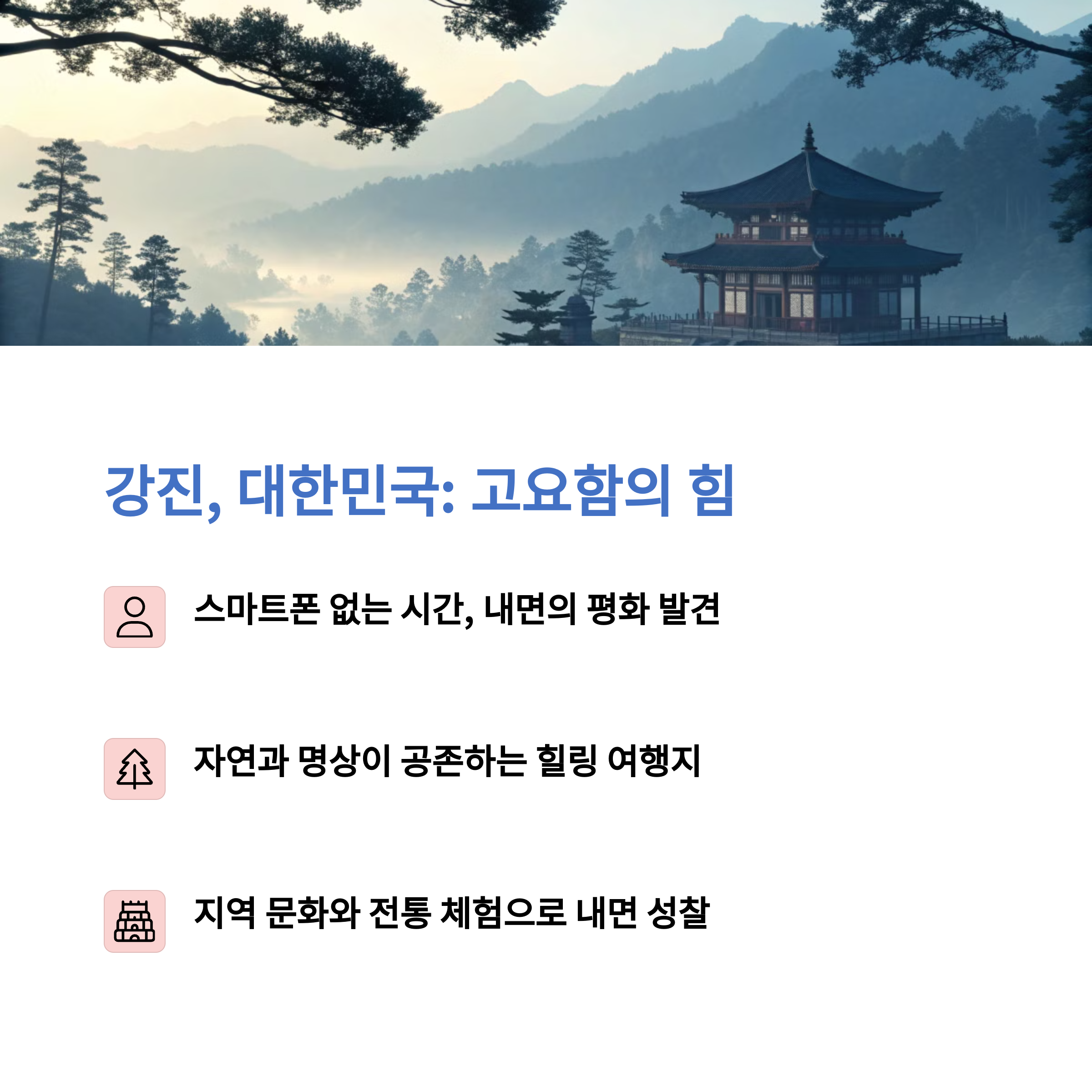 💡 여행 팁: 하루 일정은 책과 명상, 숲 산책으로 구성해보세요