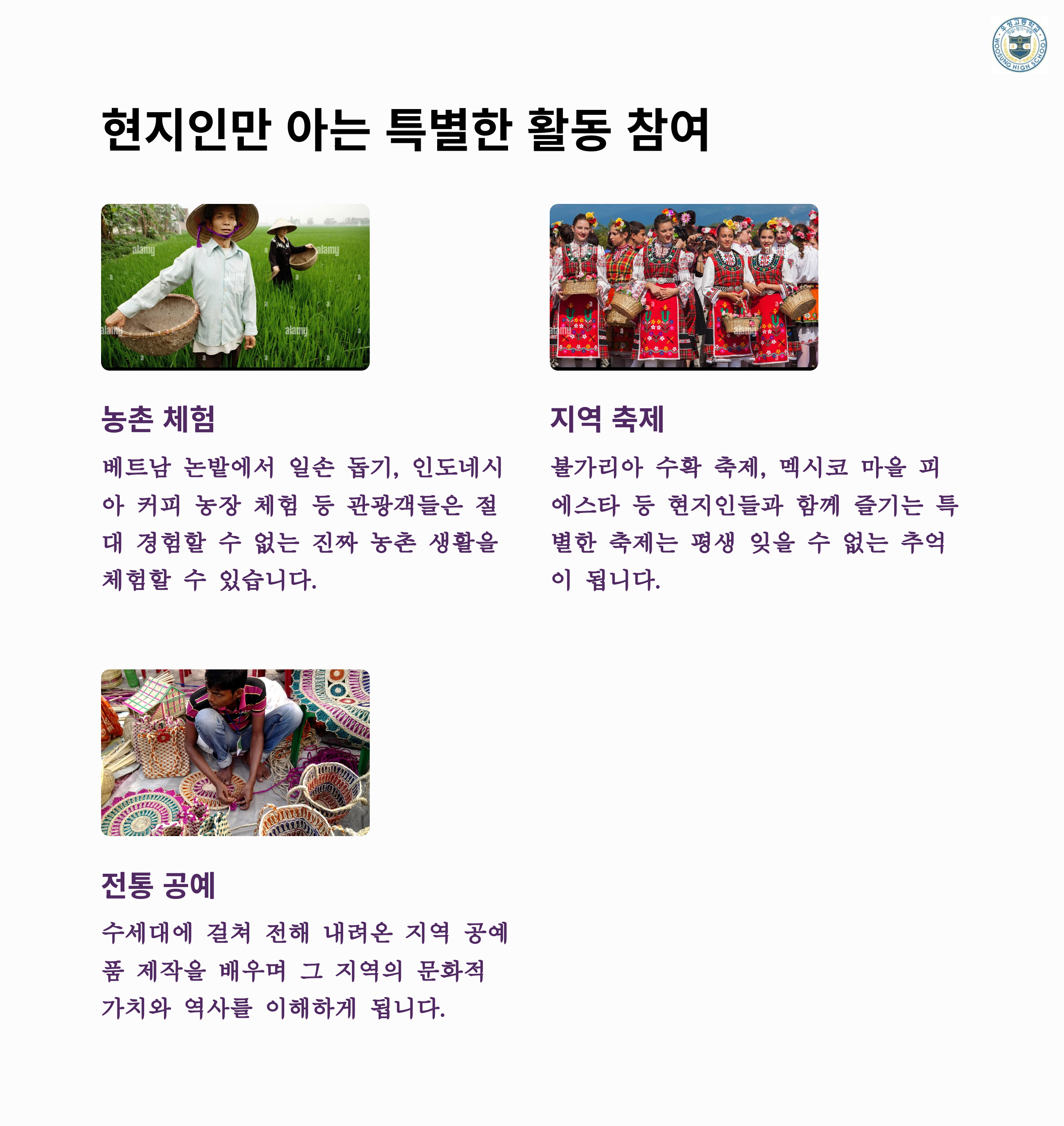 - 추천 활동: 지역 축제 참가, 농장 체험, 전통 공예 배우기