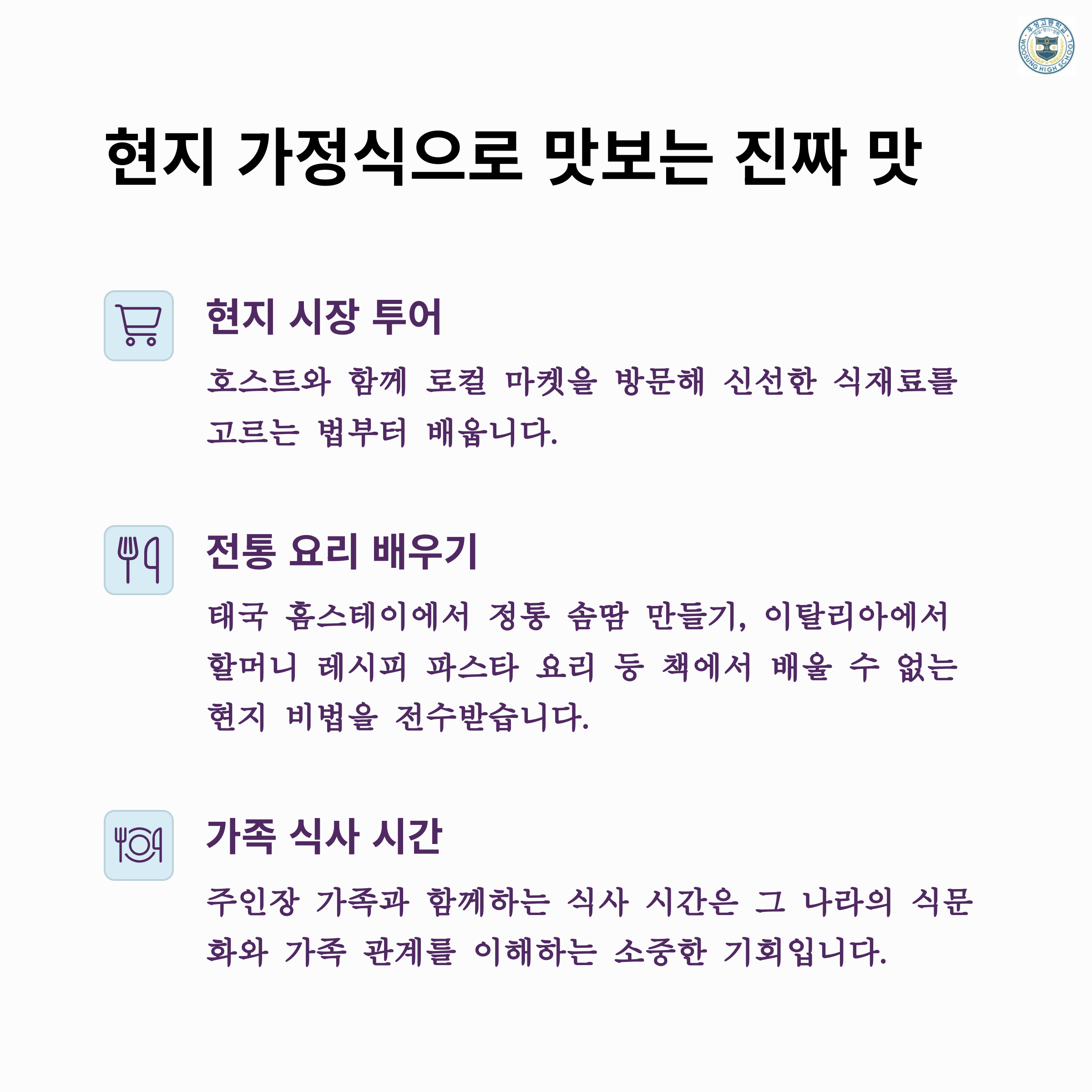 특히 집에서의 식사나 공동체 활동을 통해, 더 친근한 문화 체험을 할 수 있는 기회를 제공합니다.