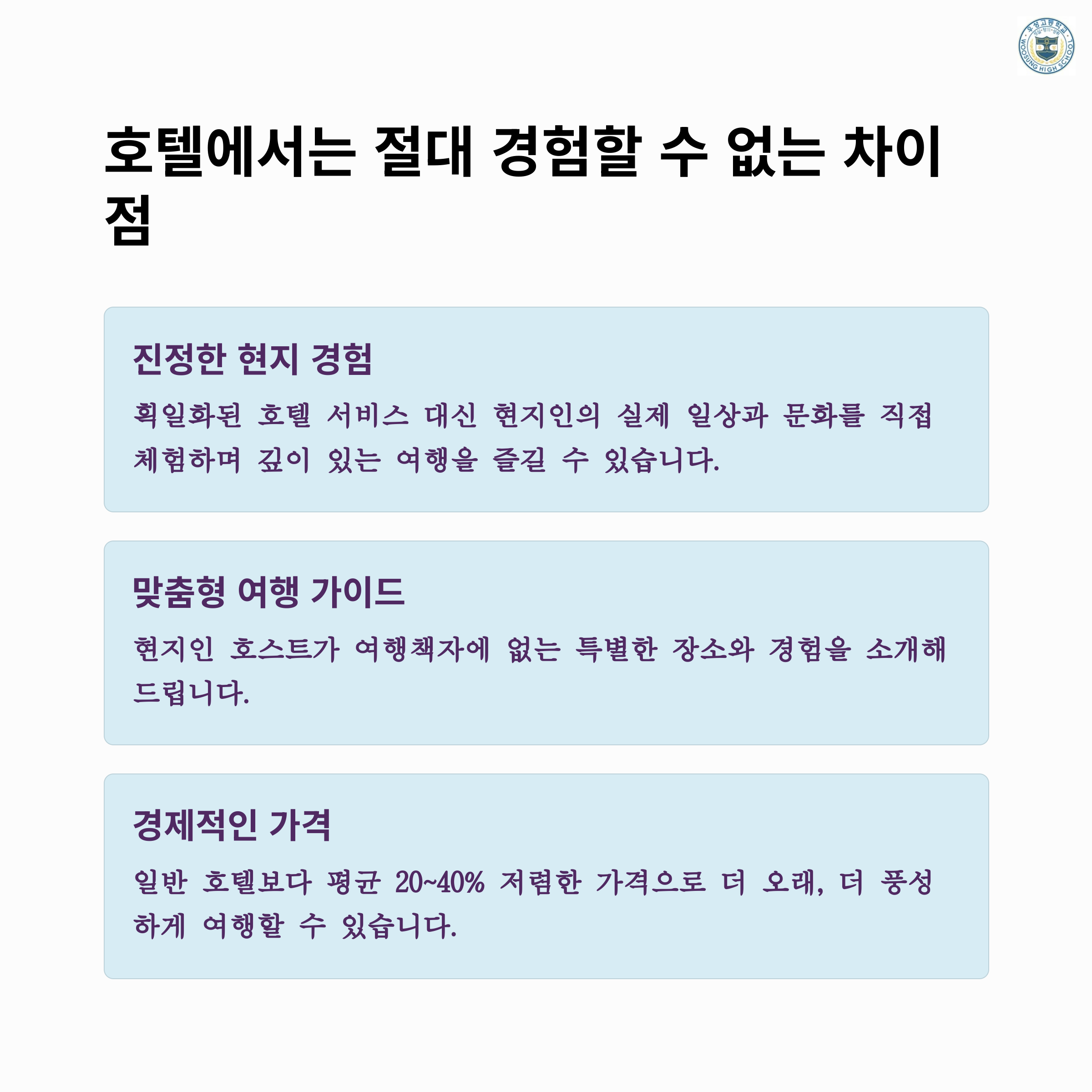 - 🏠 현지인과의 교류: 그 지역 사람들과 친밀하게 소통하며 여행의 깊이를 더하세요.