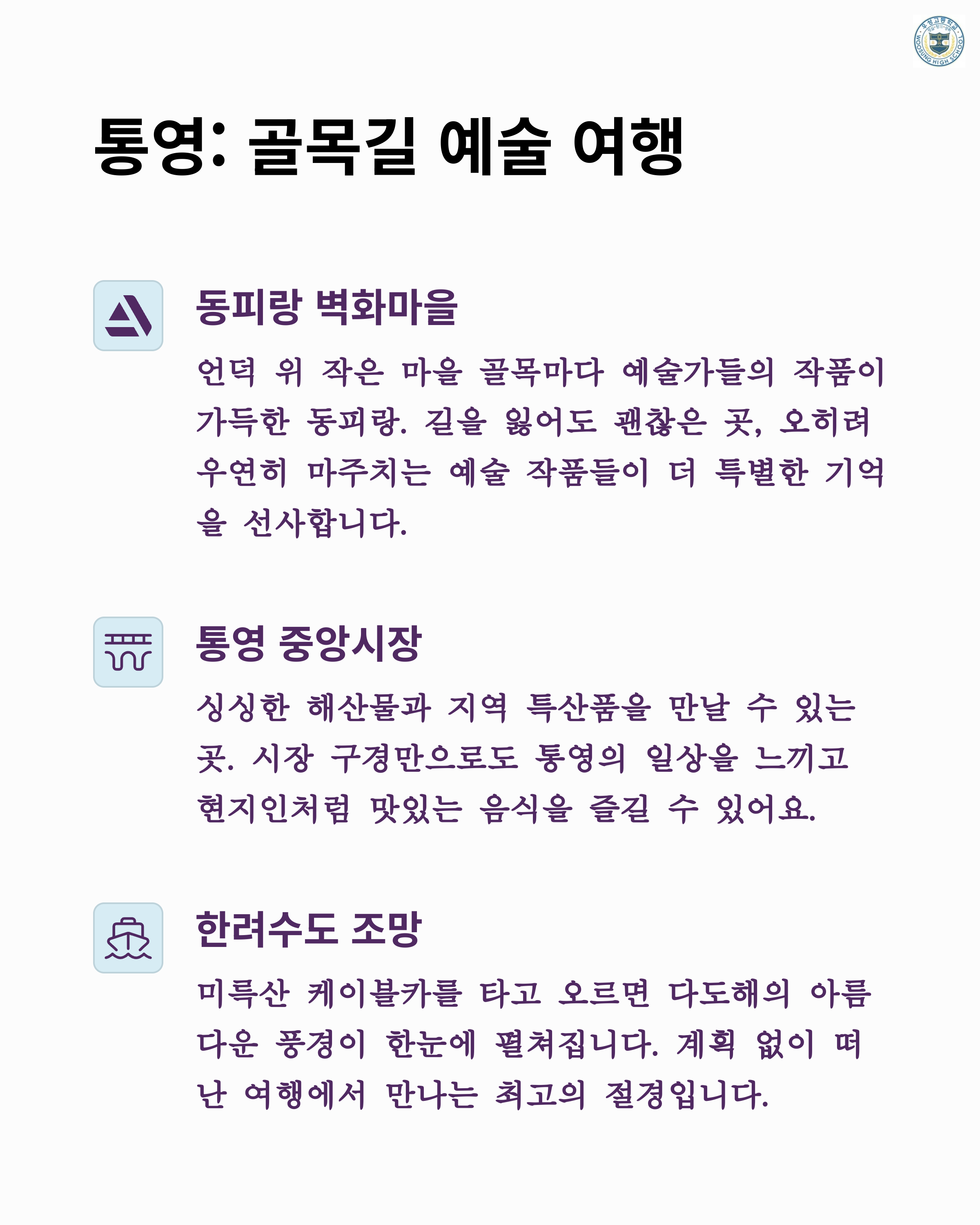 동피랑 벽화마을, 서호시장, 미륵산 케이블카 등 즉흥적으로 즐길 수 있는 곳들이 곳곳에 있음. - 🌟 추천 포인트: