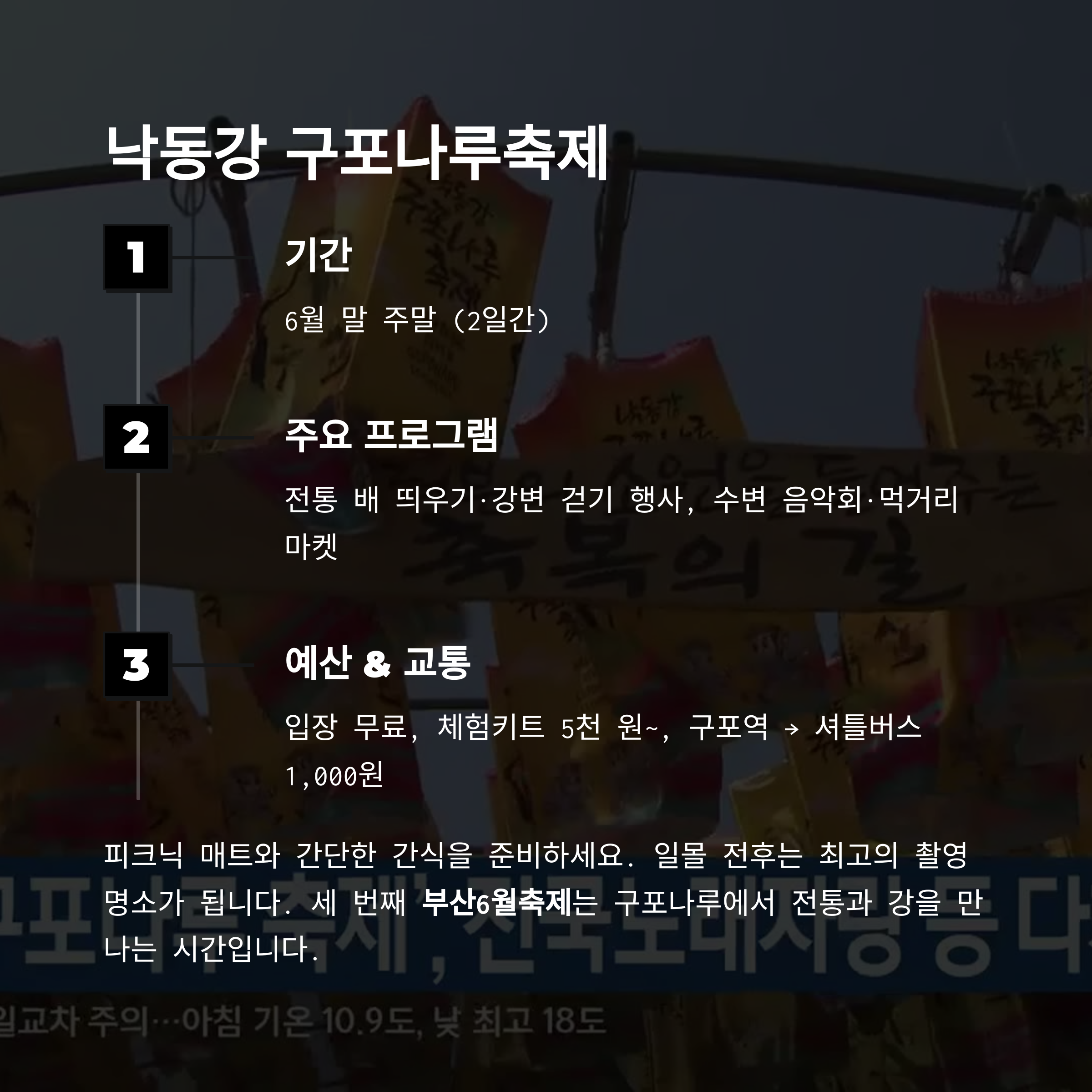 “세 번째 부산6월축제는 구포나루에서 전통과 강을 만나는 시간입니다.”