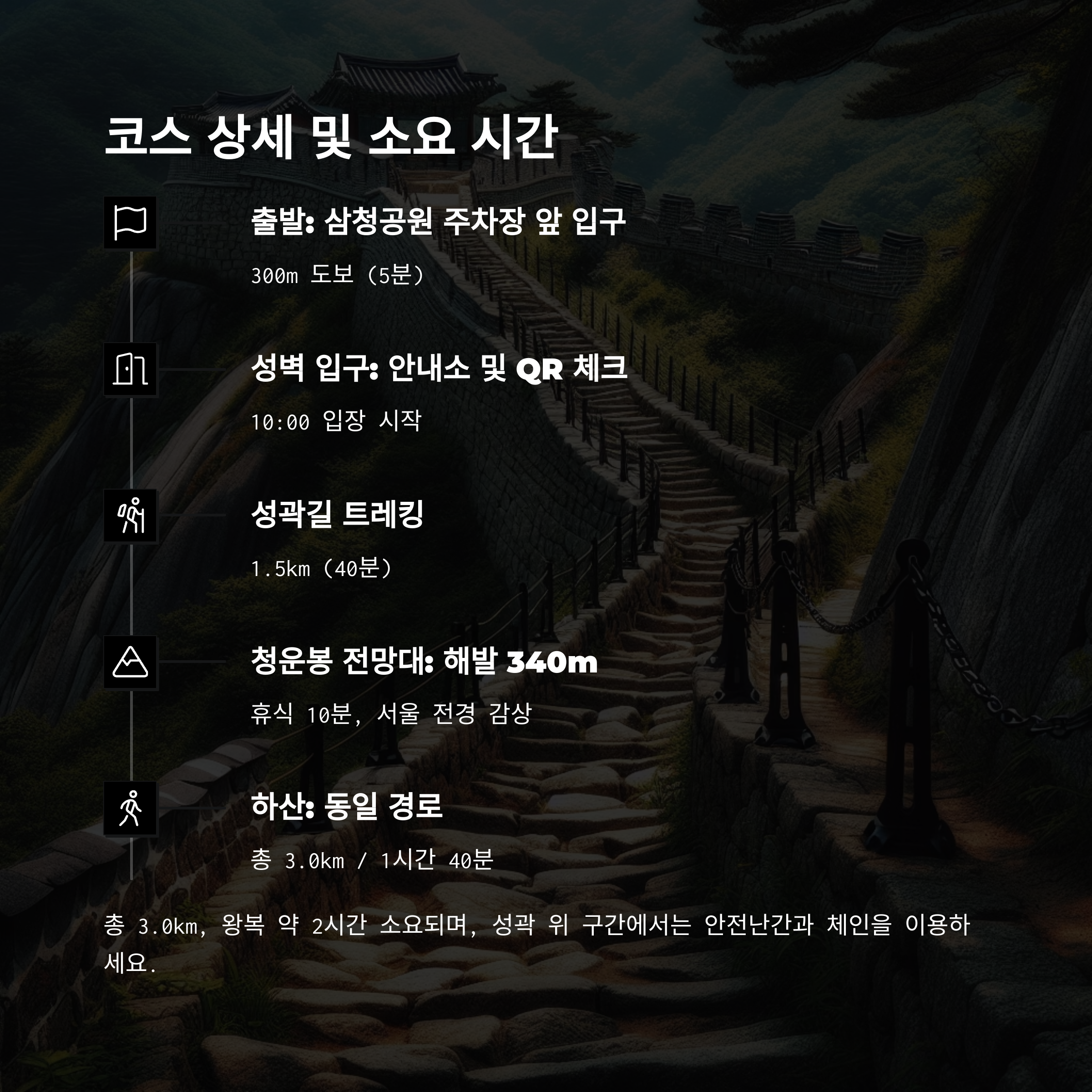 00m 도보 (5분)[성벽 입구] 안내소 및 QR 체크 (10:00)↓ 성곽길 1.5km (40분)[청운봉 전망대] 해발 340m ★ (휴식 10분)↓ 성곽길 1.5km (40분)[북악스카이웨이 합류점] (안내판)↓ 동일 경로 하산 (총 3.0km / 1시간 40분)