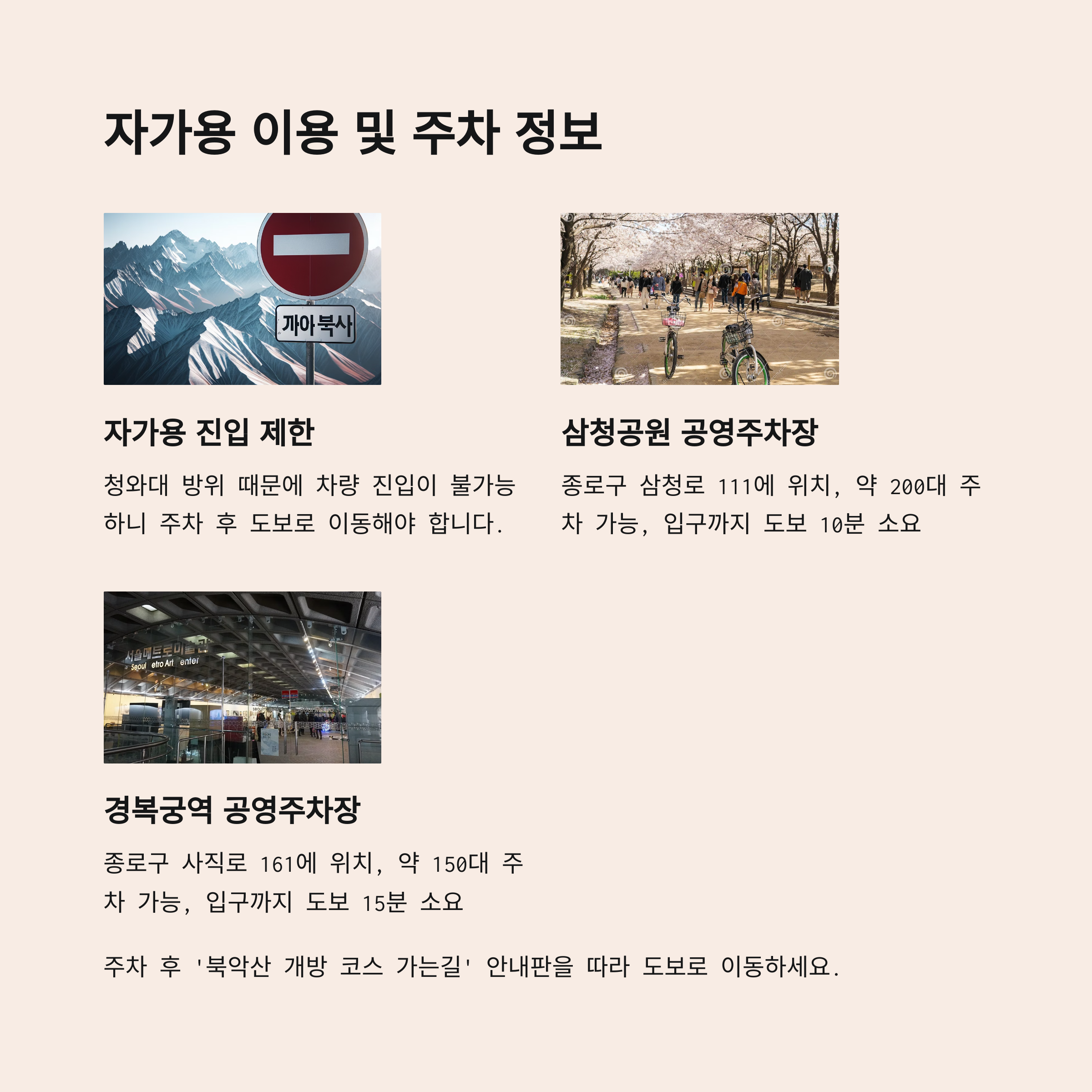 주차 후 ‘북악산 개방 코스 가는길’ 안내판을 따라 도보로 이동하세요.