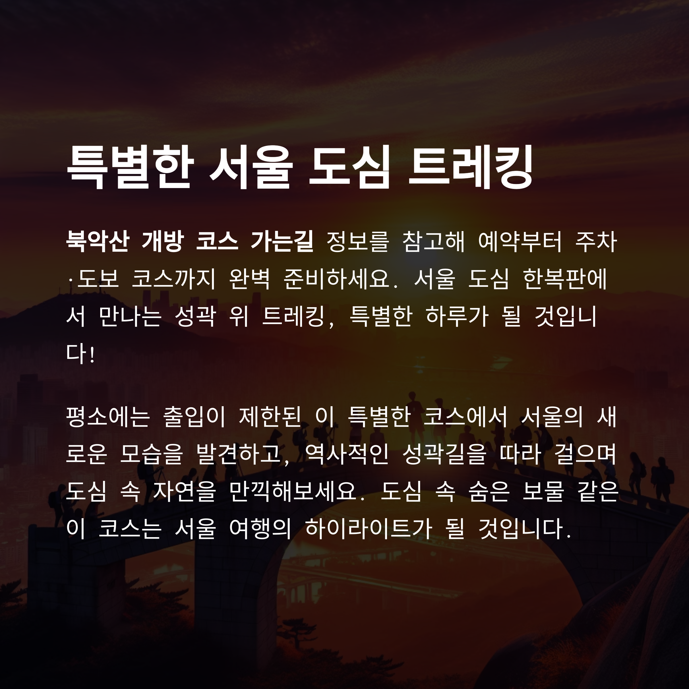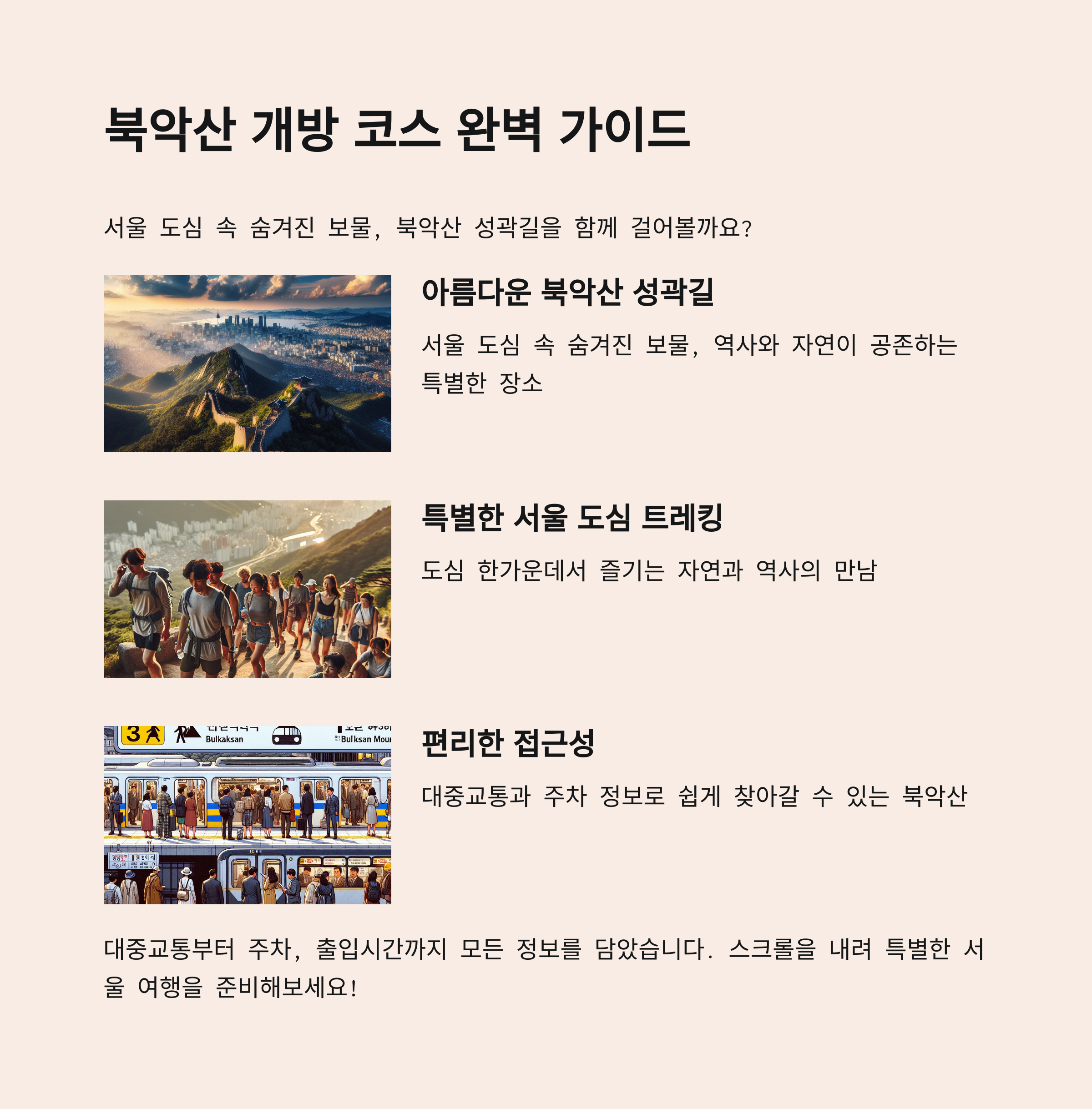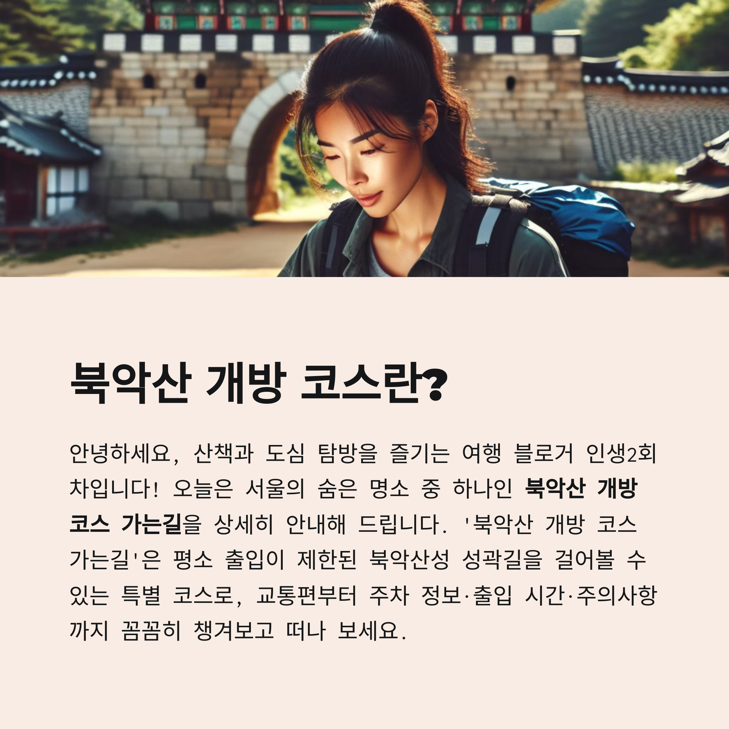 안녕하세요, 산책과 도심 탐방을 즐기는 여행 블로거 숲내음입니다! 오늘은 서울의 숨은 명소 중 하나인 북악산 개방 코스 가는길을 상세히 안내해 드립니다. ‘북악산 개방 코스 가는길’은 평소 출입이 제한된 북악산성 성곽길을 걸어볼 수 있는 특별 코스로, 교통편부터 주차 정보·출입 시간·주의사항까지 꼼꼼히 챙겨보고 떠나 보세요.