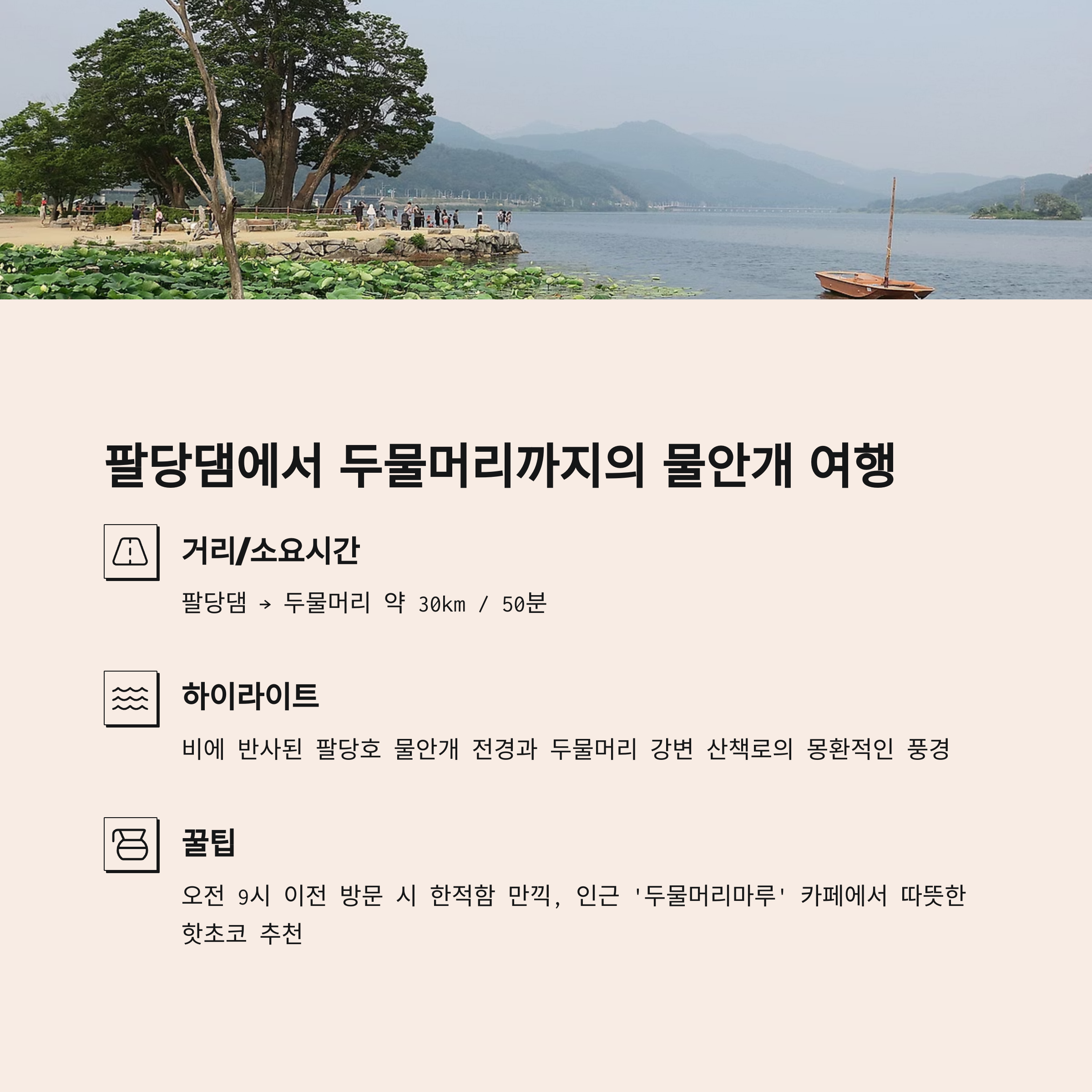 - 거리/소요시간: 팔당댐 → 두물머리 약 30km / 50분