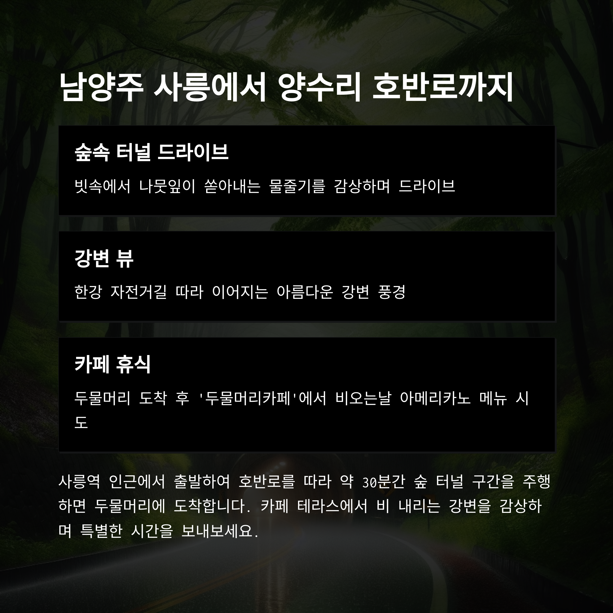 “두 번째 비오는날드라이브 명소로 사릉-양수리 호반로를 추천합니다.”