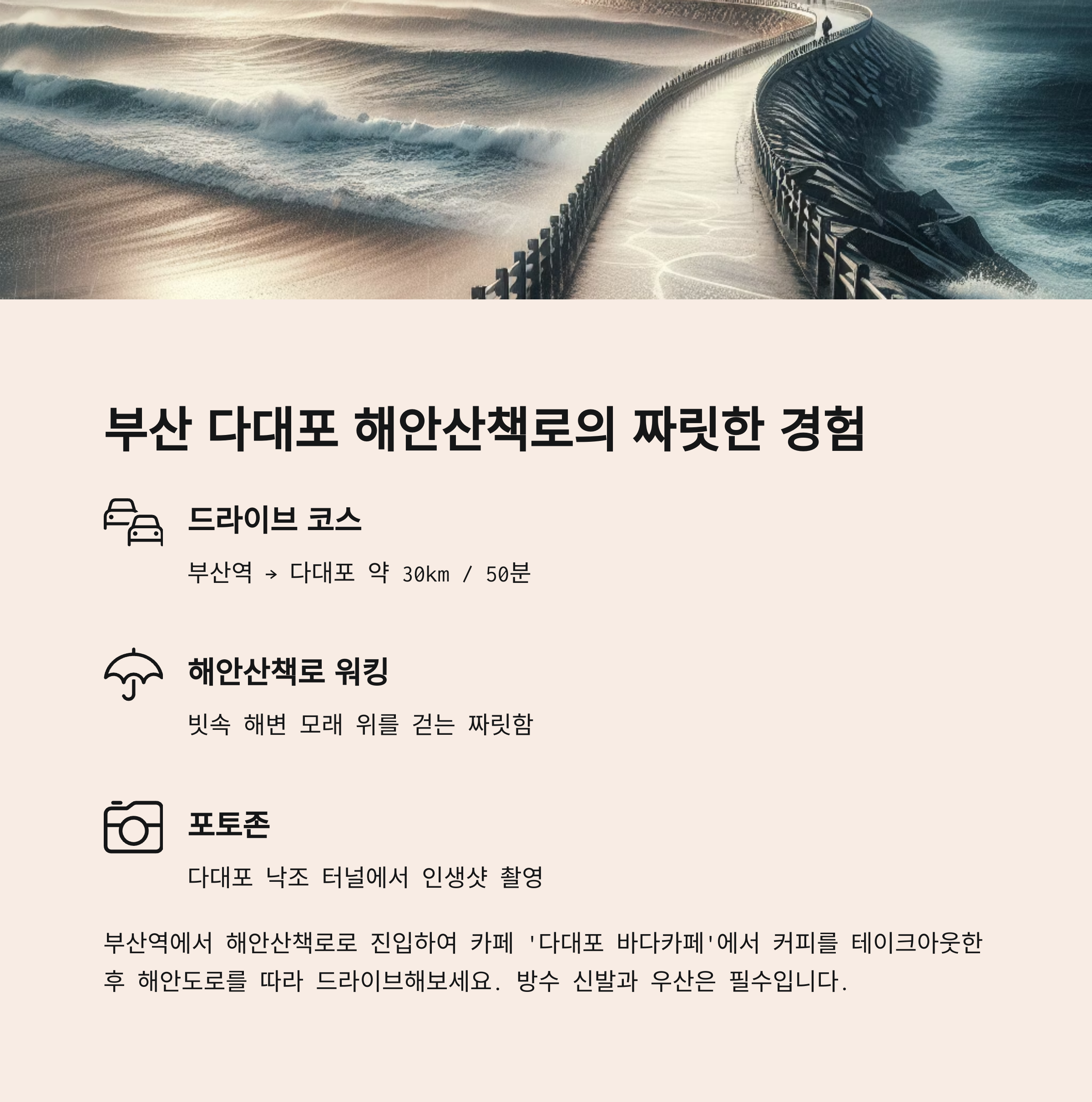 - “여섯 번째 비오는날드라이브 명소는 부산 다대포 해안산책로입니다.”