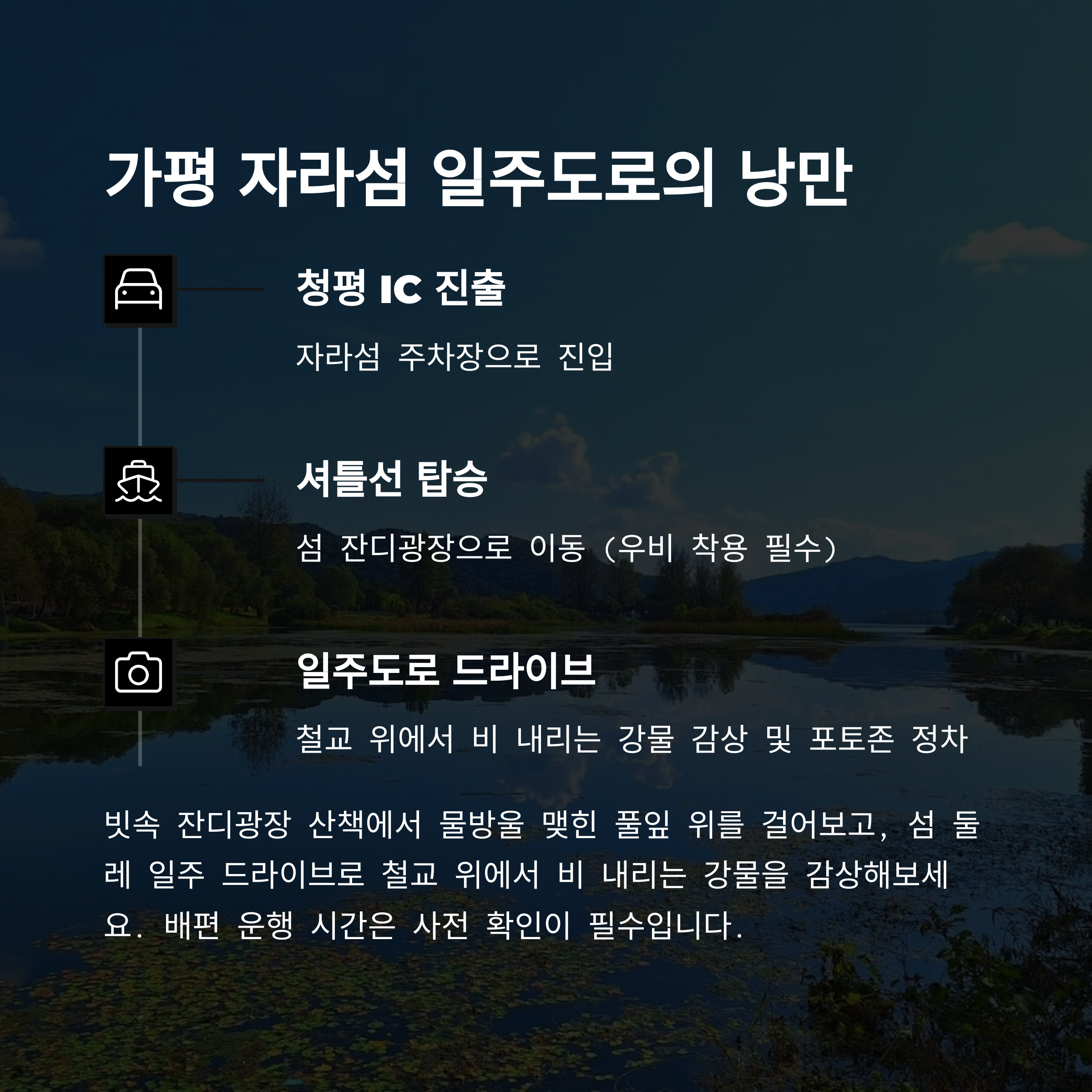 - 거리/소요시간: 청평 IC → 자라섬 약 45km / 1시간 10분