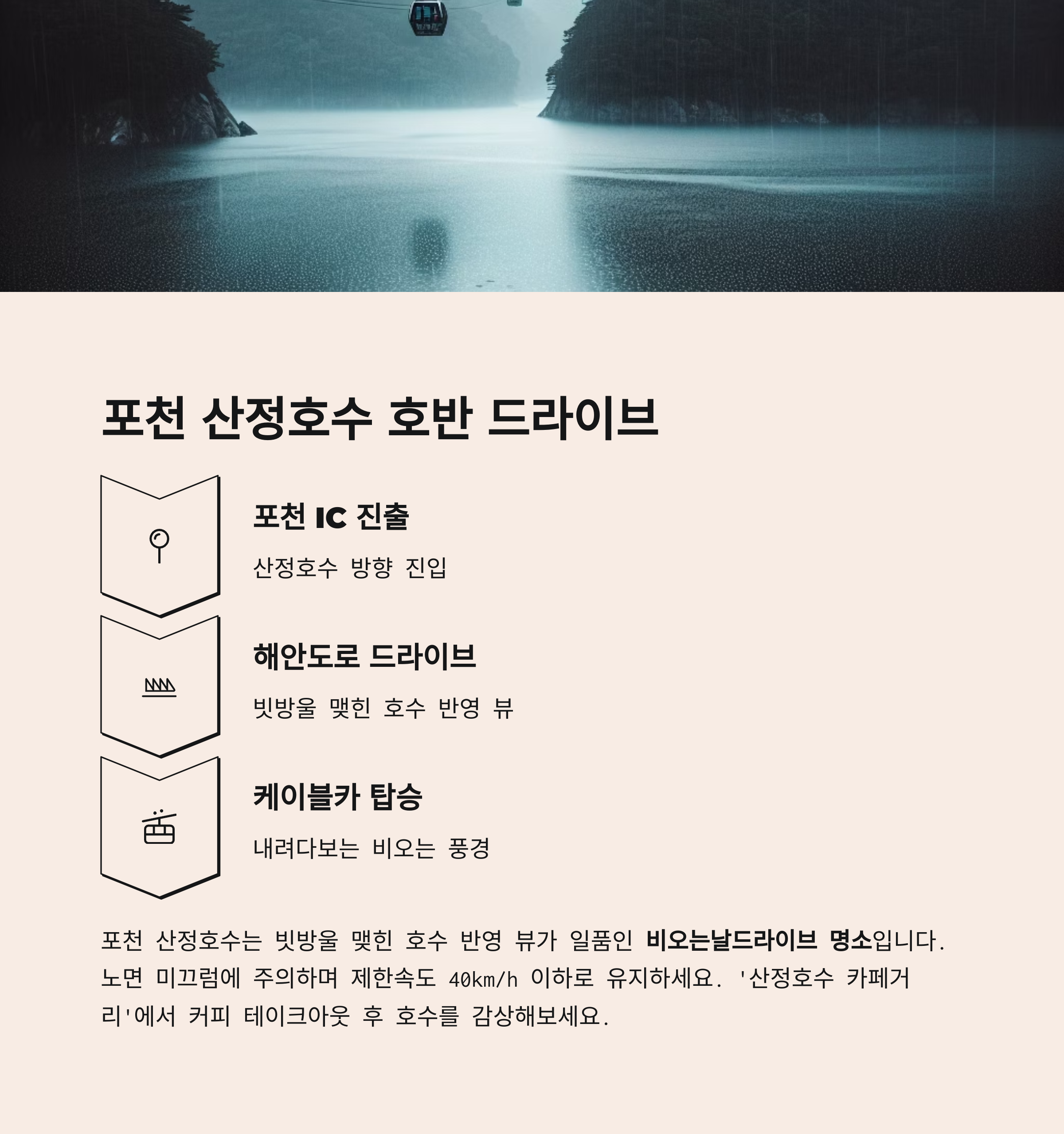 - “네 번째 비오는날드라이브 명소는 포천 산정호수입니다.”