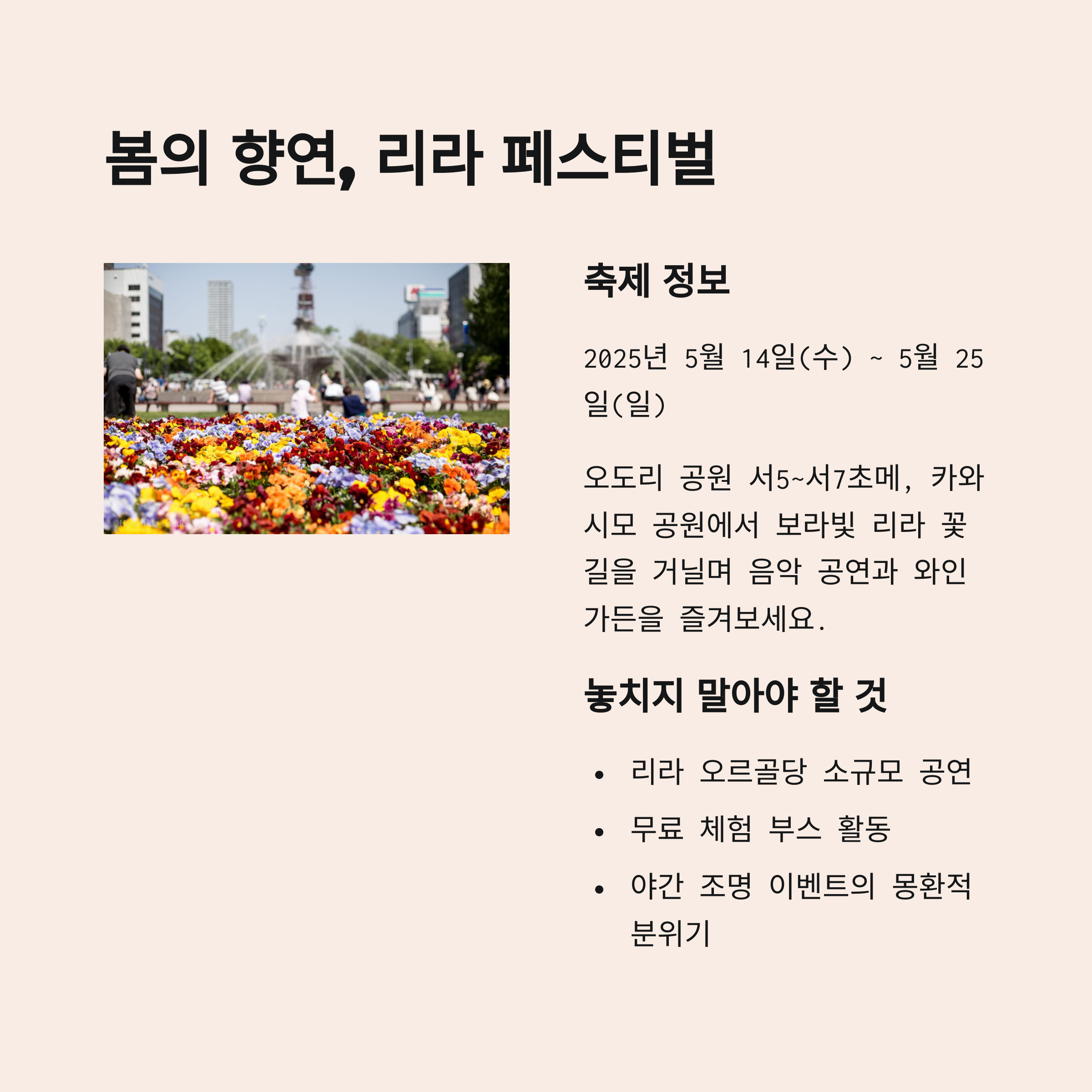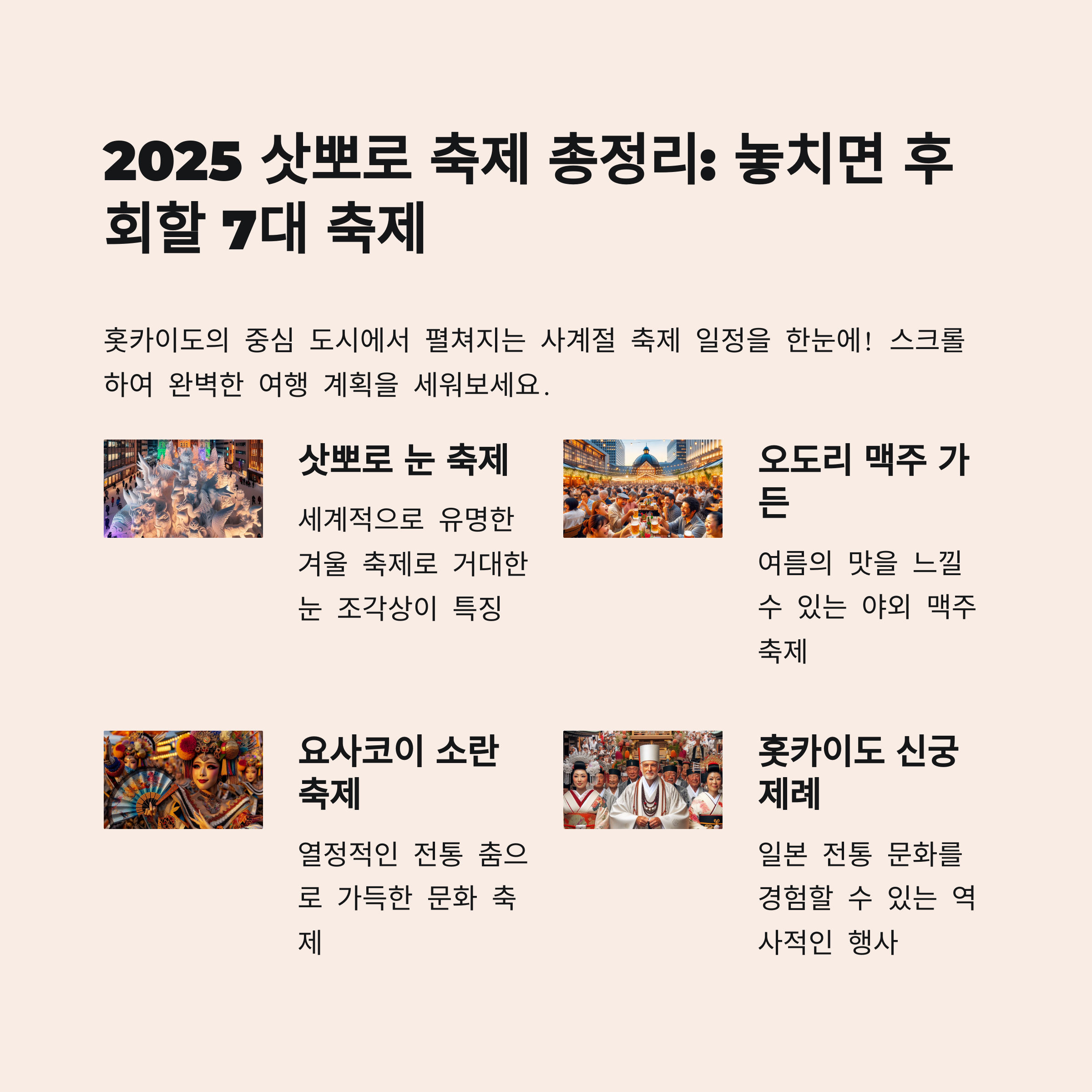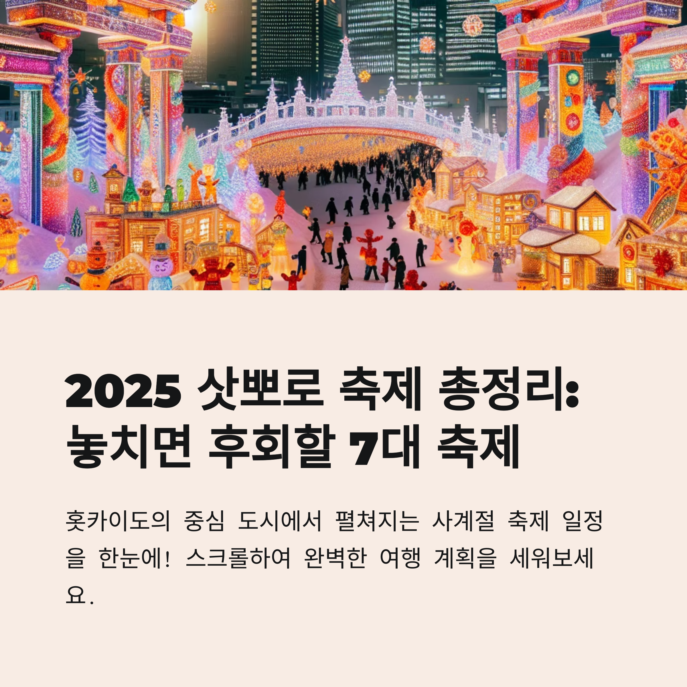 홋카이도의 중심 도시 삿뽀로에서는 사계절 내내 다채로운 축제가 펼쳐집니다. 겨울의 삿포로 눈 축제, 봄의 리라 페스티벌, 여름의 요사코이 소란 축제와 오도리 맥주 가든, 전통이 살아 숨 쉬는 신궁 제례까지, 2025년 삿뽀로 축제 일정을 미리 알아두면 완벽한 여행 스케줄을 짤 수 있습니다. 공휴일·주말을 활용한 알짜배기 꿀팁도 함께 확인하세요!