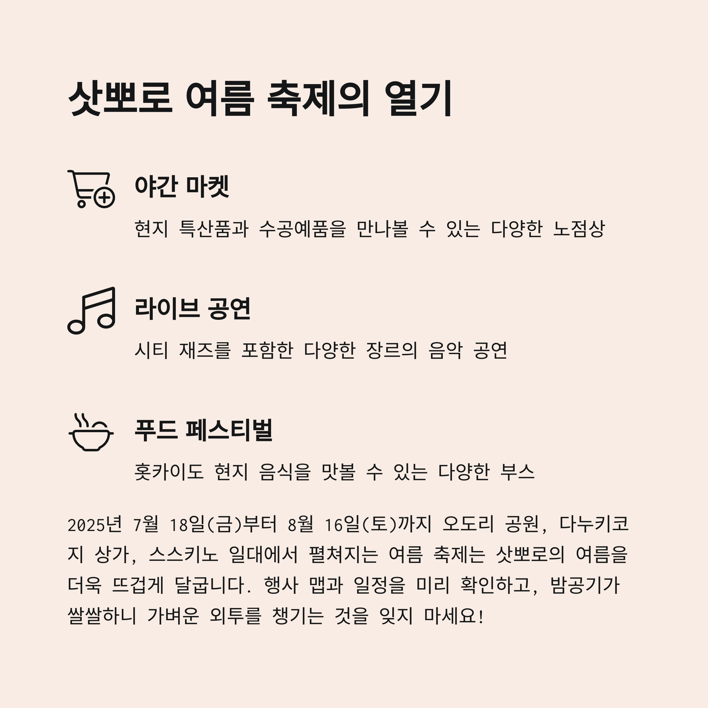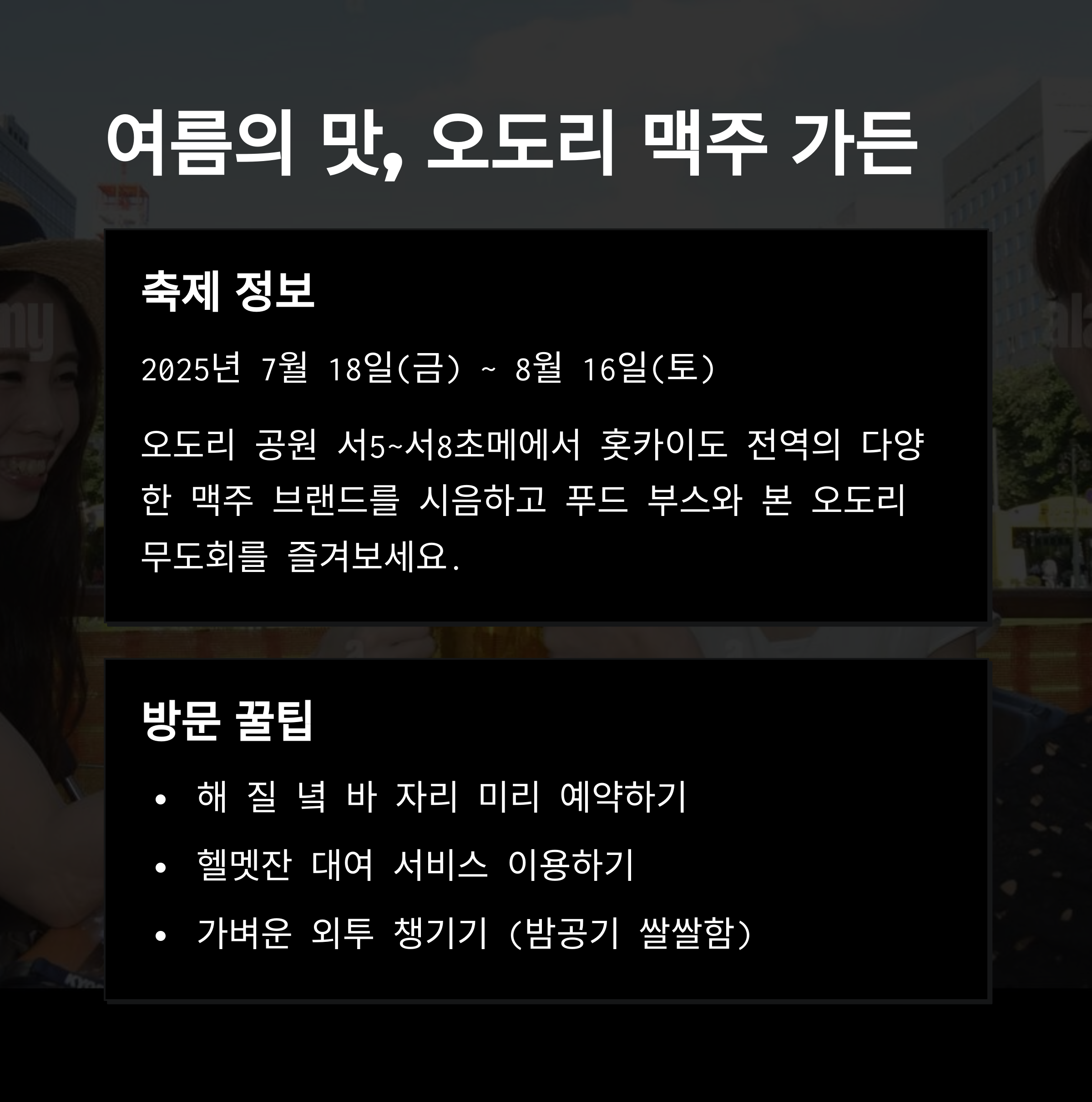 - 내용: 홋카이도 전역 맥주 브랜드 시음·푸드 부스·본 오도리 무도회